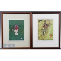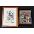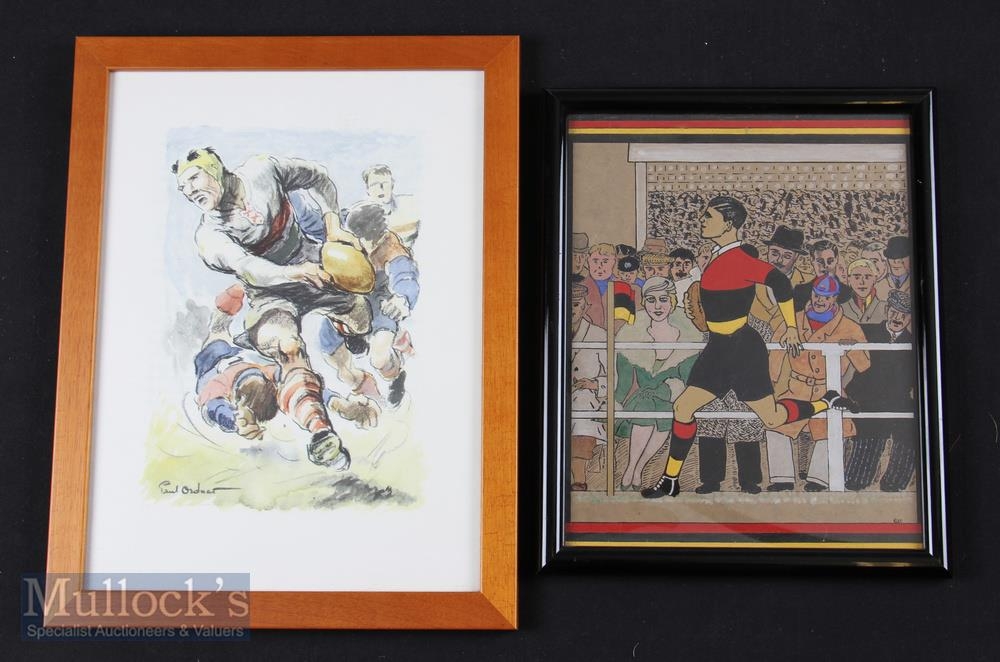 Mid-20th century Framed Rugby Pictures (2): A typically thrilling, action-packed colourful Paul Ordner French rugby drawing, all muscles & movement from 1961; and a contrasting, amateur but appealing, brightly coloured image of a Richmond (?) player running in front of a stand where all the spectators are carefully drawn (personally known?). A note suggests 1936 and a player who was about to emigrate to South Africa. Intriguing and excellent