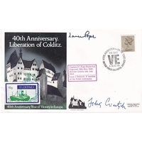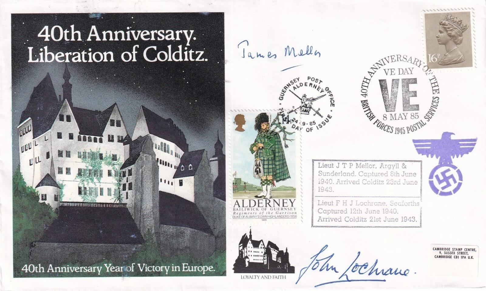 40th Anniv Of Liberation of Colditz signed by 2 inmates J Mellor and F Lochrane. 8 May 85 BFPS 1945 VE Day Special postmark. Special 40th Anniversary Of Liberation of Colditz cover. Cover depicts Colditz Castle. Colditz Castle was where the Germans hold troublesome and highly prized prisoners of the Allied Officers in WW2. Only 4 successful escapes were made, the first on 5th January 1942 by Lt Col Neave R E and Lt Luteyn Dutch Army, on 11 June 1942 by Sqn Ldr Padden, on the 9th January 1942 3 British and 3 Dutch Officers escaped but only Flt Lt Fowler and Lt Cdr van Doornick, Dutch Navy reach safety and on and on 15th October 1942 by Maj Littledate K R R C, Maj Reid RASC, Lt Cdr Stephens RNVR and Flt Lt Wardle RAF. Personally Signed by Lieut J T P Mellor Argyll and Sunderland Captured 8th June 1940 Arrived Colditz 123rd June 1943. And Lieut F H J Lochrane Seaforths Captured 12th June 1940 arrived in Colditz 21st June 1943. Certified Copy No 24 of 50. 3 flown backstamp cachets and carried cachet. Good condition. All autographs come with a Certificate of Authenticity. We combine postage on multiple winning lots and can ship worldwide. UK postage from £5.99, EU from £7.99, Rest of World from £9.99