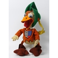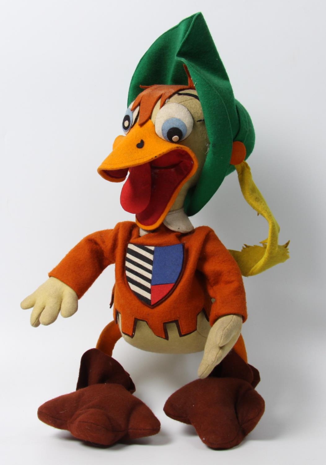 A novelty felt duck dressed as a Muskateer, felt blue eyes, large orange beak, wearing a green Muskateer hat with a yellow feather, standing upright wearing brown boots, probably produced by Lenci, 1960's 44.5cm tall