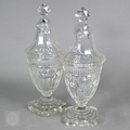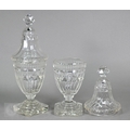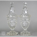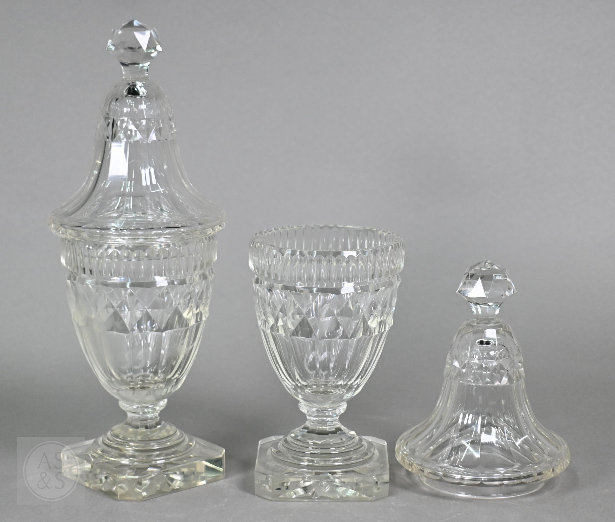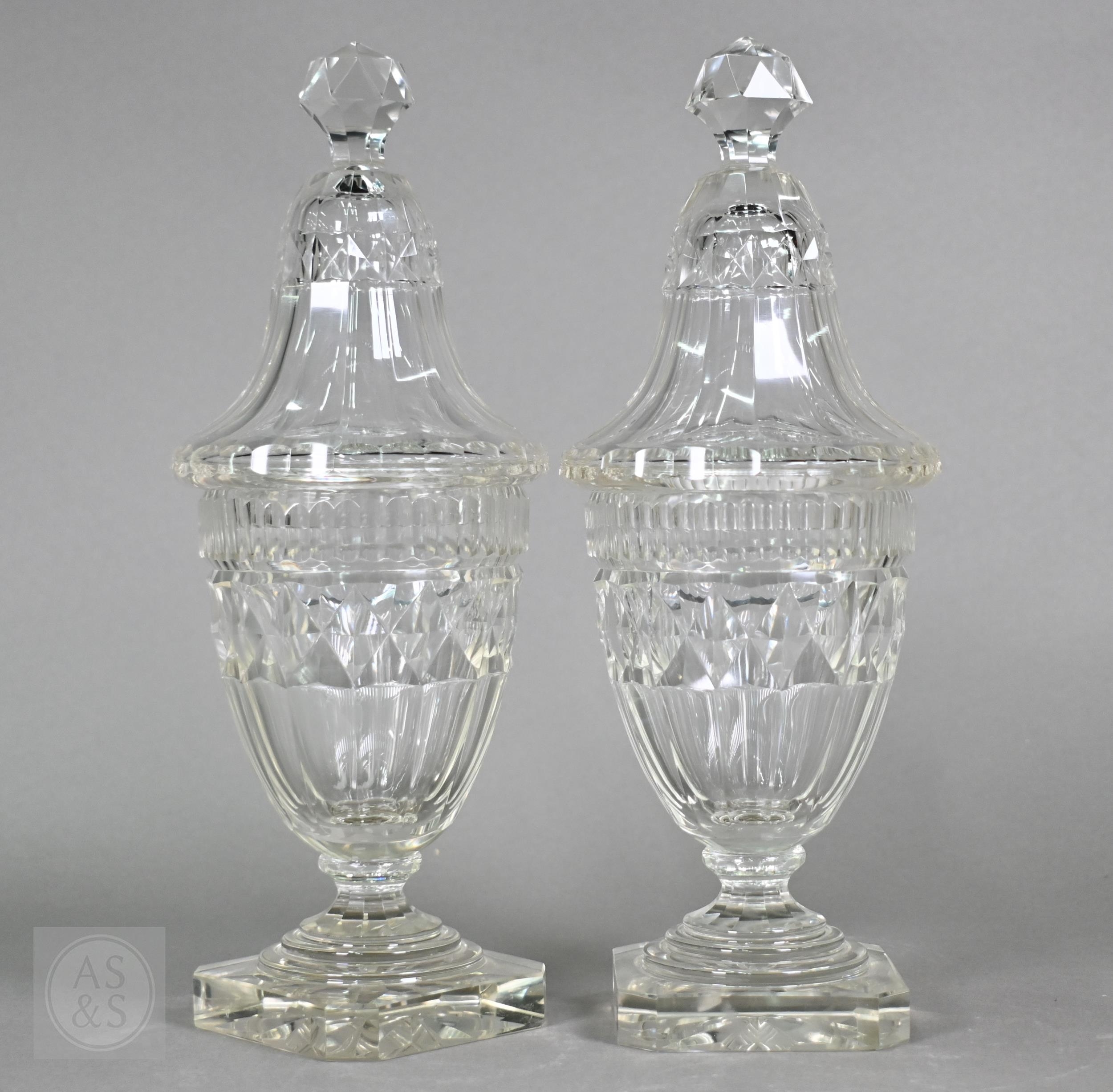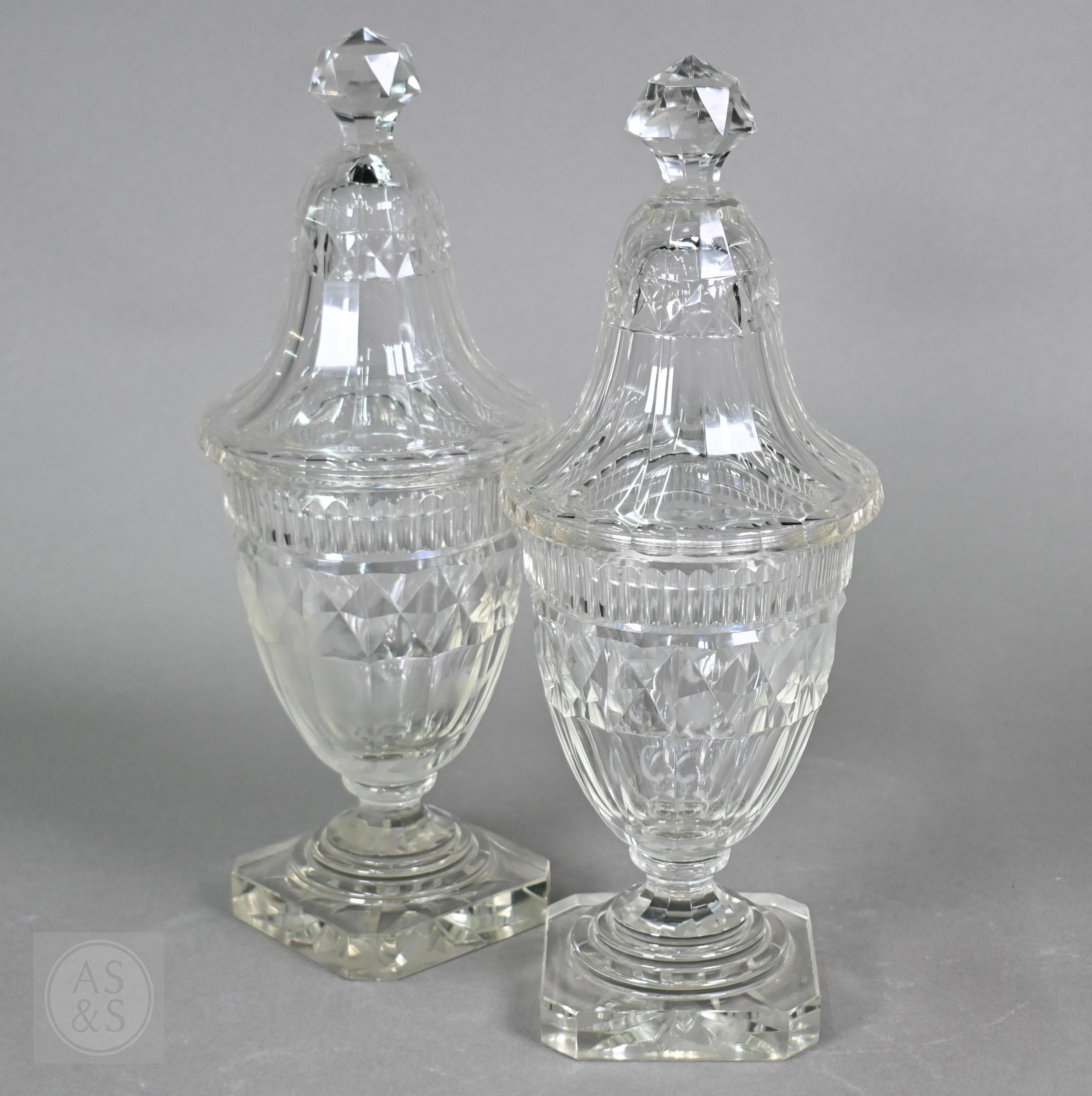 A pair of early 19th century cut glass sweetmeat jars and covers with facetted finials, on star-cut square bases with chamfered corners, 30.5 cm high