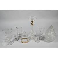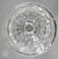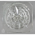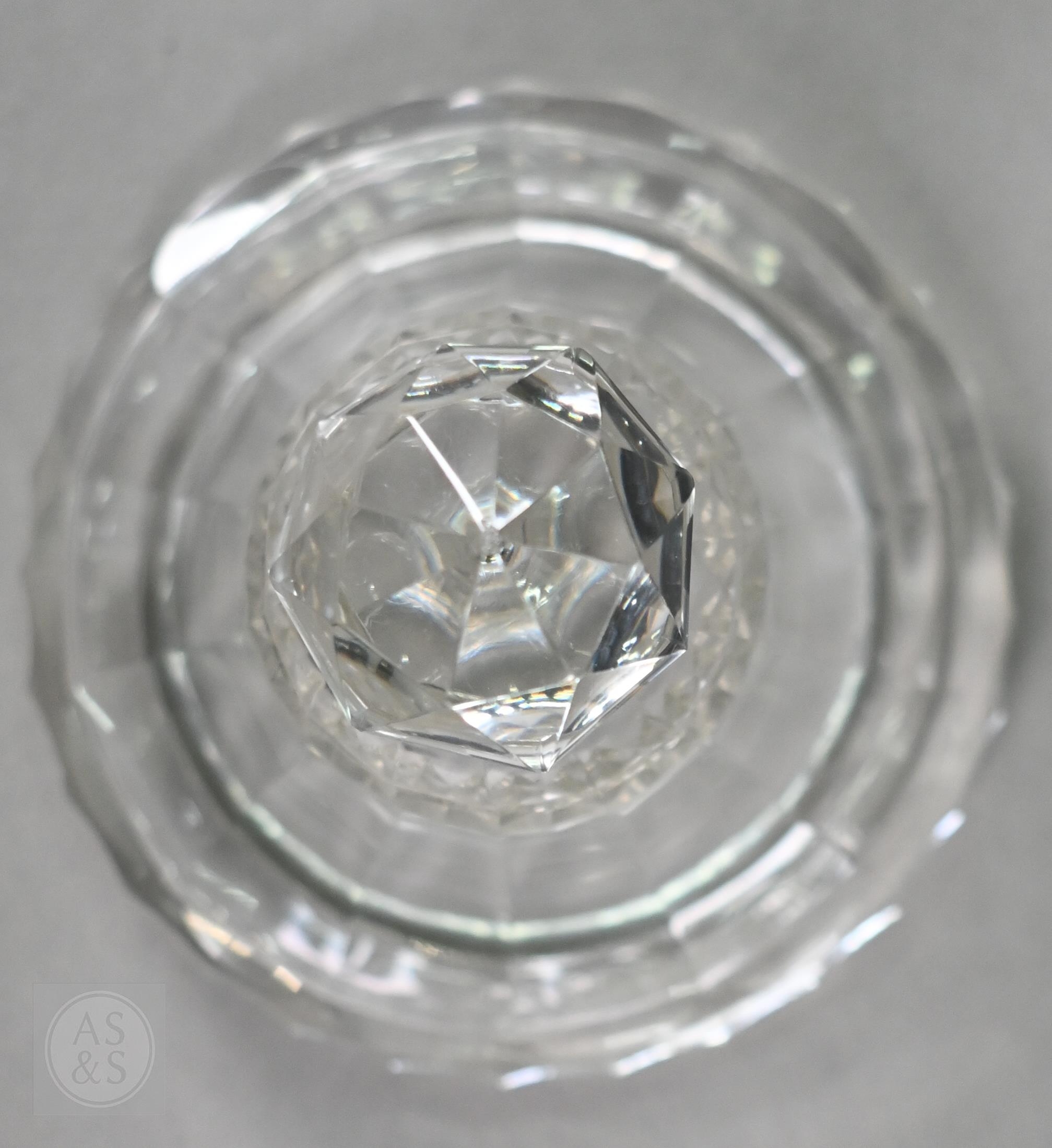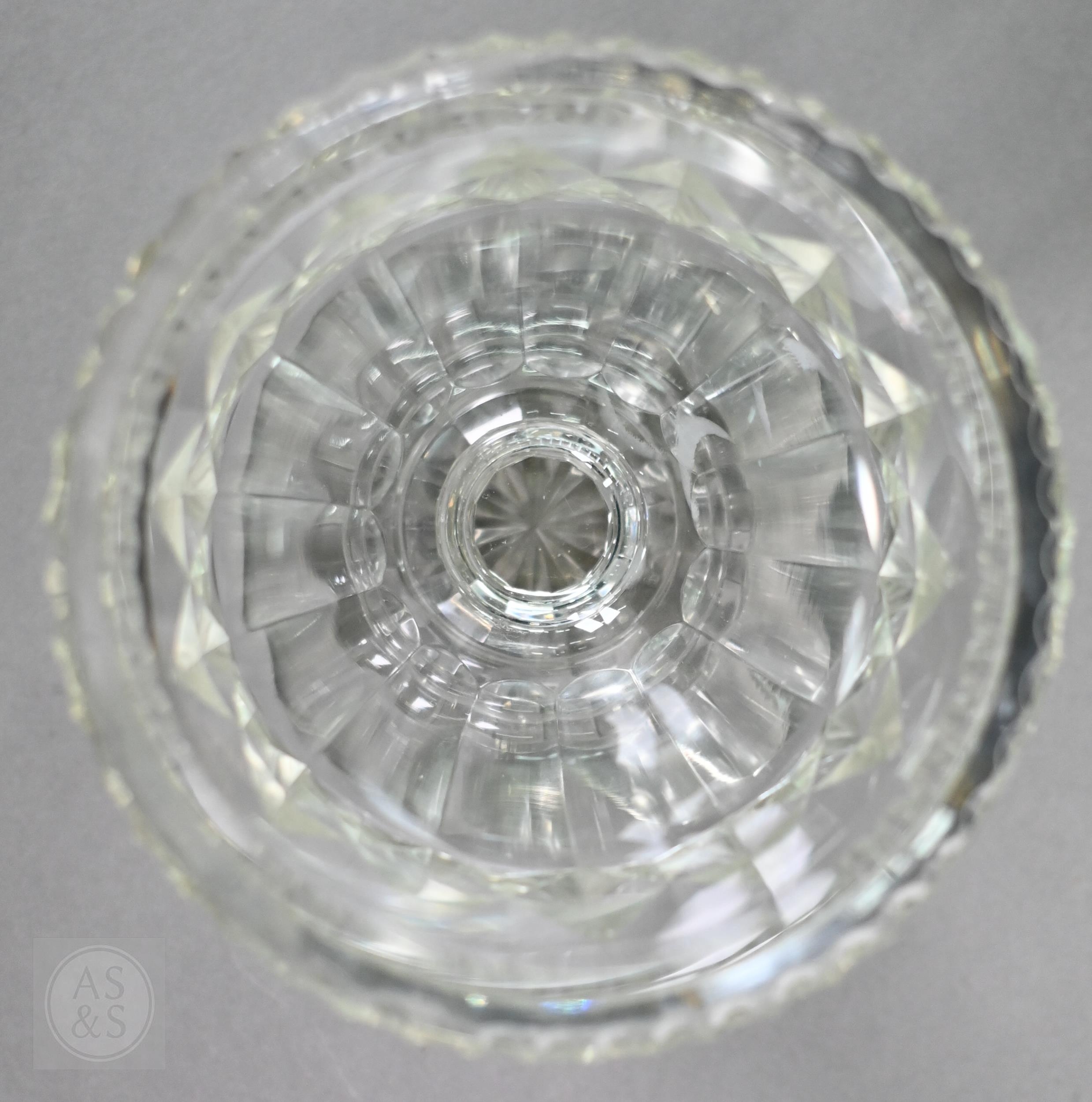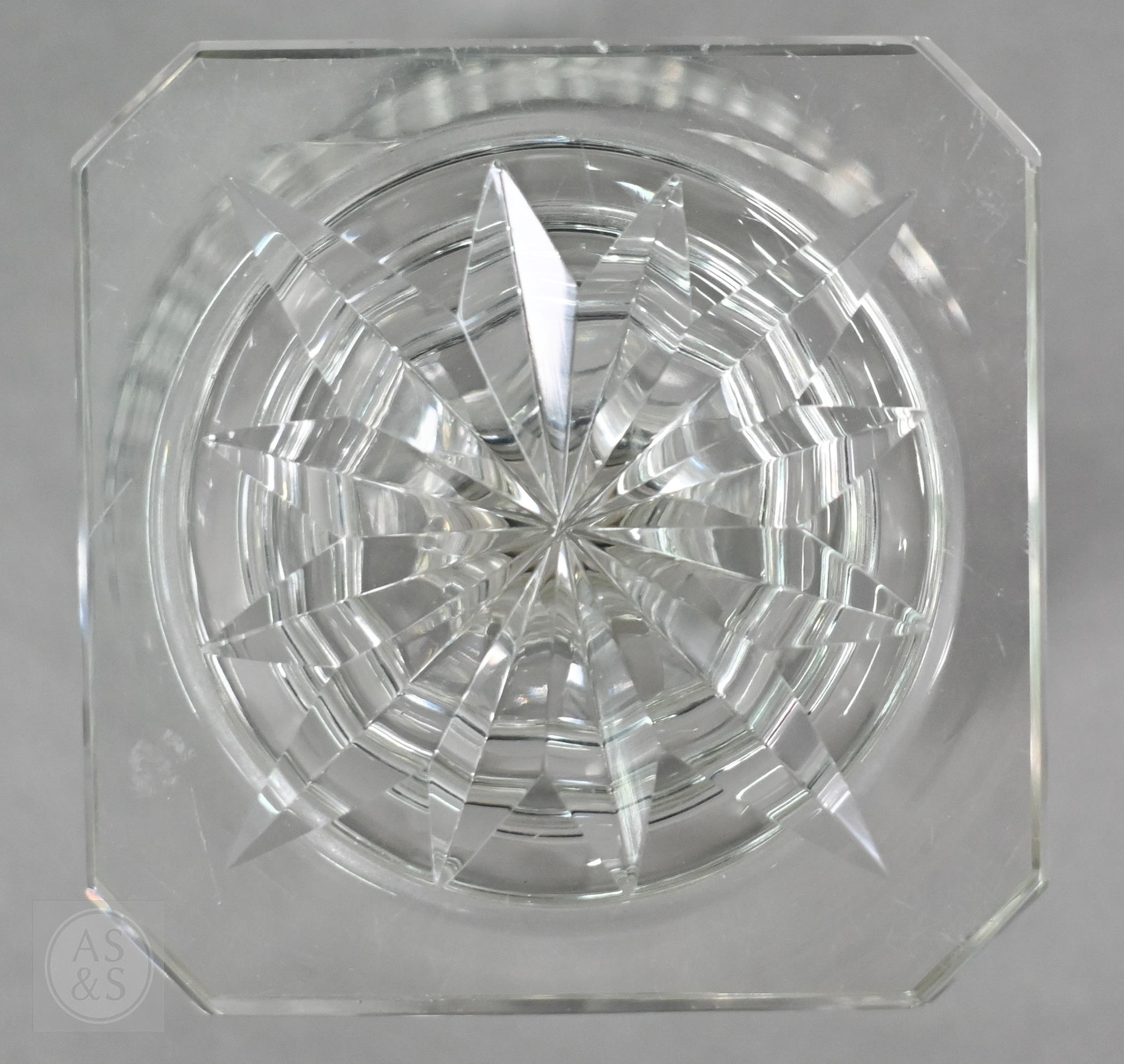 A pair of early 19th century cut glass sweetmeat jars and covers with facetted finials, on star-cut square bases with chamfered corners, 30.5 cm high