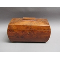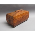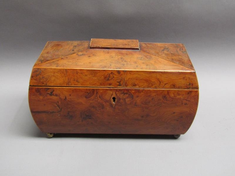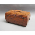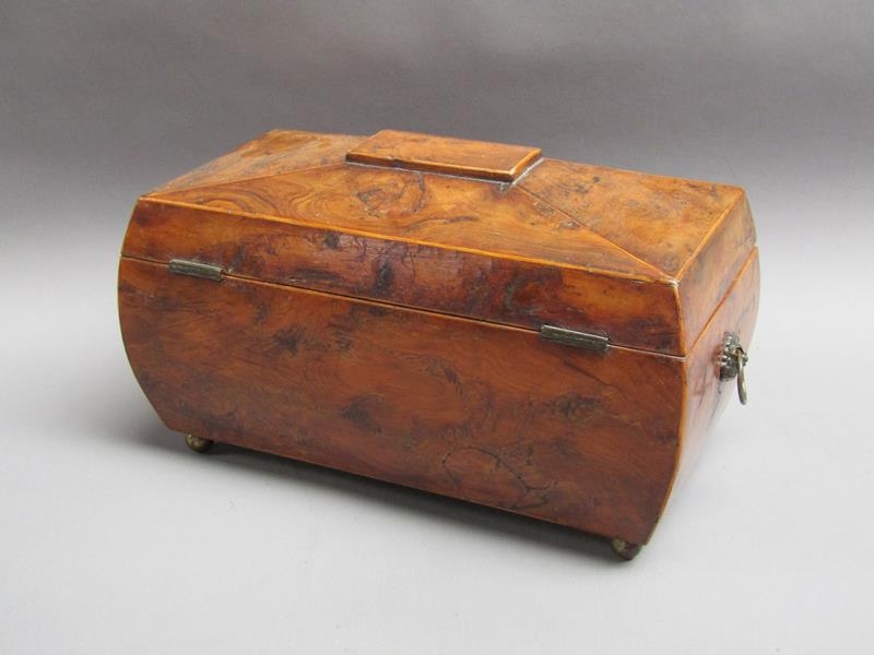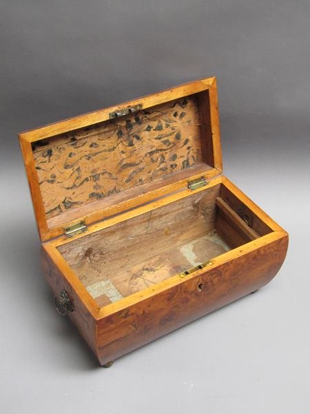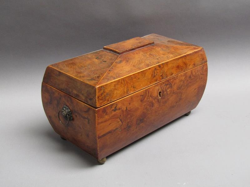A late Georgian burr walnut veneered caddy box of bombe form with lion mask ring pull side handles and supported on brass ball feet - no interior, 32cm w, 19cm h.