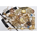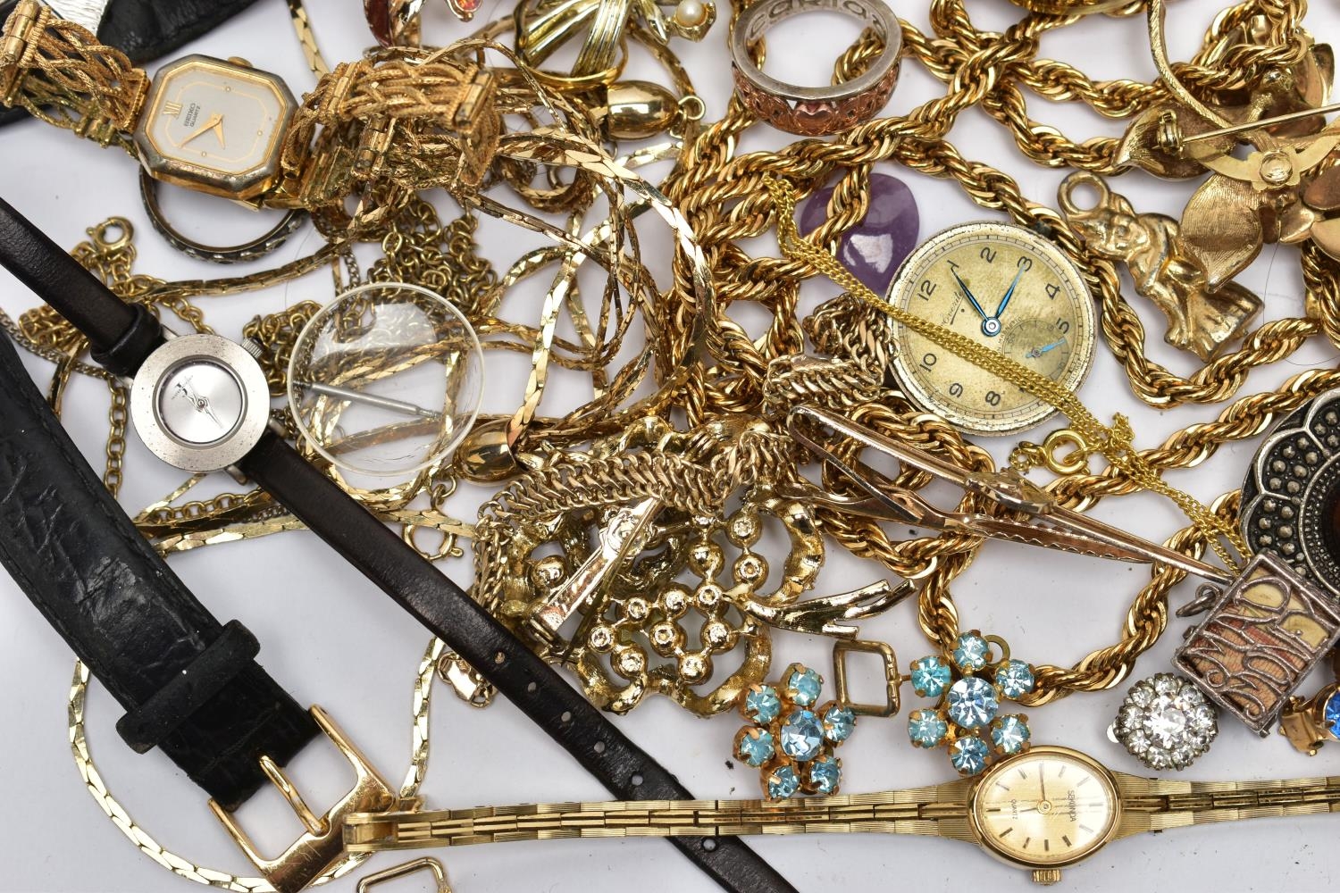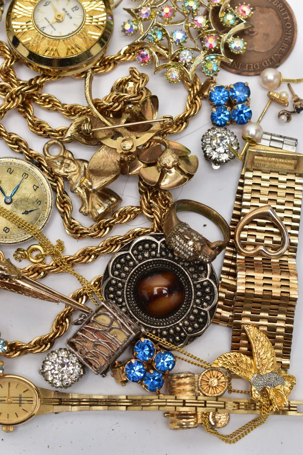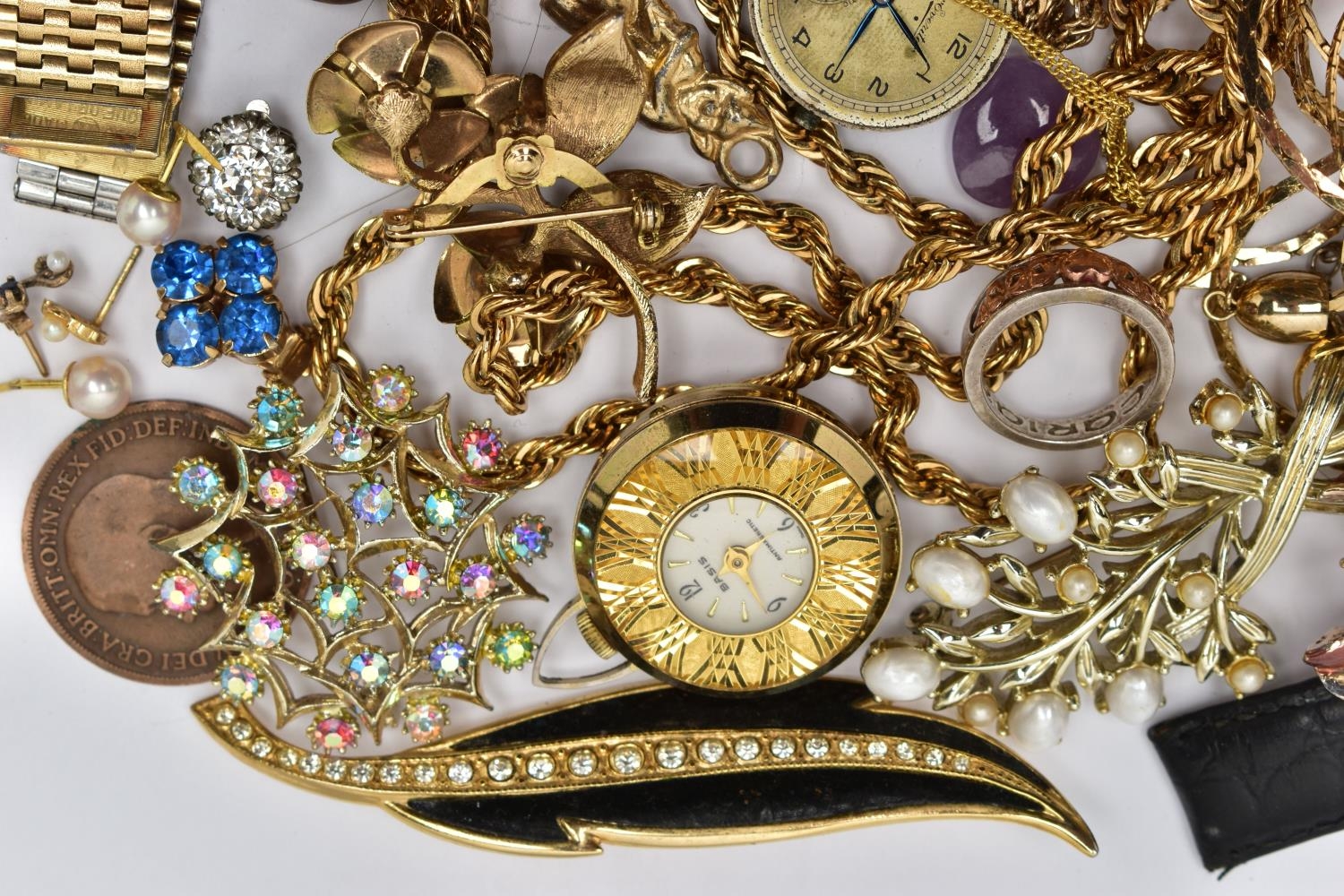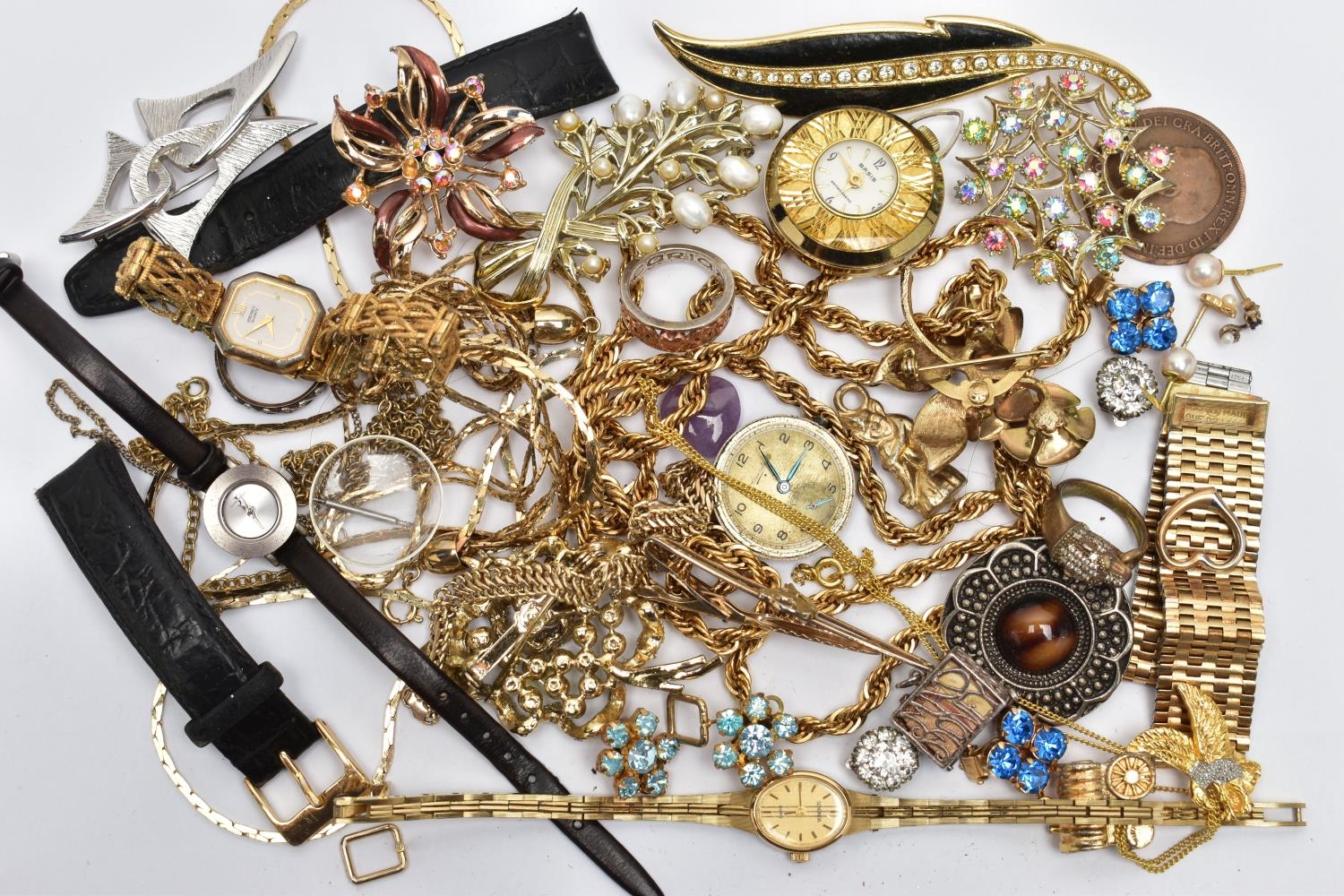 AN ASSORTMENT OF COSTUME JEWELLERY, to include a silver 'Cariad' ring, hallmarked Edinburgh, ring size N 1/2, three hand wound ladies wristwatches names to include 'Seiko, Sekonda and Jasper Conran', case backs stamped stainless steel, watches not currently working at time of cataloguing, not tested, with many further items some stamped 925, majority unmarked (condition report: overall condition from fair to good, many items AF)