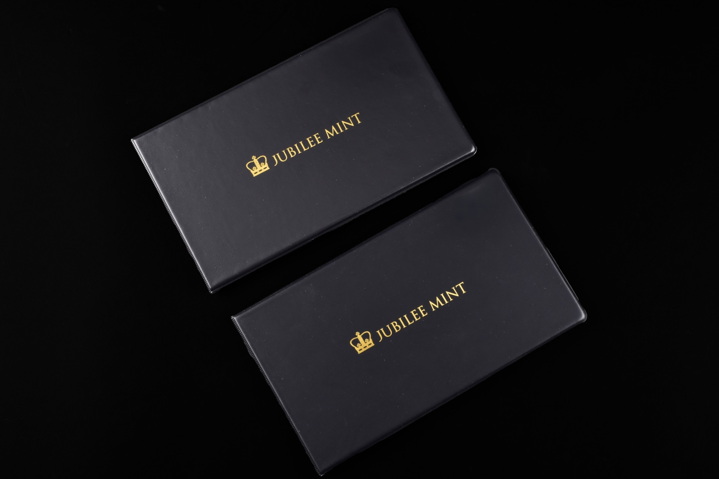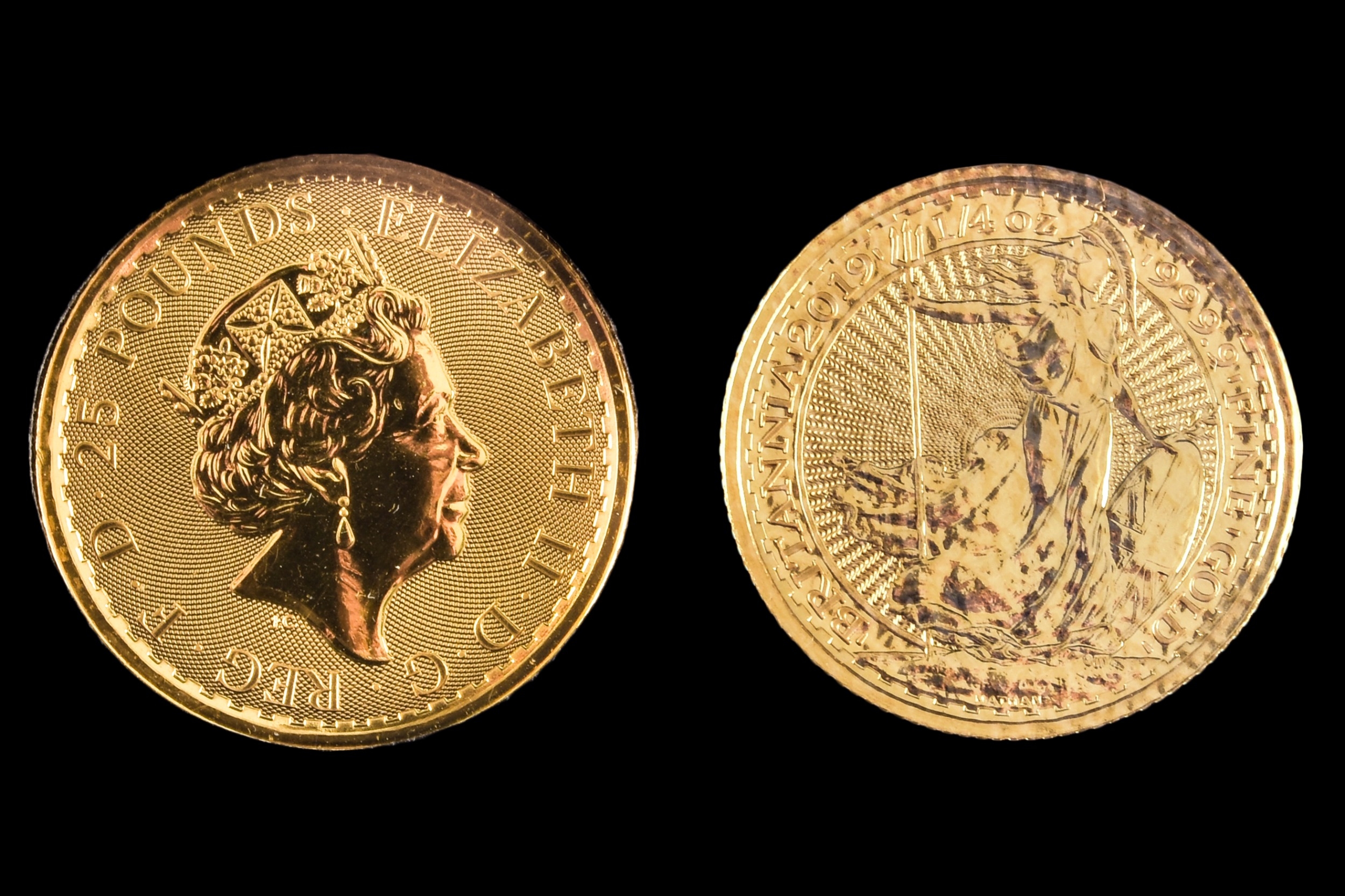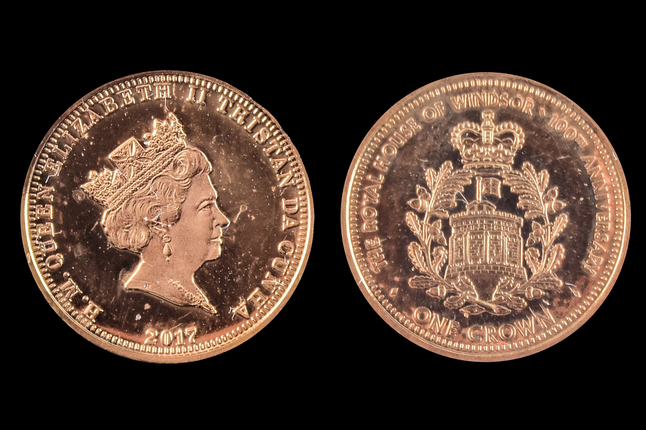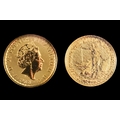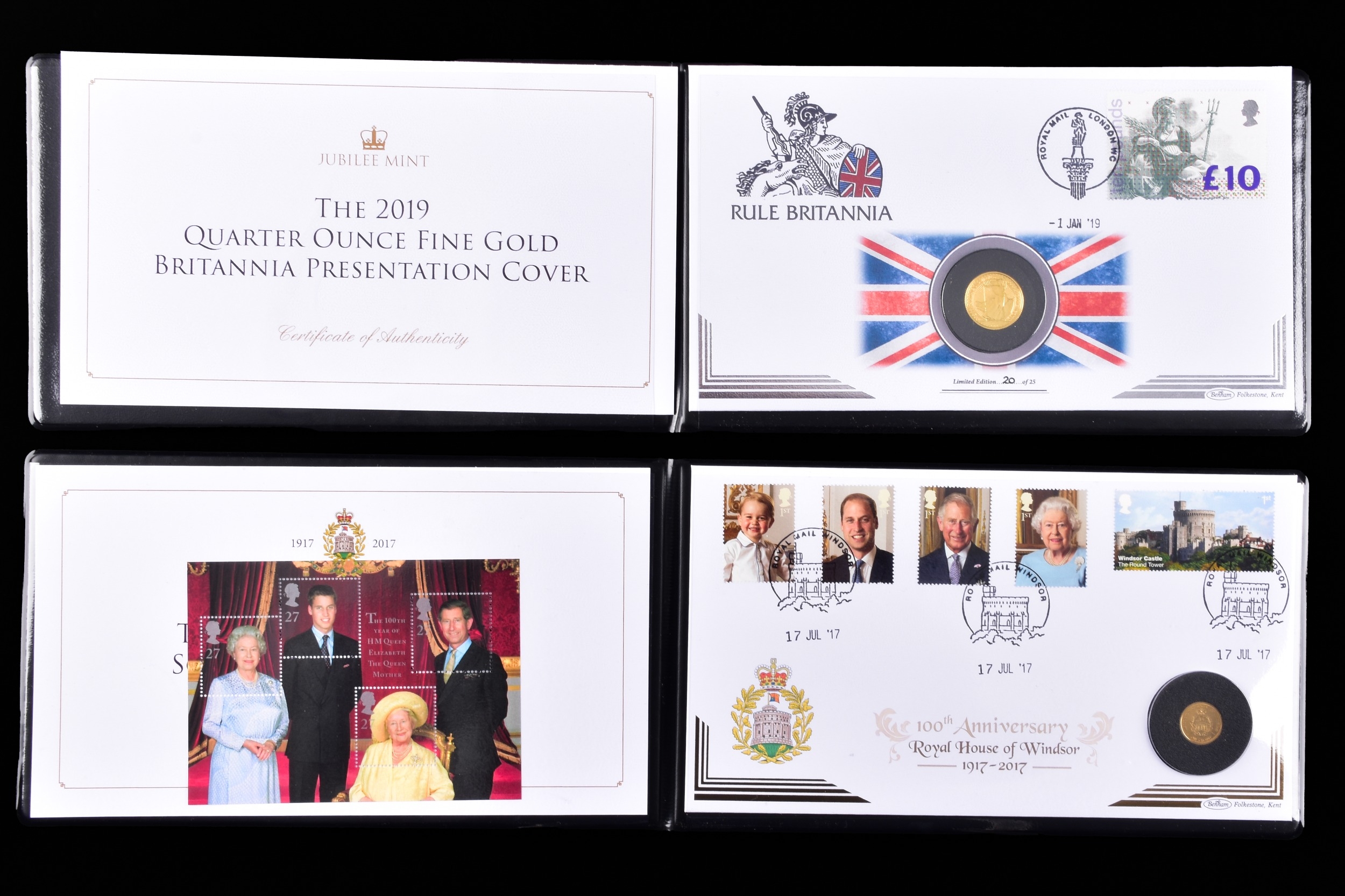 A Jubilee Mint 2019 1/4 oz fine gold Britannia presentation cover, together with a Jubilee Mint 2017 100th Anniversary of the House of Windsor solid gold coin cover. (2)