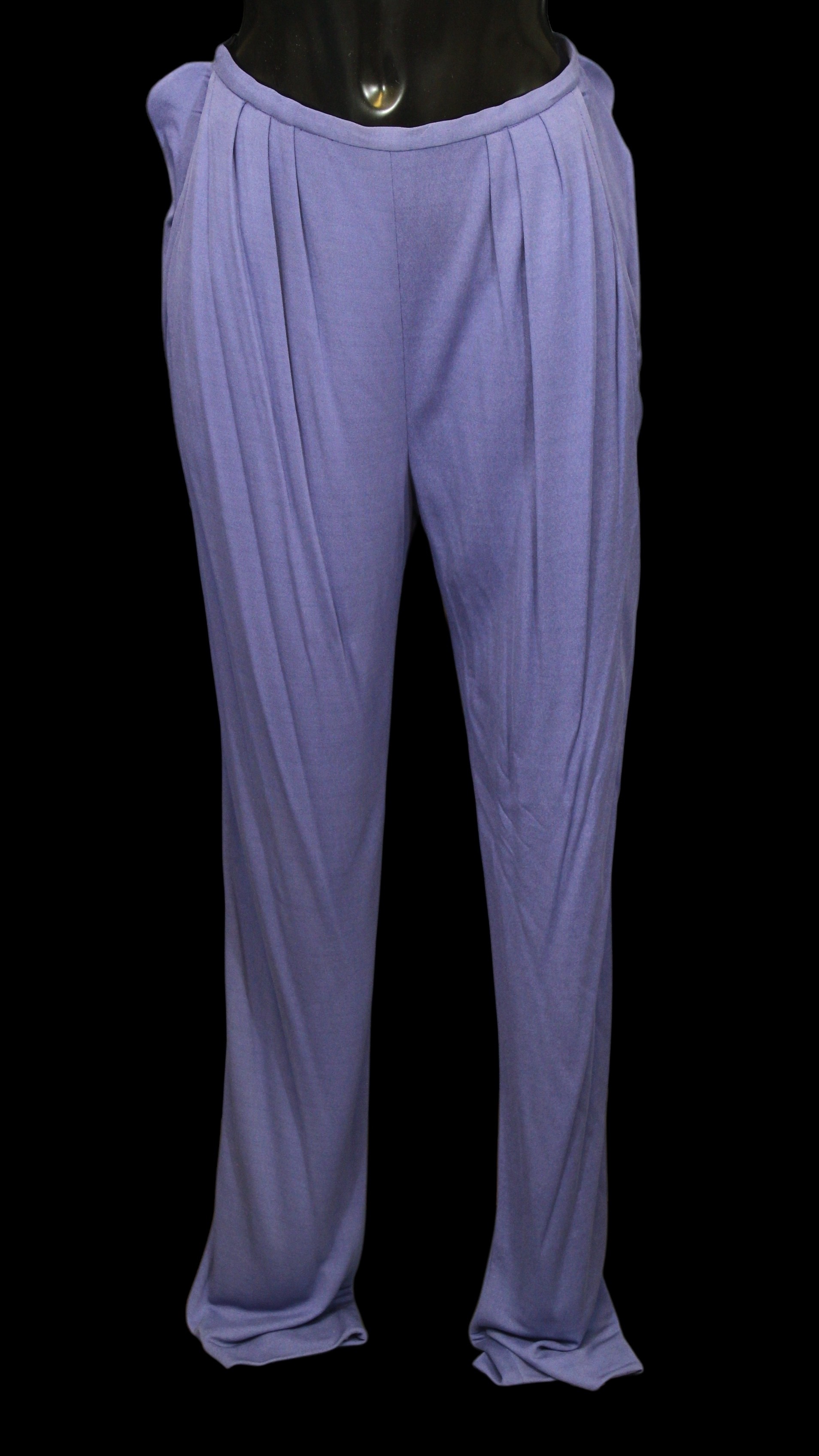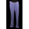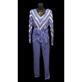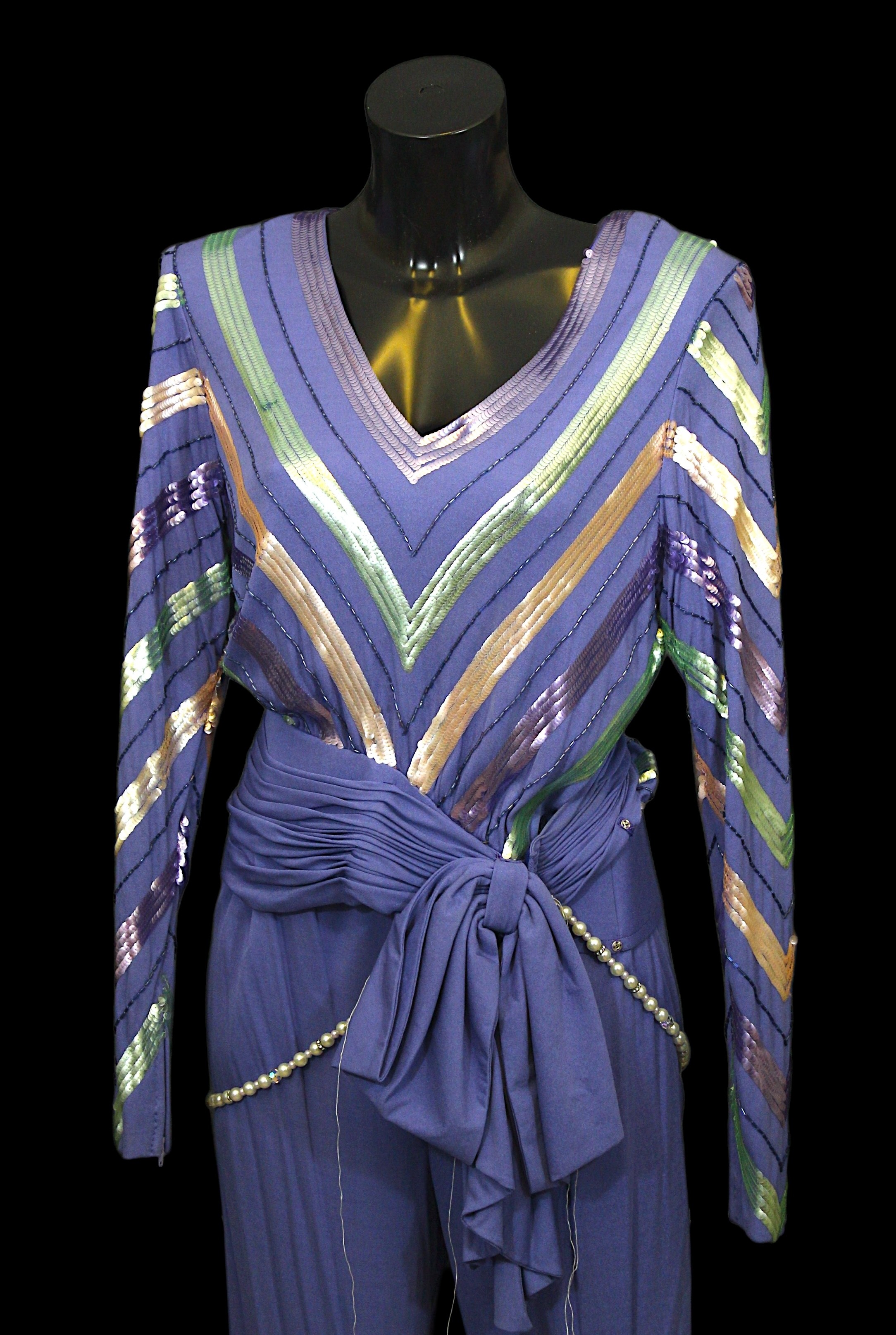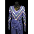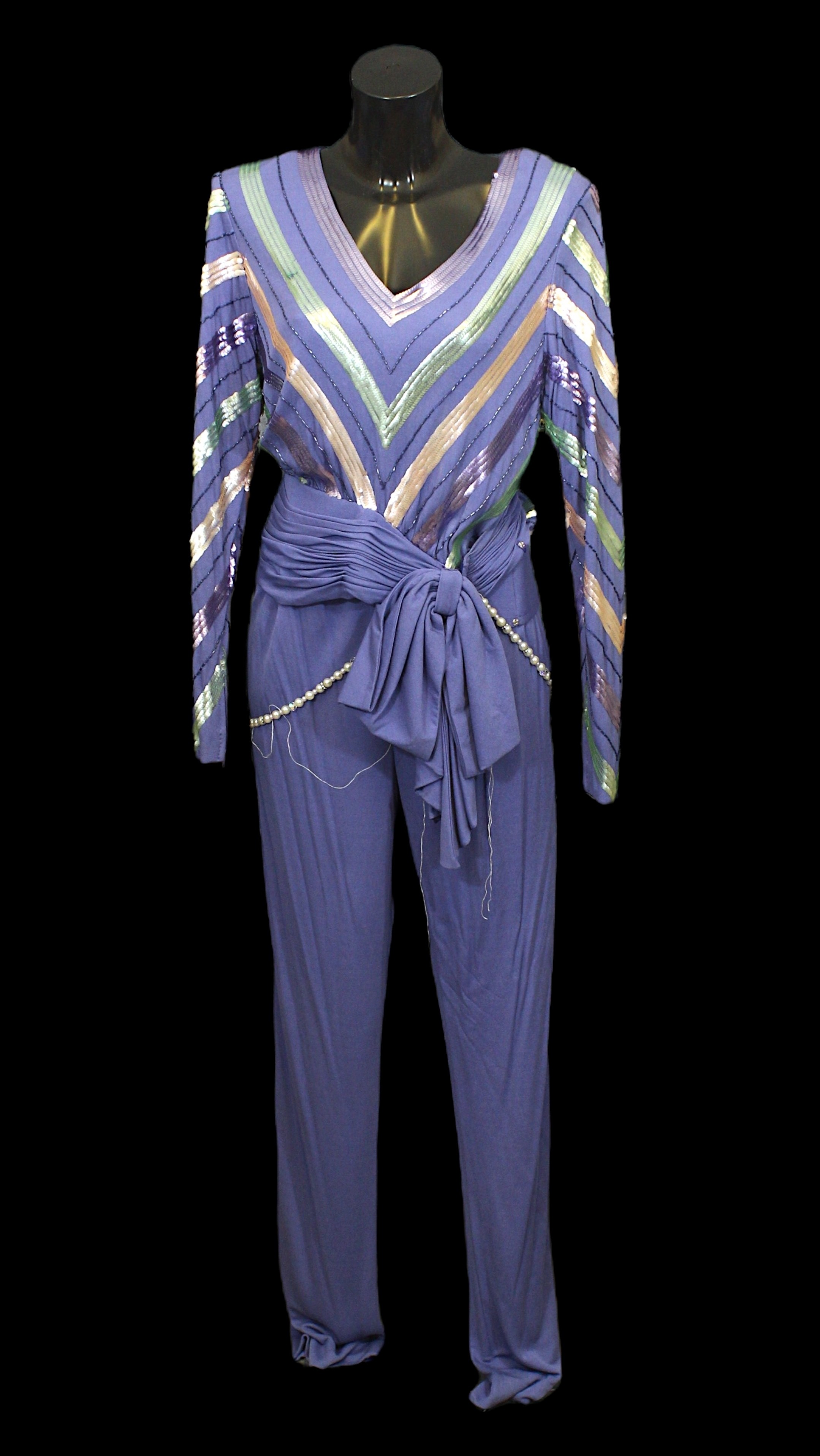 comprising trousers and a long-sleeved top, of purple synthetic fabric, the top embellished with panels of sequins in chevron design in pink, purple and green, large bow to waist and pearl effect tassel, trousers waist approximately 34cm