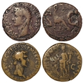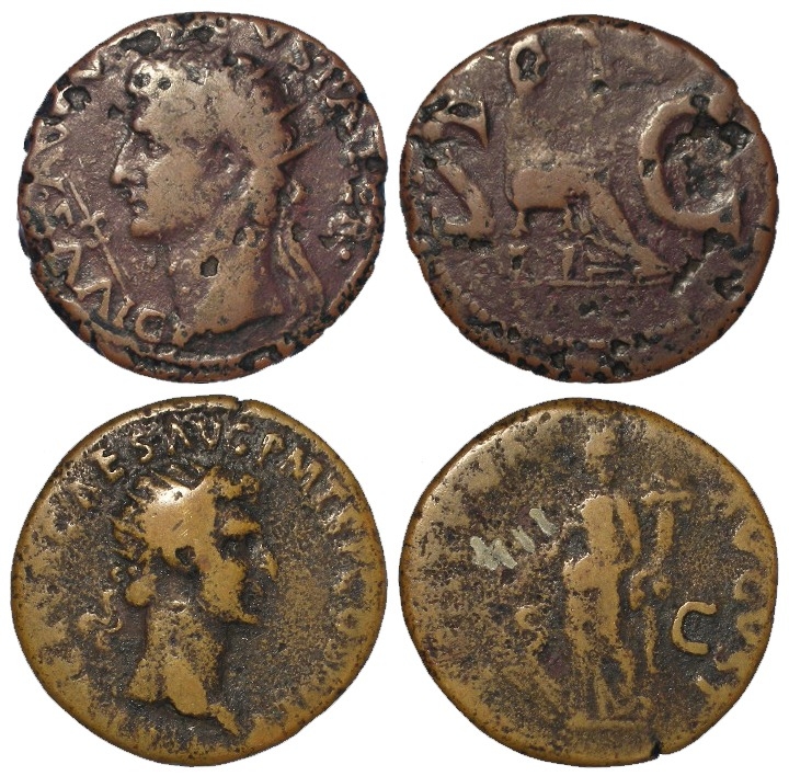 Roman Imperial (2) brass Dupondii: Divus Augustus (under Tiberius) Rome AD 15/16, Rev: Livia seated r., holding sceptre and patera in field, S - C. RIC 72; Cohen 244, 9.47g, pitted Fine; along with Nerva, Rome AD 98, Rev: IMP II COS IIII P P / S - C Fortuna standing front, head to left, holding rudder in her right hand and cornucopiae in her left. BMC 145, 10.25g, aF/fair, museum number in rev. field.