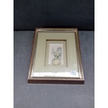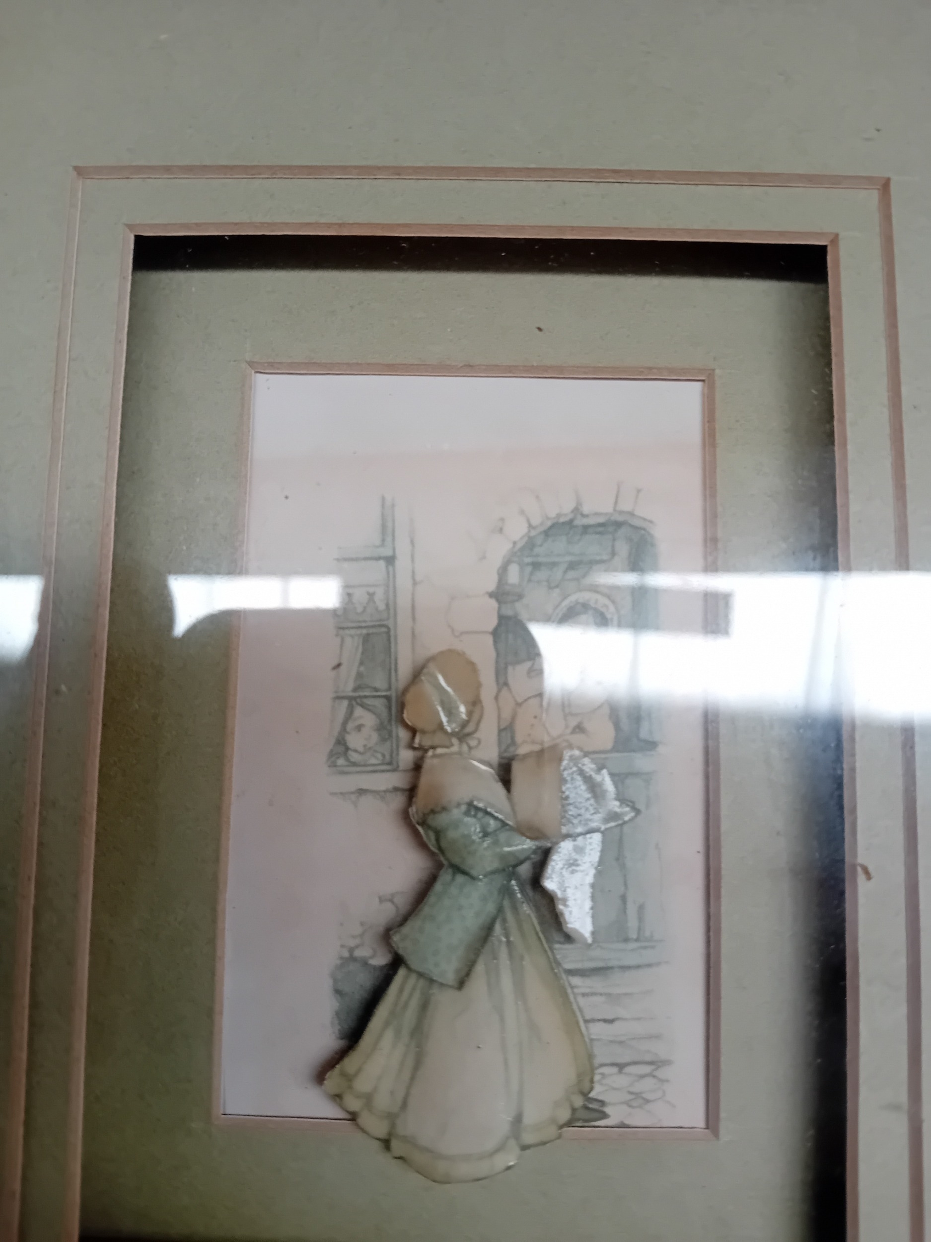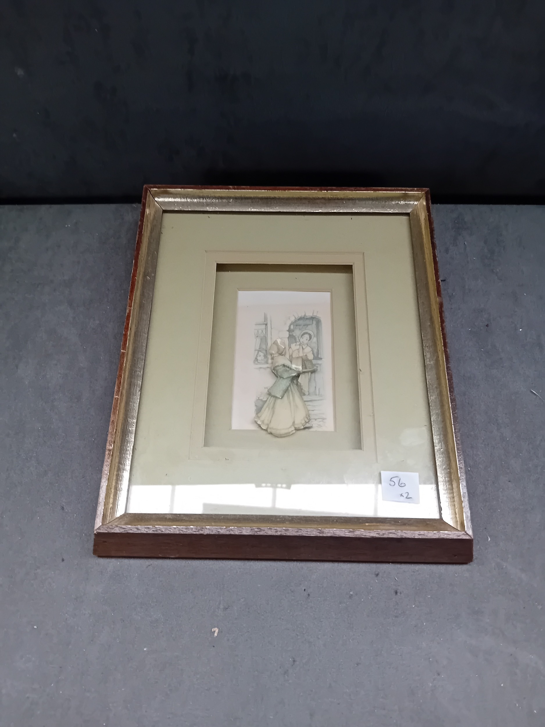 A framed mixed-media artwork, suitable as wall art, featuring a central three-dimensional molded figure of a woman in period attire, rendered in a pale, matte material, set against a two-dimensional background depicting an architectural setting with drawn or printed elements and subtle washes. The illustrative style suggests a romanticized or vintage aesthetic. The piece is presented under glass, within a light-colored mat, and housed in a wooden frame with a gilded inner border and a darker, possibly stained or painted, outer profile. A white sticker bearing the text '56 x2' is adhered to the glass.