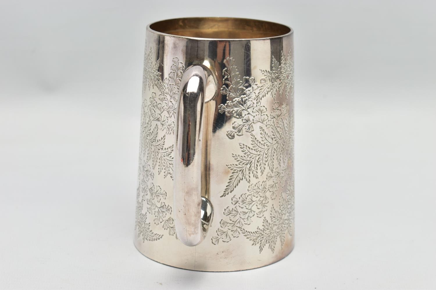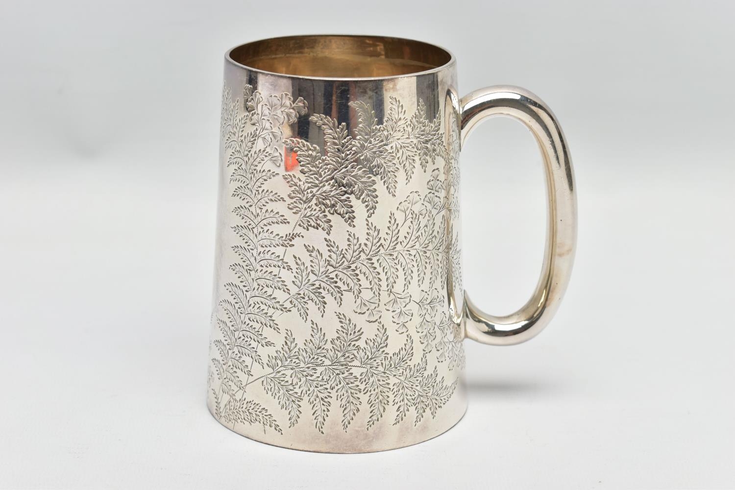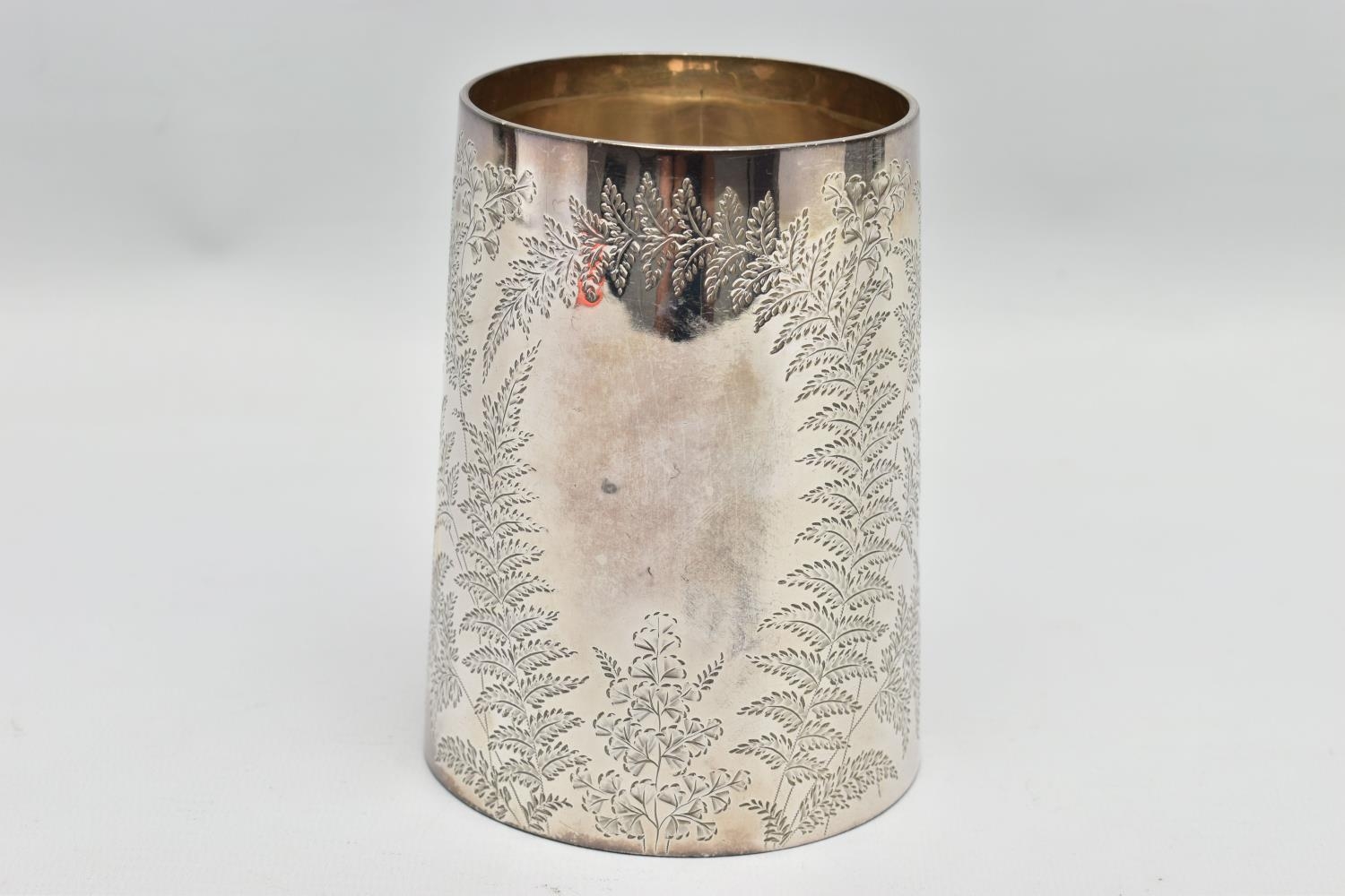 A VICTORIAN SILVER TANKARD OF CONICAL FORM, C scroll handle, the body engraved with ferns surrounding a vacant cartouche, makers Wakely & Wheeler (James Wakely & Frank Clarke Wheeler), London 1887, 9.22ozt, 286.9 grams, height 11.8cm (Condition report: heavily worn gilt interior, marks are partially rubbed, otherwise in reasonable and usable condition)