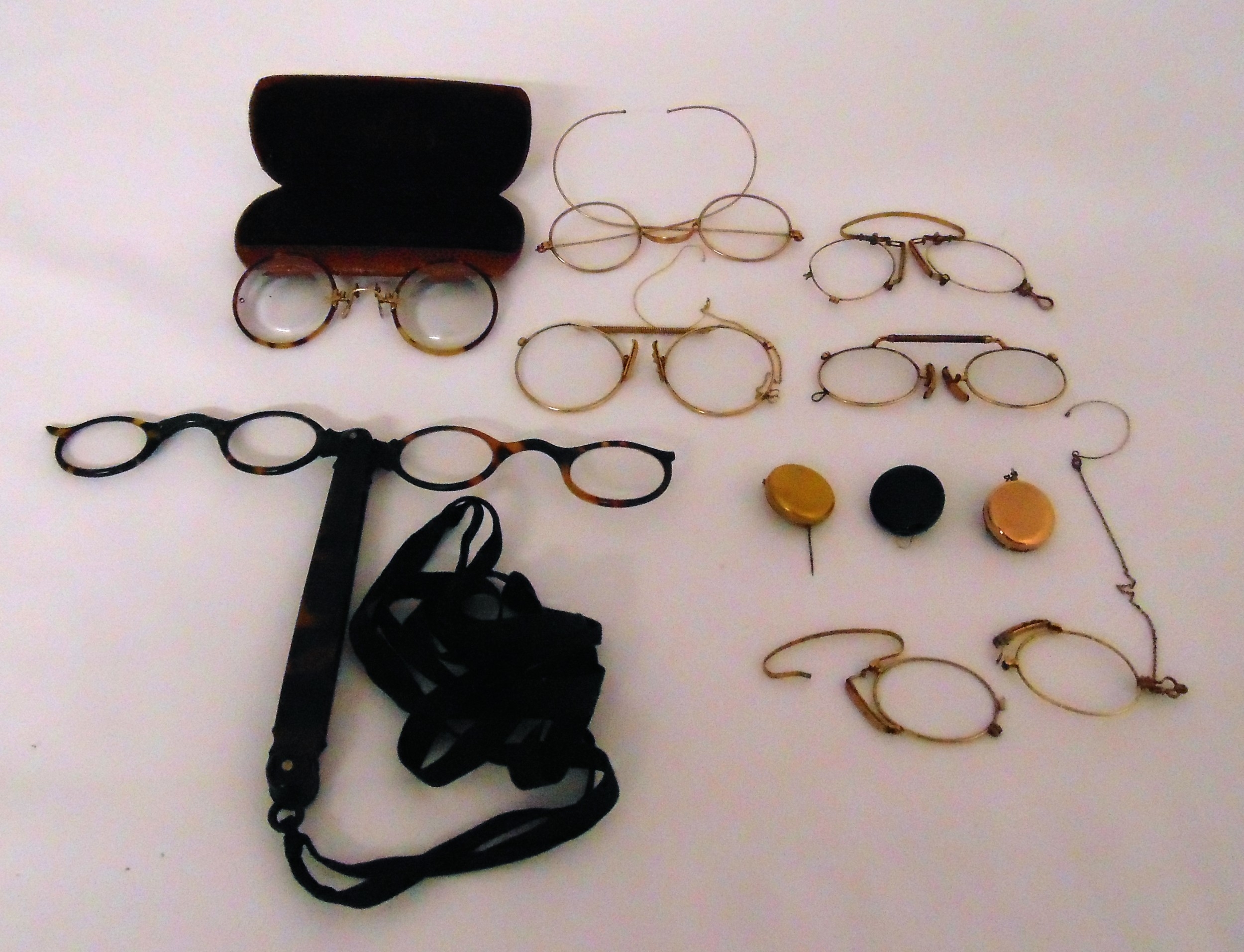 Six pairs of gold framed pince-nez spectacles together with three retractable brooch spectacle chains, one in a 9ct gold case, and a pair of tortoiseshell double folding lorgnettes (10)