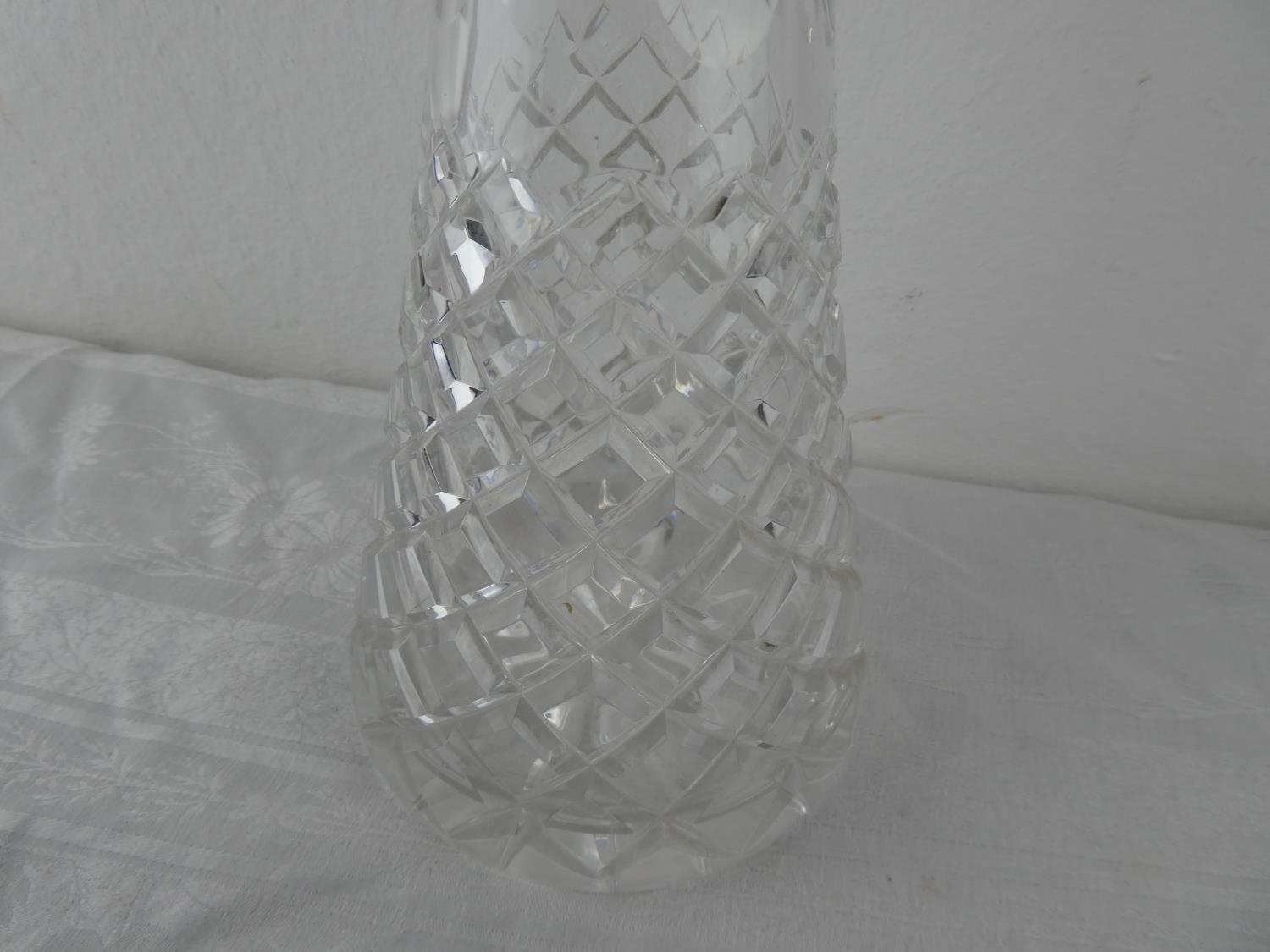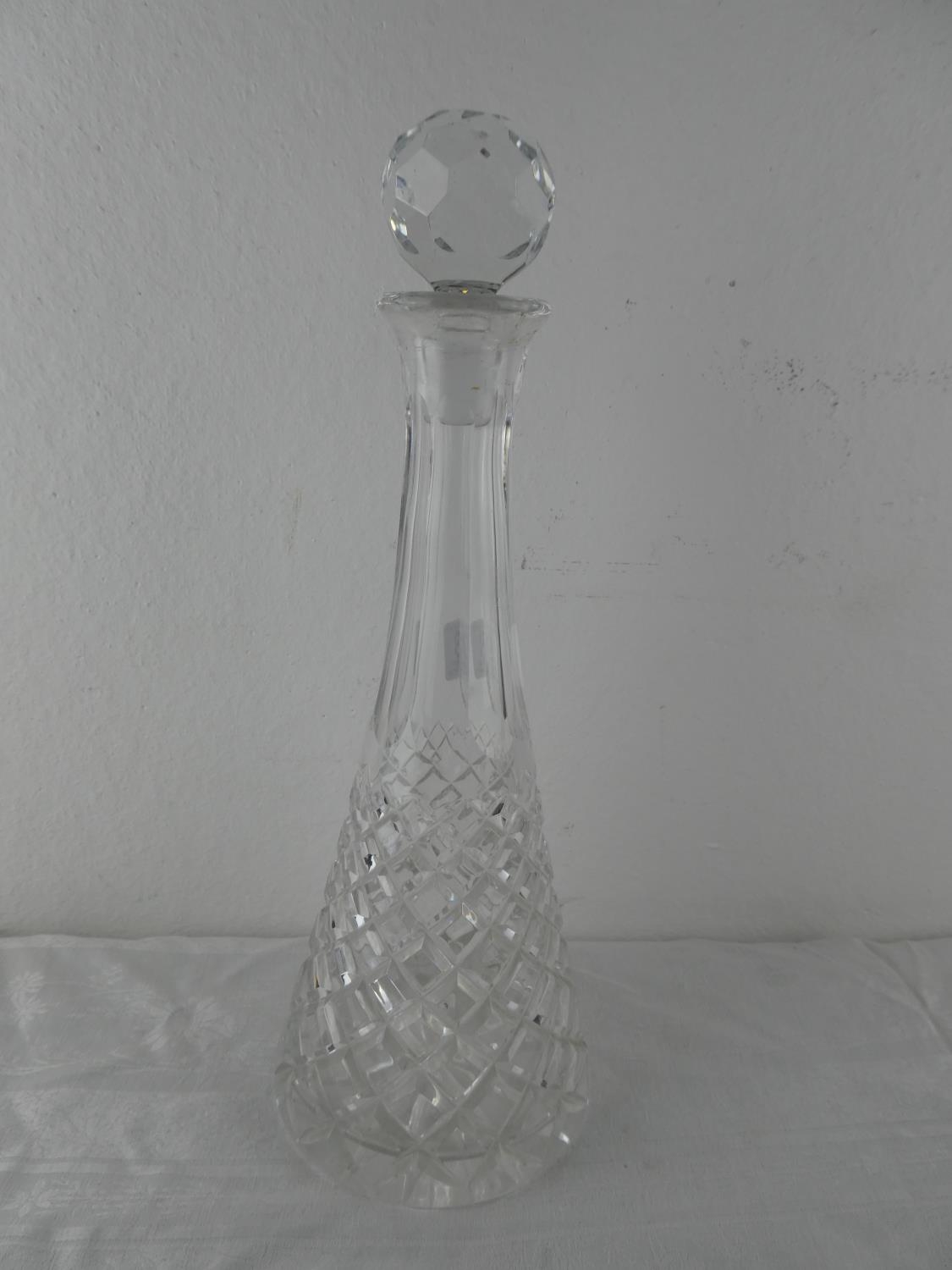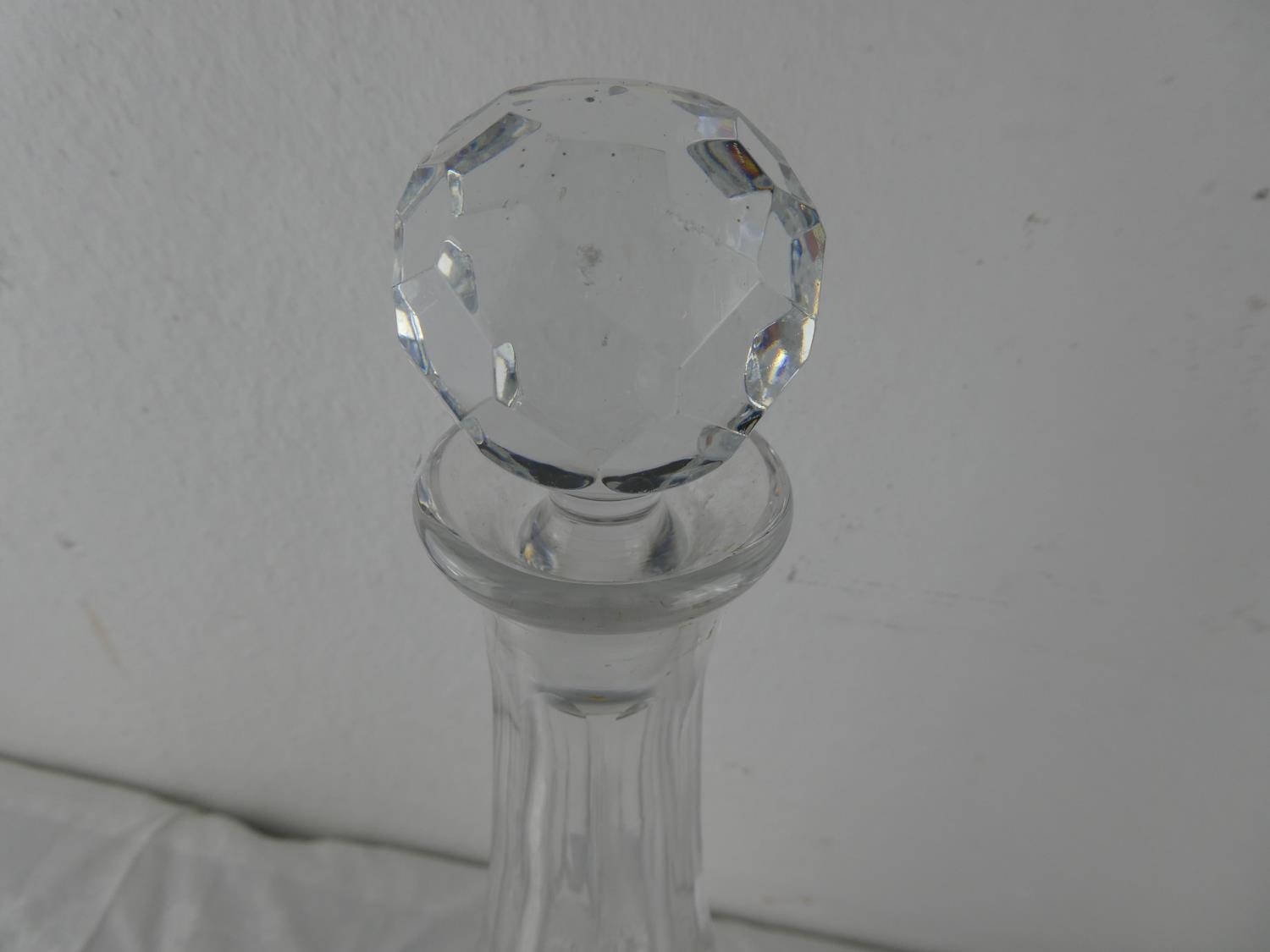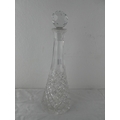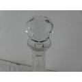 A glass decanter and stopper.