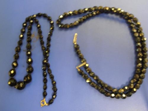 A SET OF WHITBY JET BEADS AND ONE OTHER SET OF BEADS