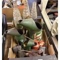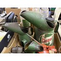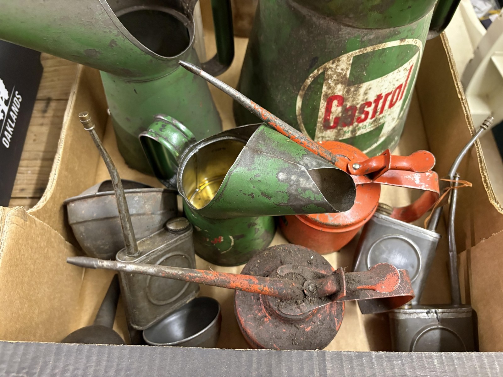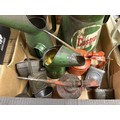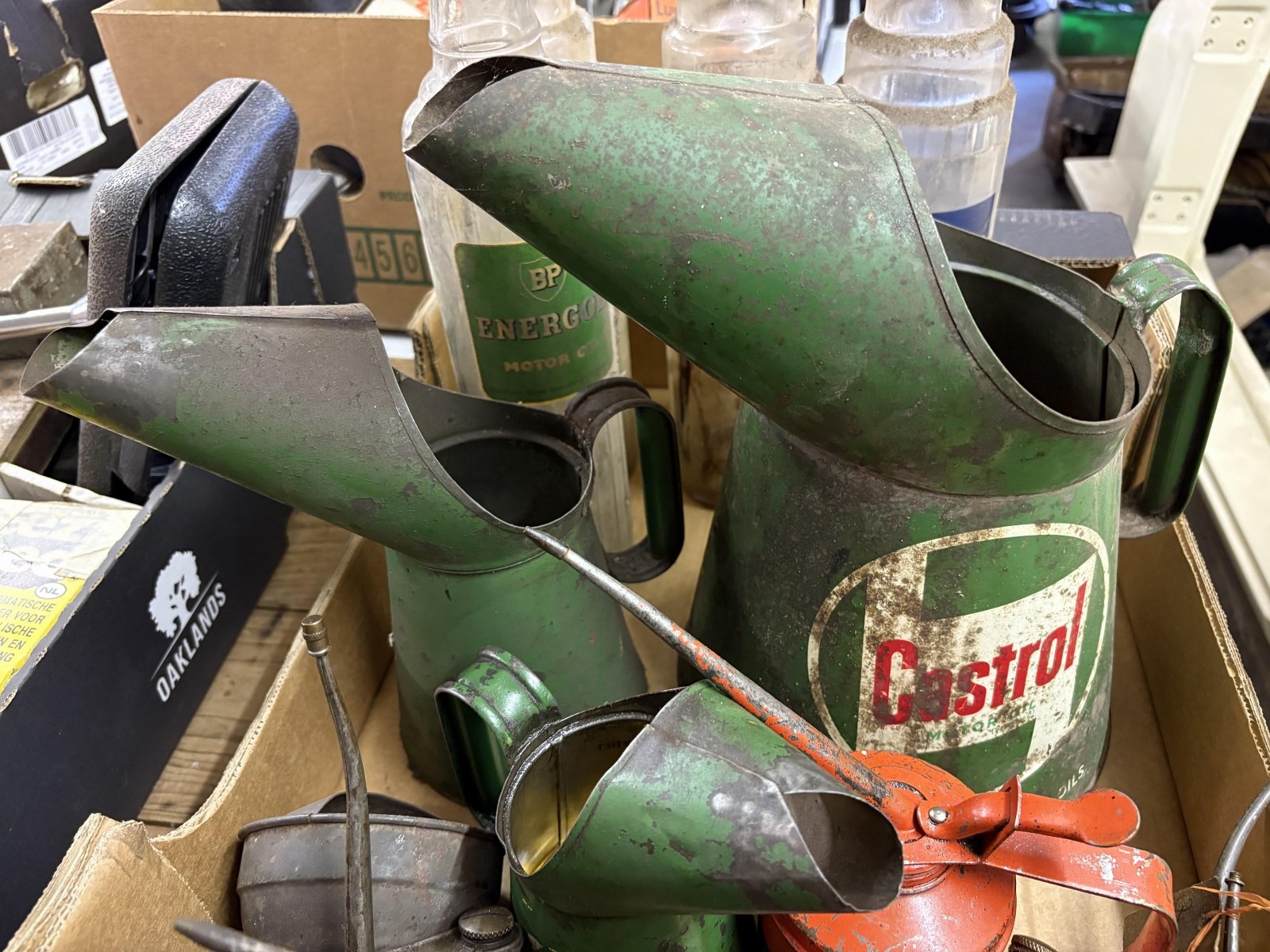 Three forecourt glass oil jars, assorted oil cans and items (box)