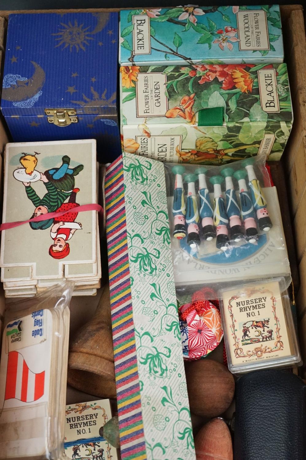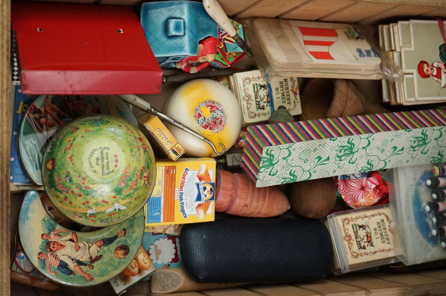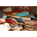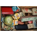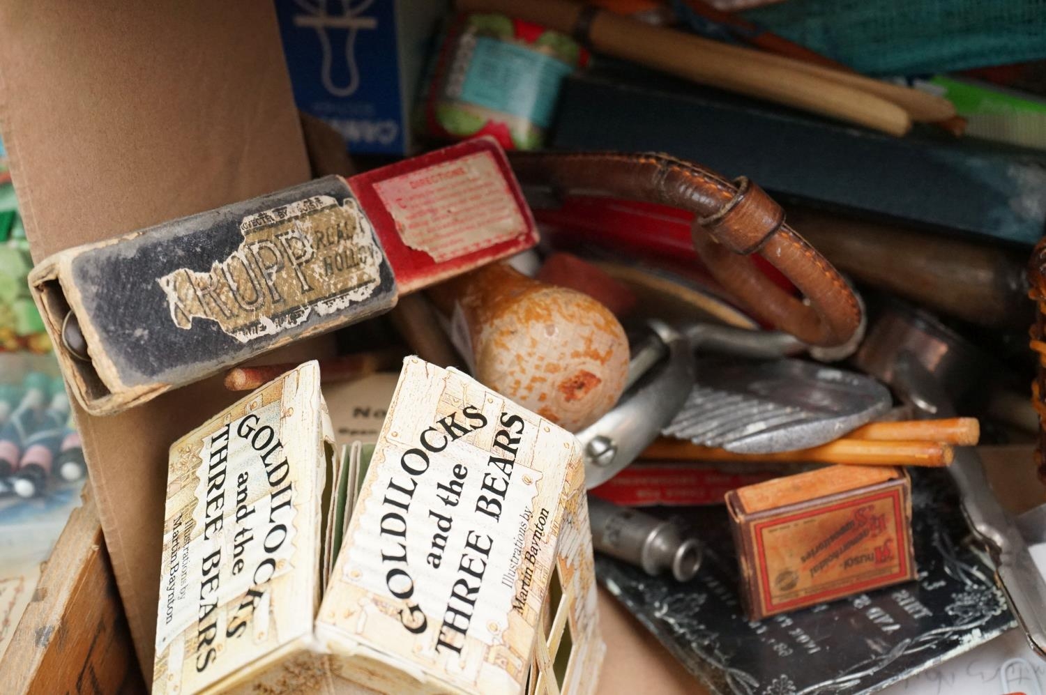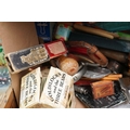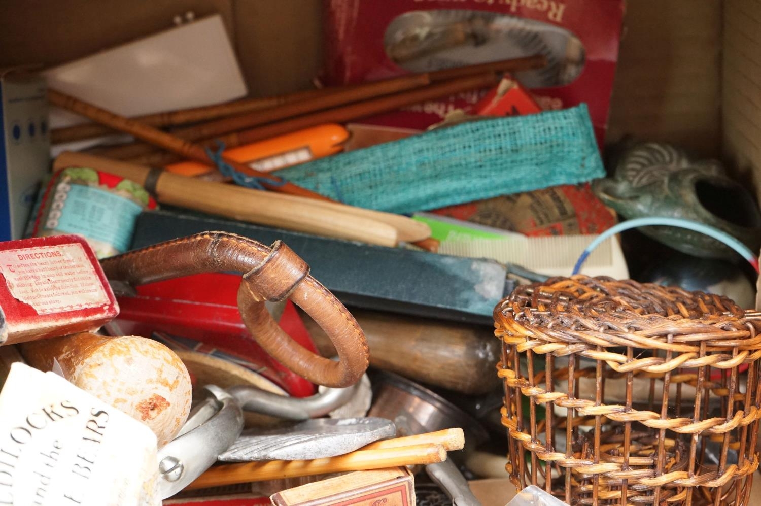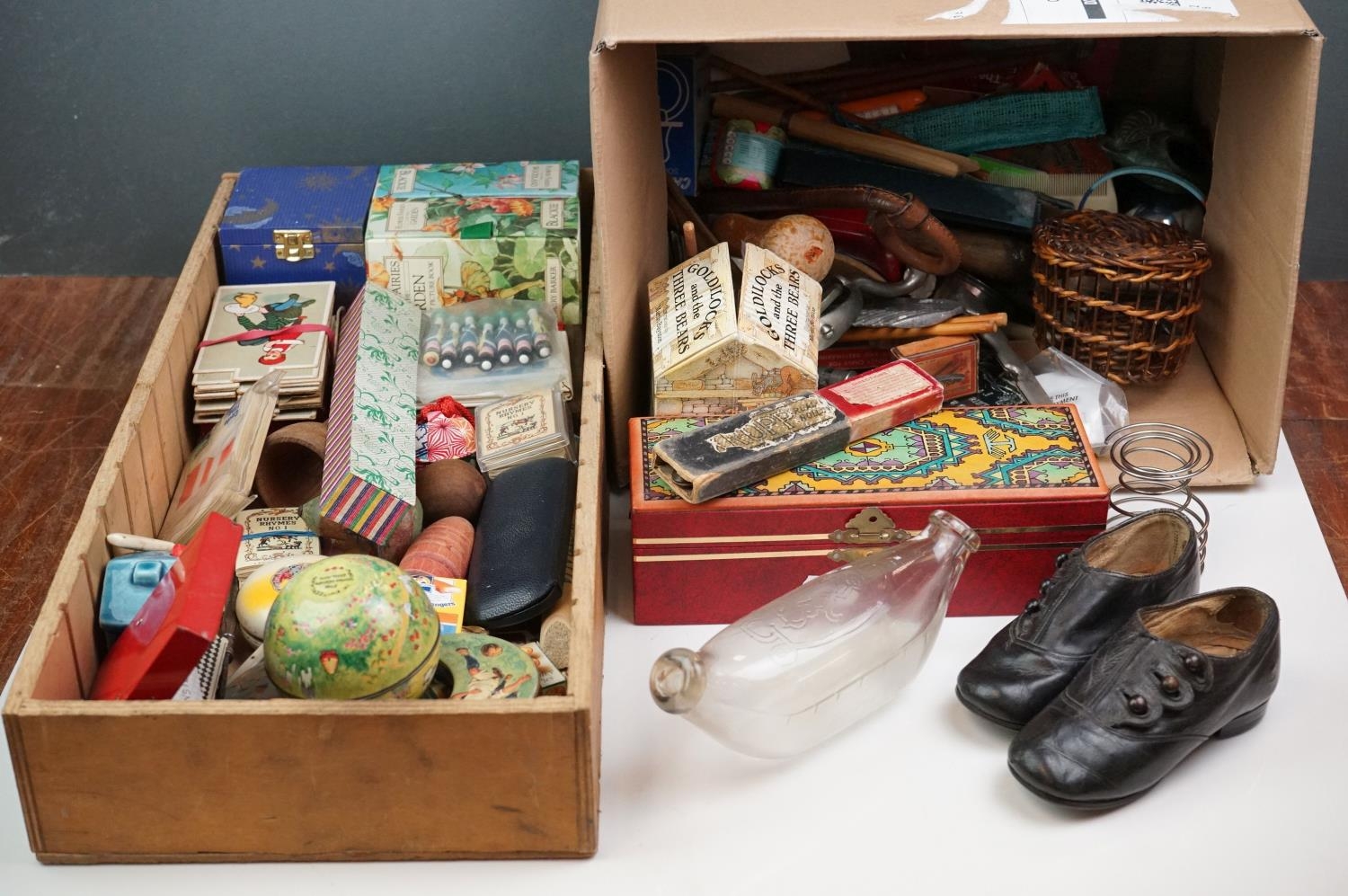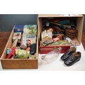 A box of mixed collectables to include a antique pair of children's shoes, cutthroat razor, cigarette case, glove stretchers and brass scales.