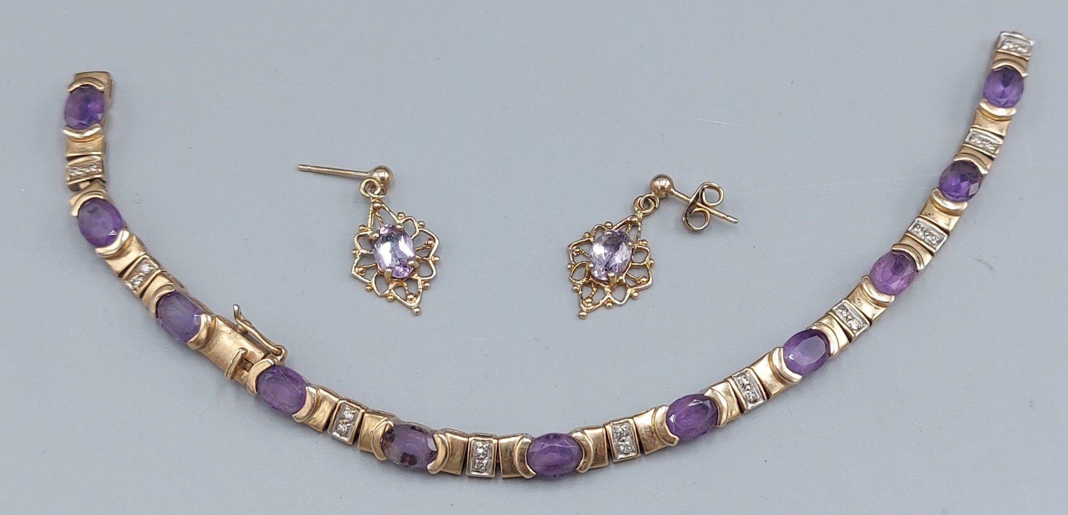 A 9ct gold Amethyst and Diamond set bracelet together with a similar pair of Amethyst set earrings, 15.4gms