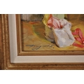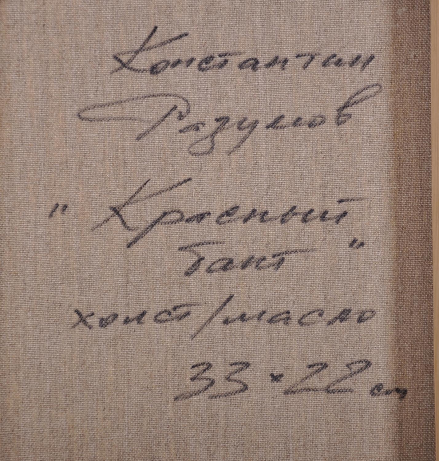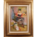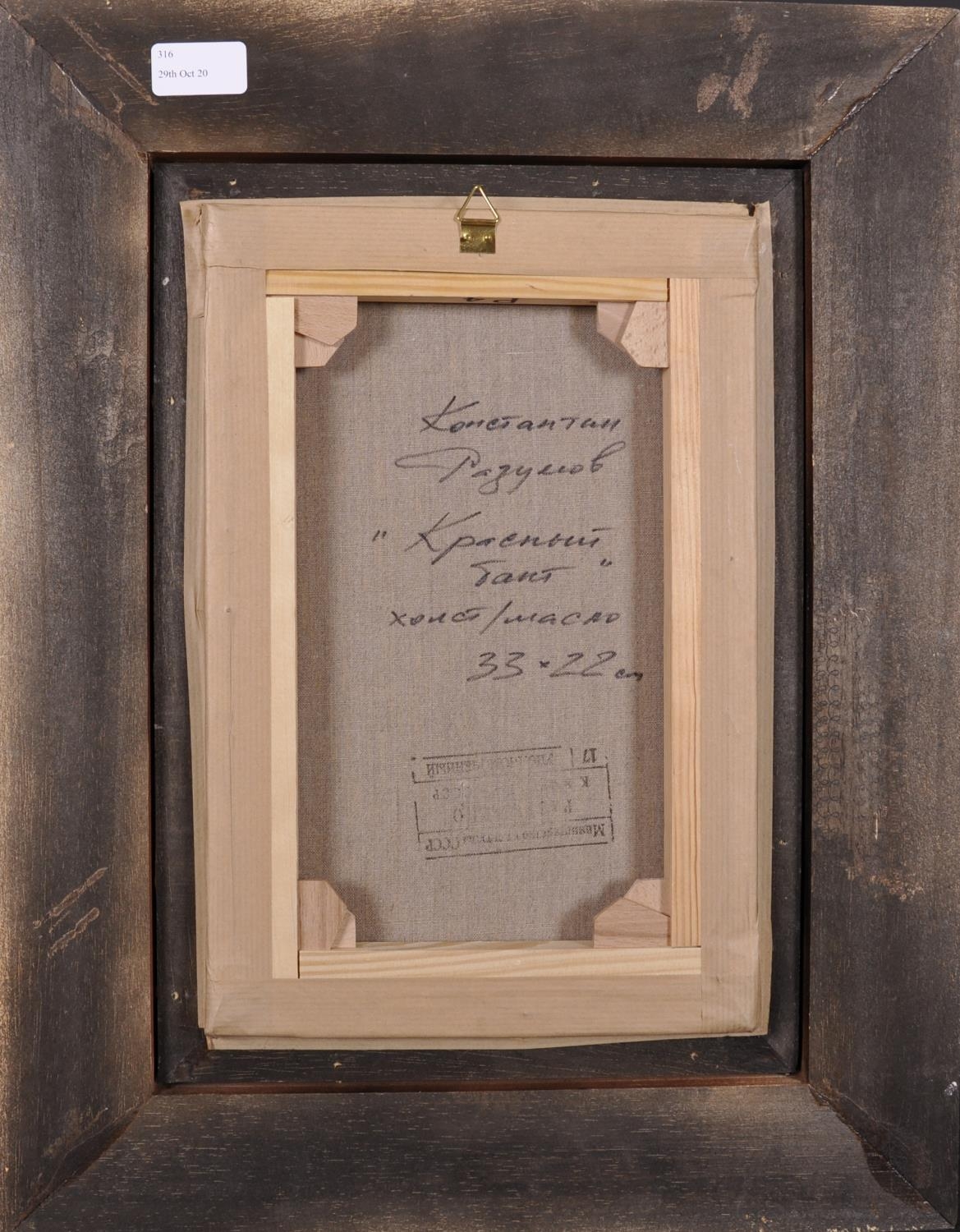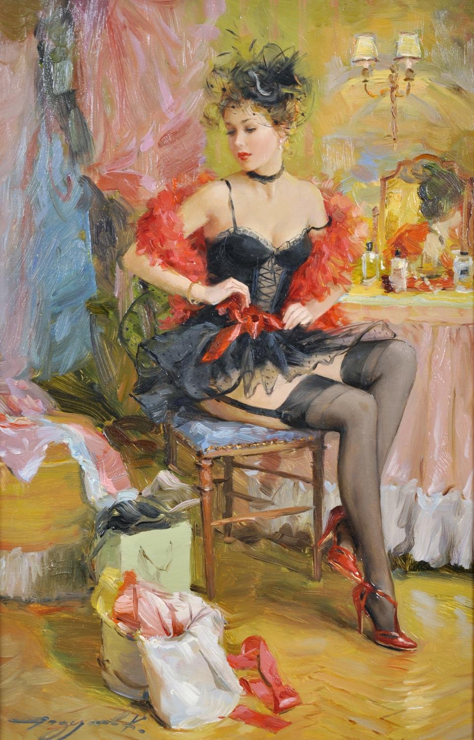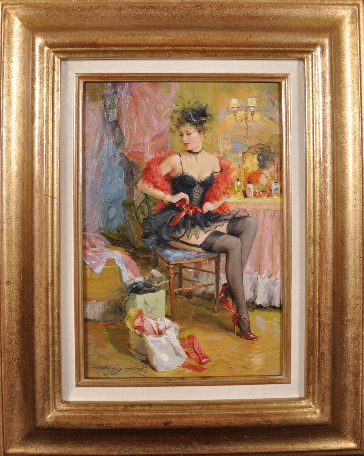 Konstantin Razumov (1974- ) Russian. "Dressing for the Evening", a Scantily Dressed Lady in her Boudoir, Oil on Canvas, Signed in Cyrillic, and Signed and Inscribed on the reverse in Cyrillic, 13” x 8.75” (33 x 22.2cm)