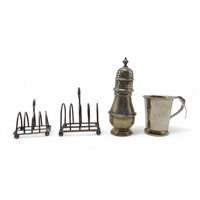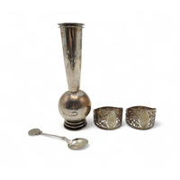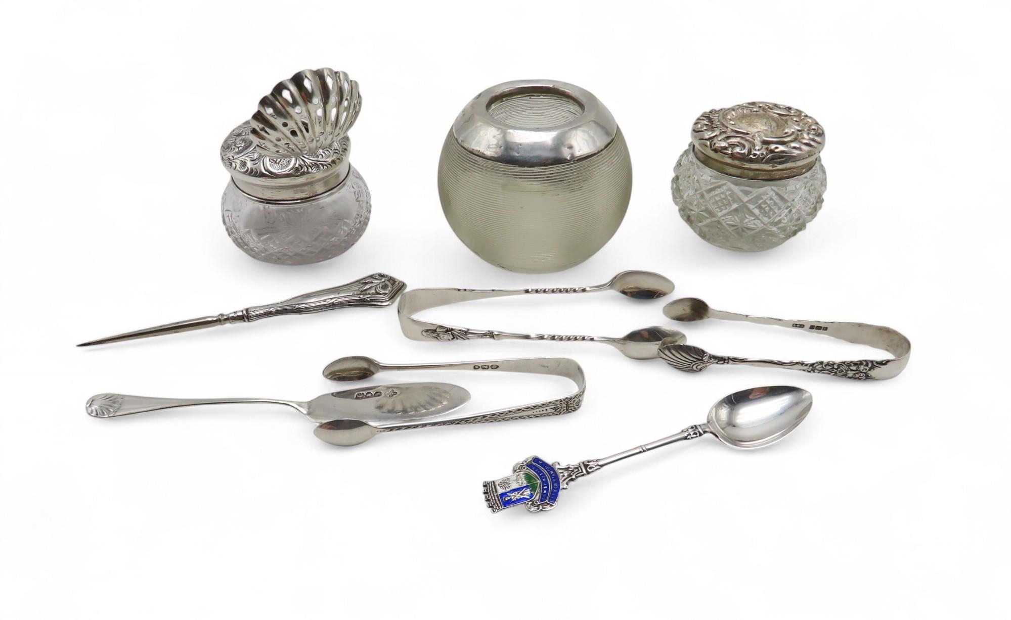 A collection of silver including a globular match striker, by H Pidduck & Sons, London, a silver-topped hair tidy, another silver-topped jar, three pairs of silver napkin rings, a silver butter knife, souvenir spoon, sifter ladle, a silver-handled needle, weighable silver 114gms (11)
