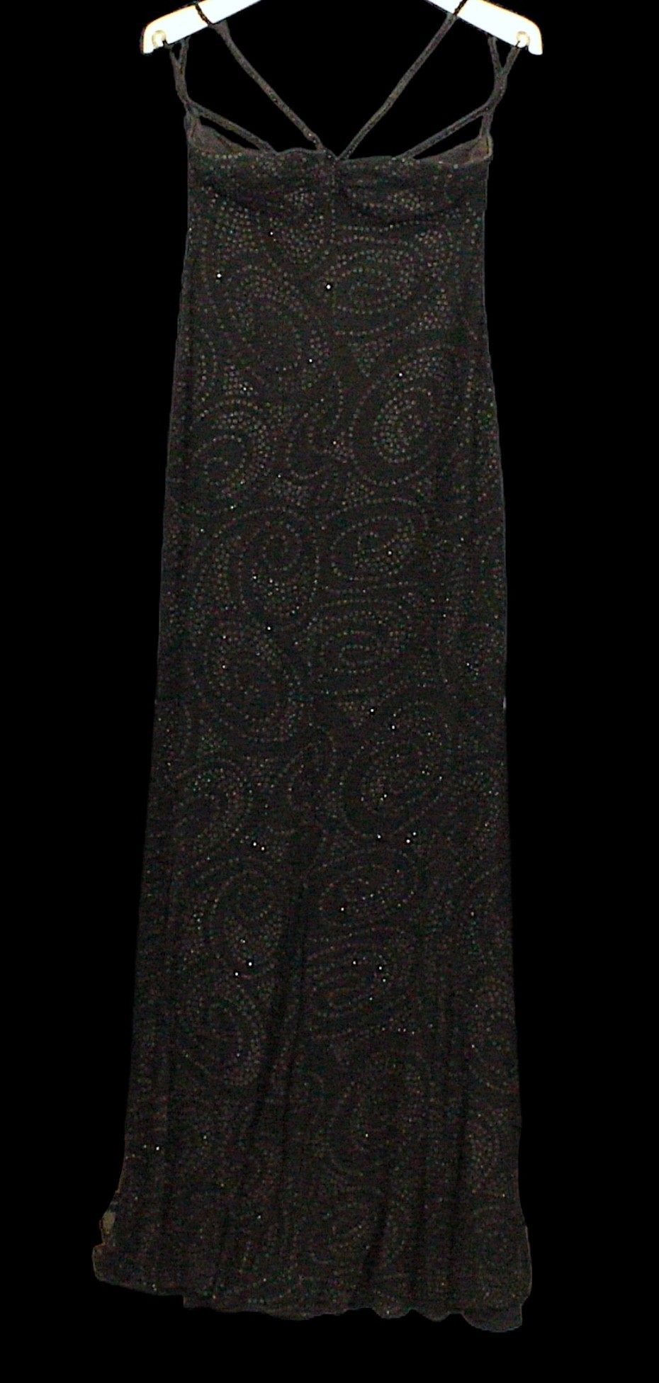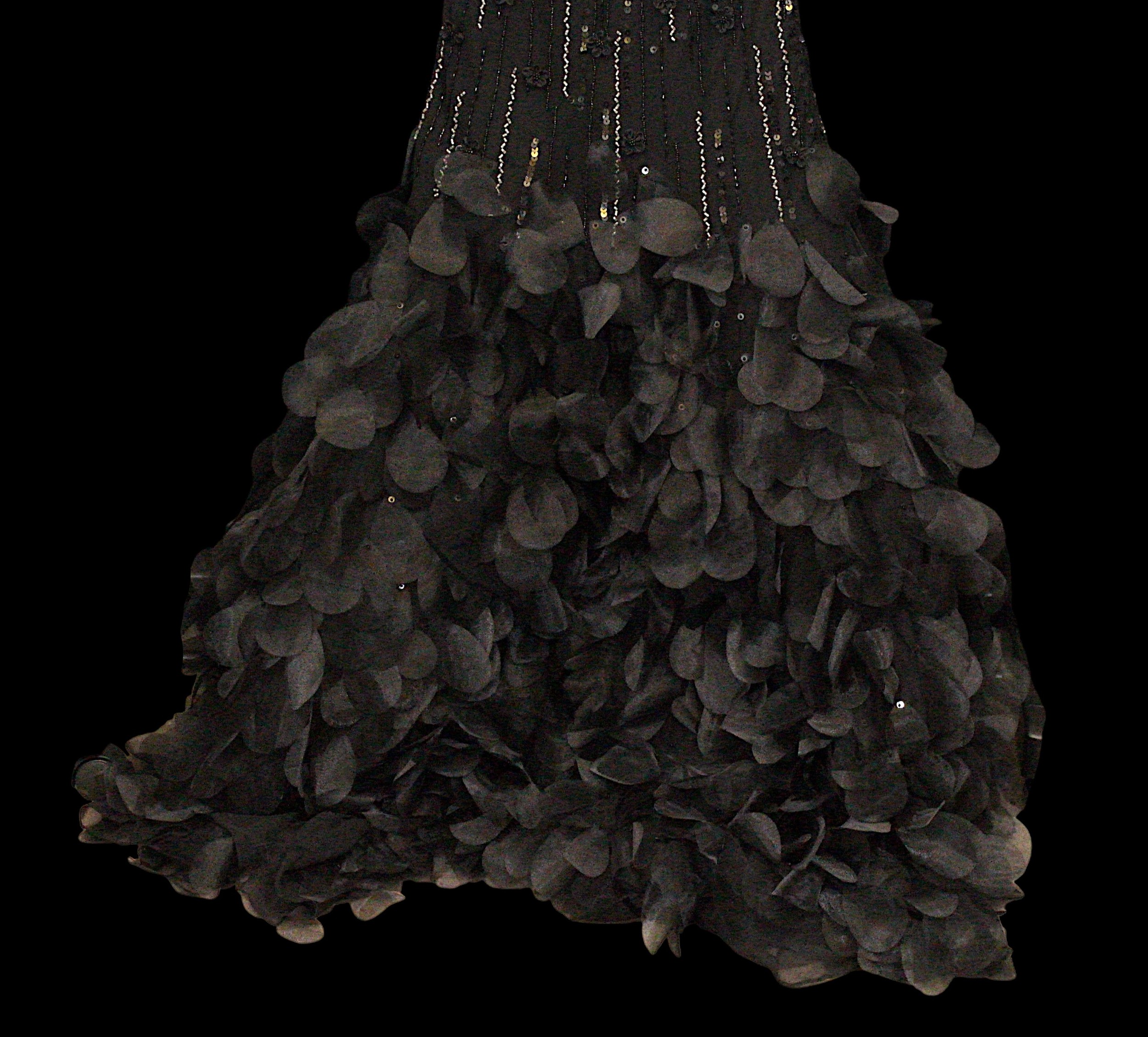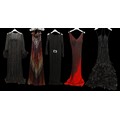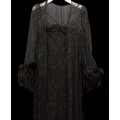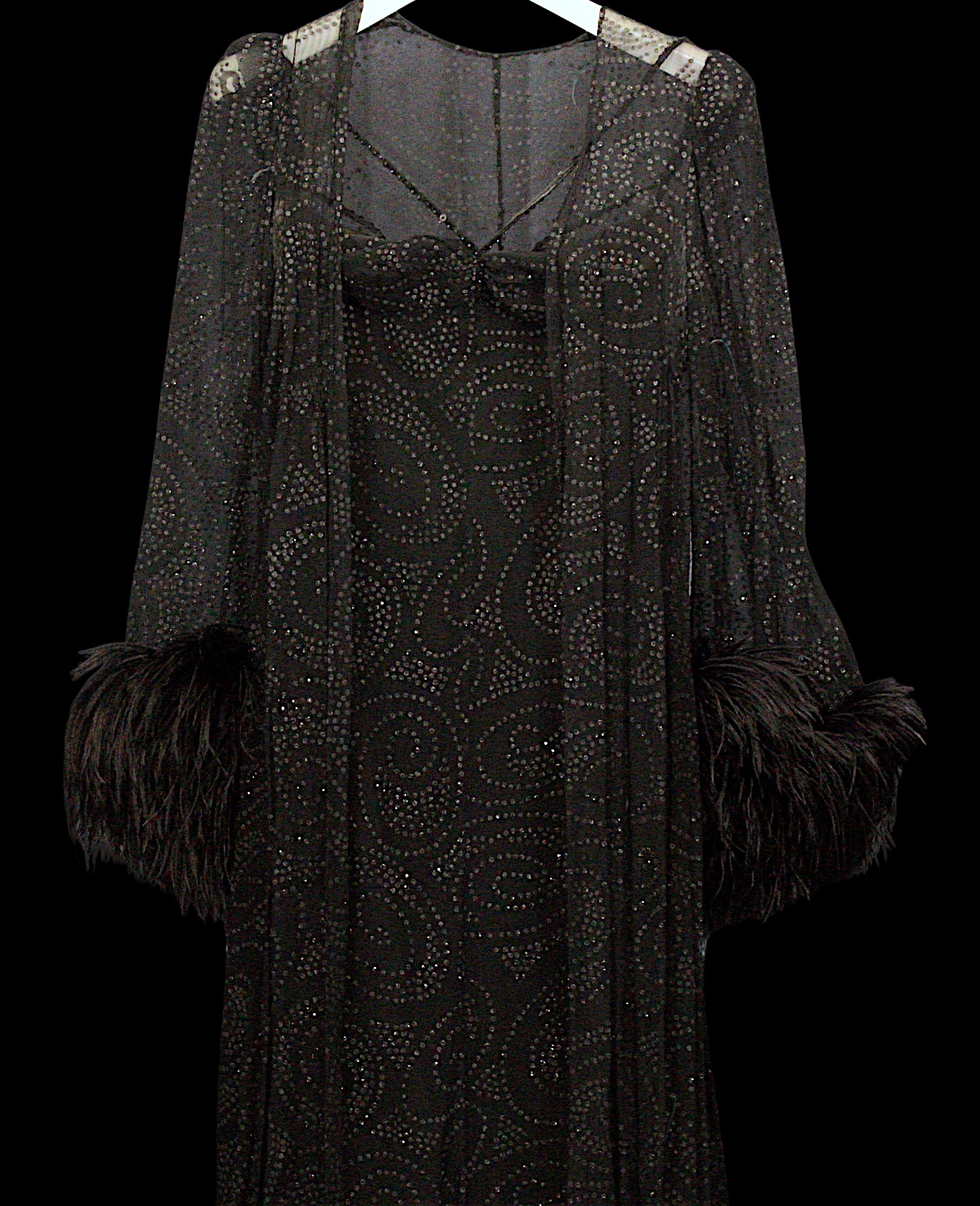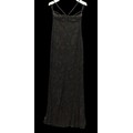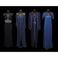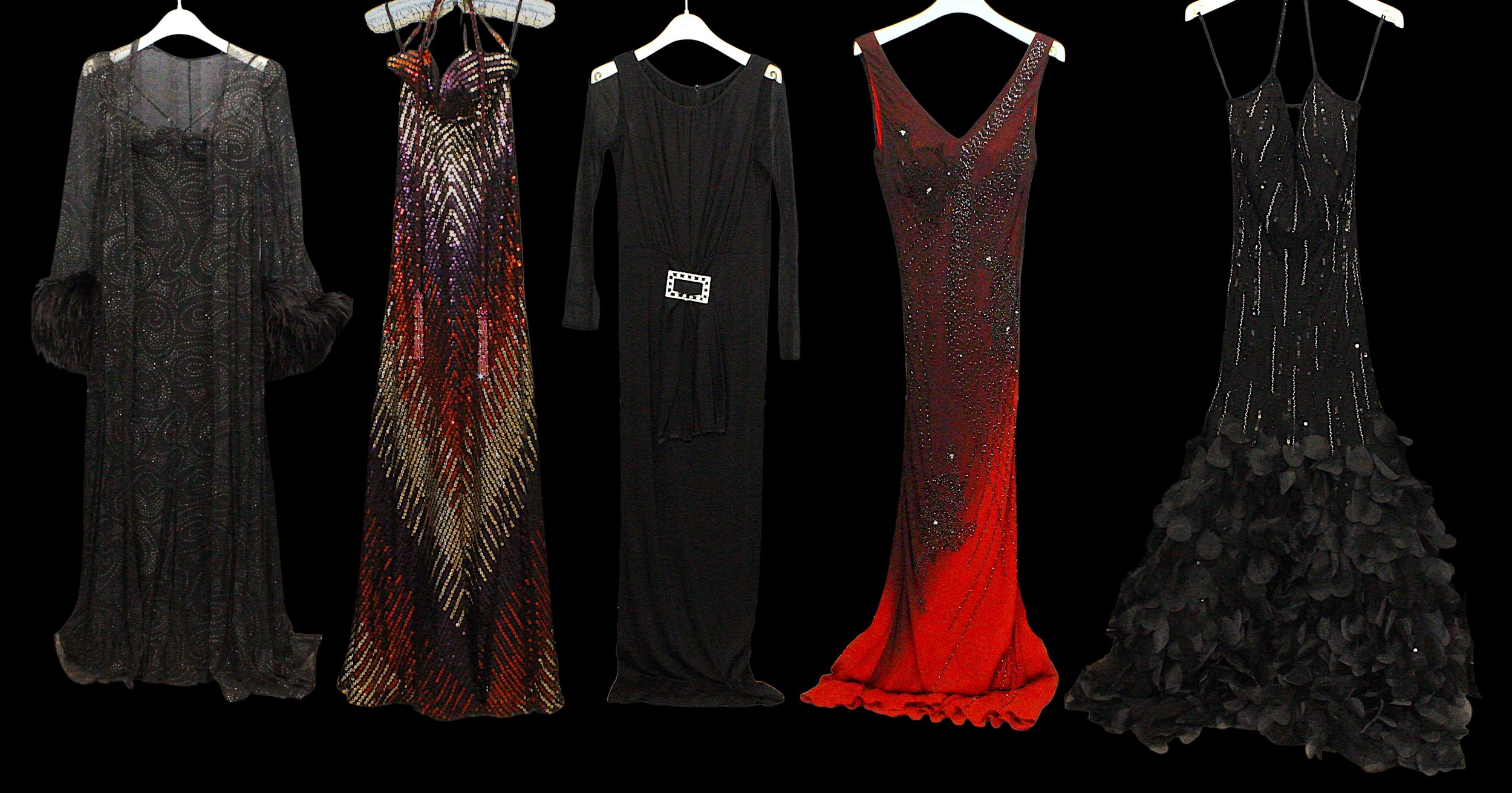 Evening Wear / Stage Costume: A collection of six items of evening wear, dark colours, c. 1960s - c. 2000s, including; a black chiffon effect full length halter tie gown and matching evening coat, embellished with silver, coat trimmed with feathers, dress waist flat approximately 33cm; a black maxi dress, with halter tie neckline, embellished with multicoloured sequins, waist flat approximately 38cm; a black maxi dress, sheer net sleeves, rhinestone buckle to front; a red sleeveless v-neck gown, overlaid with black chiffon type fabric and embellished with black beads, waist flat approximately 33cm; and a Jovani black gown, beaded spaghetti straps, with bodice decorated with black and silver beads and floral appliqué, skirt with circular taffeta appliqué, labelled size 8 (6)