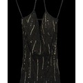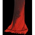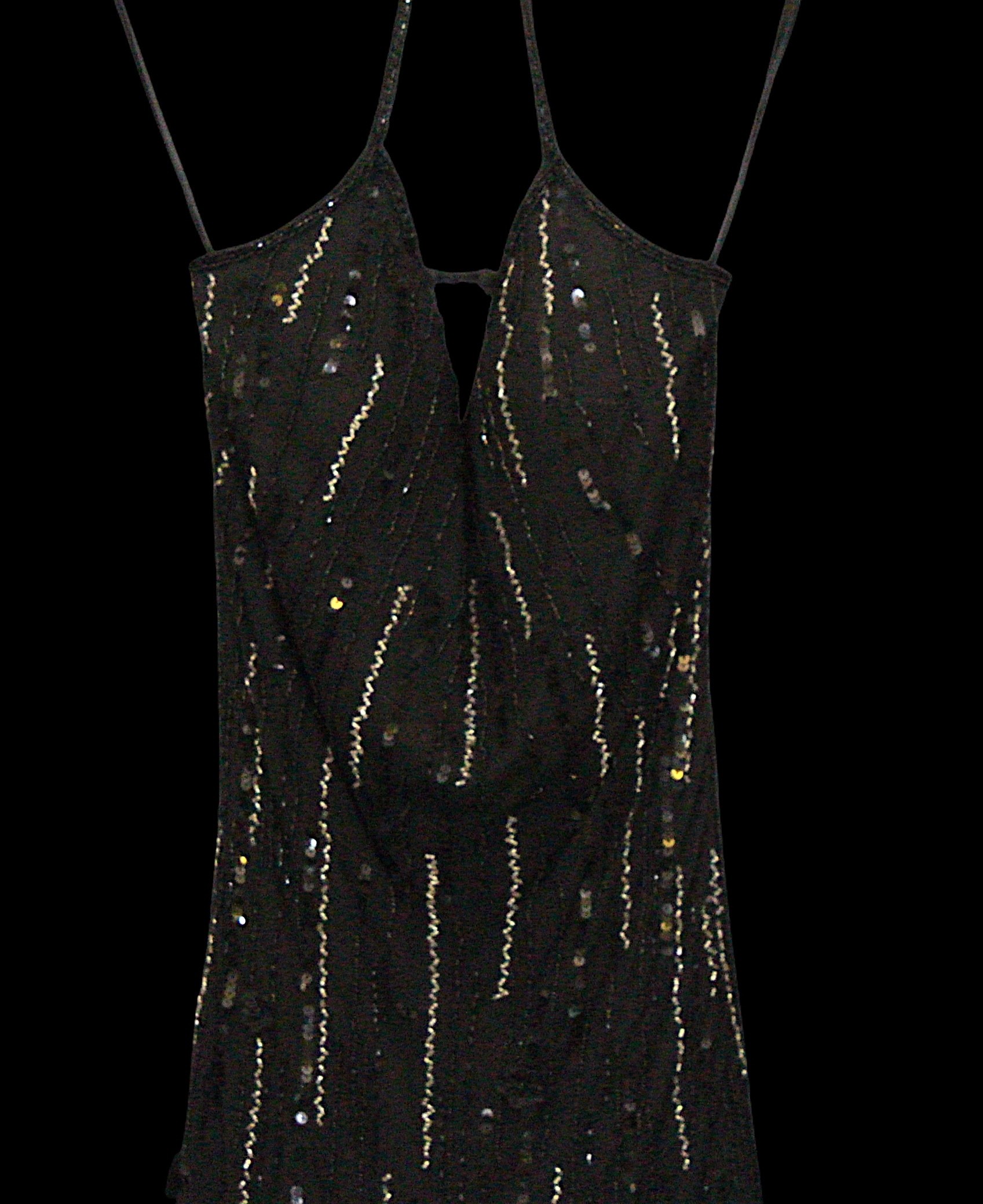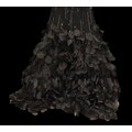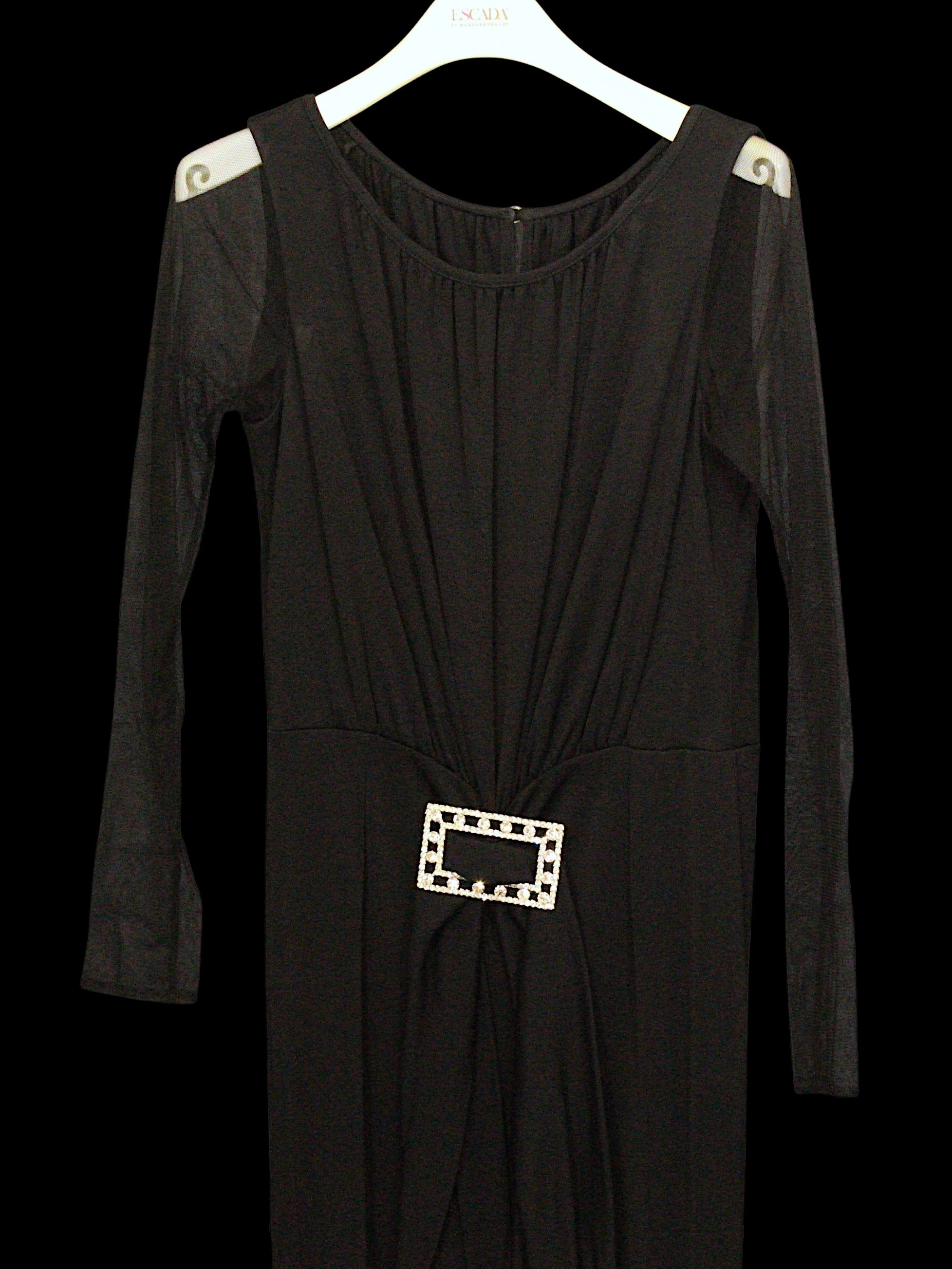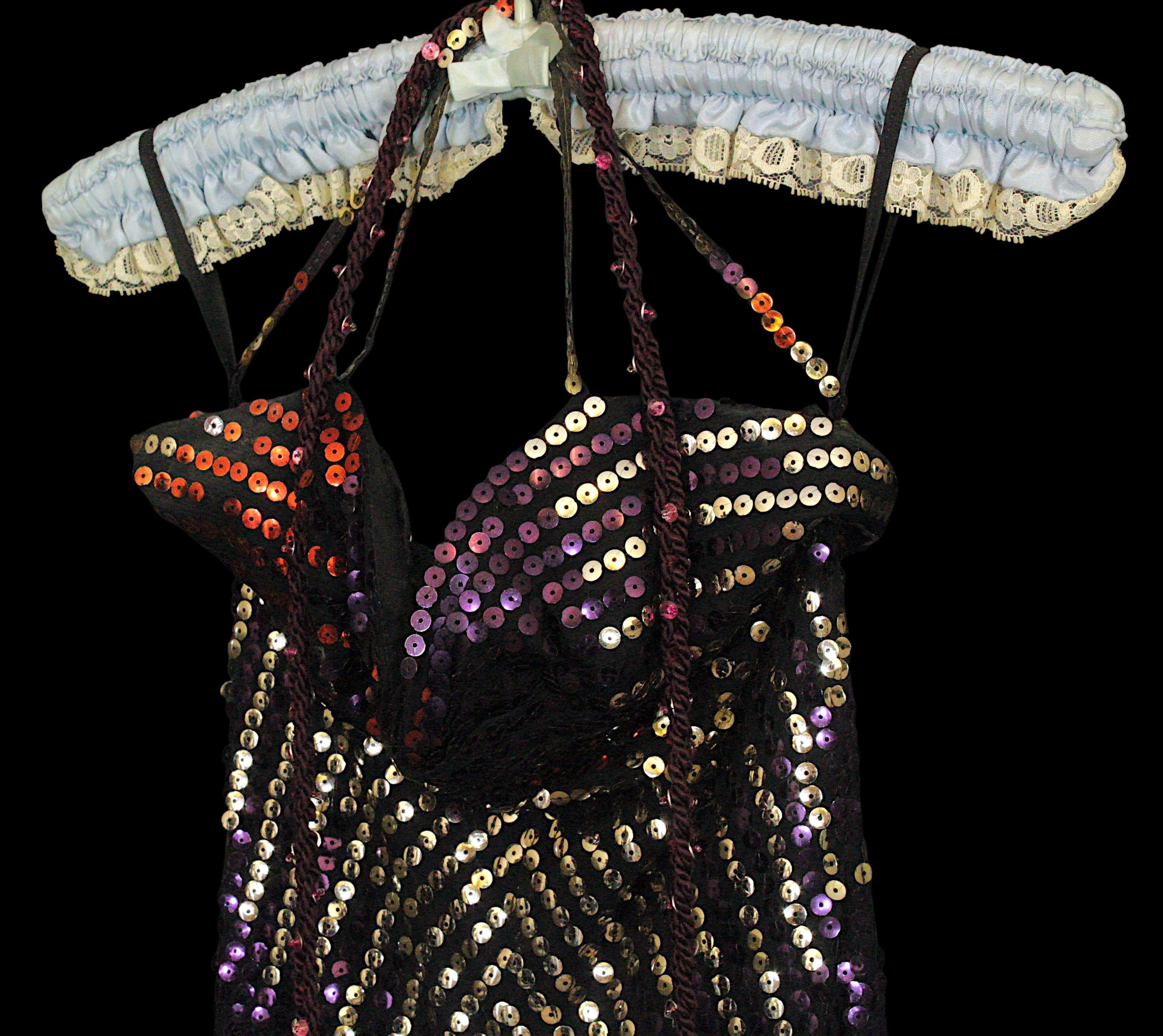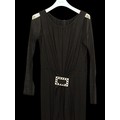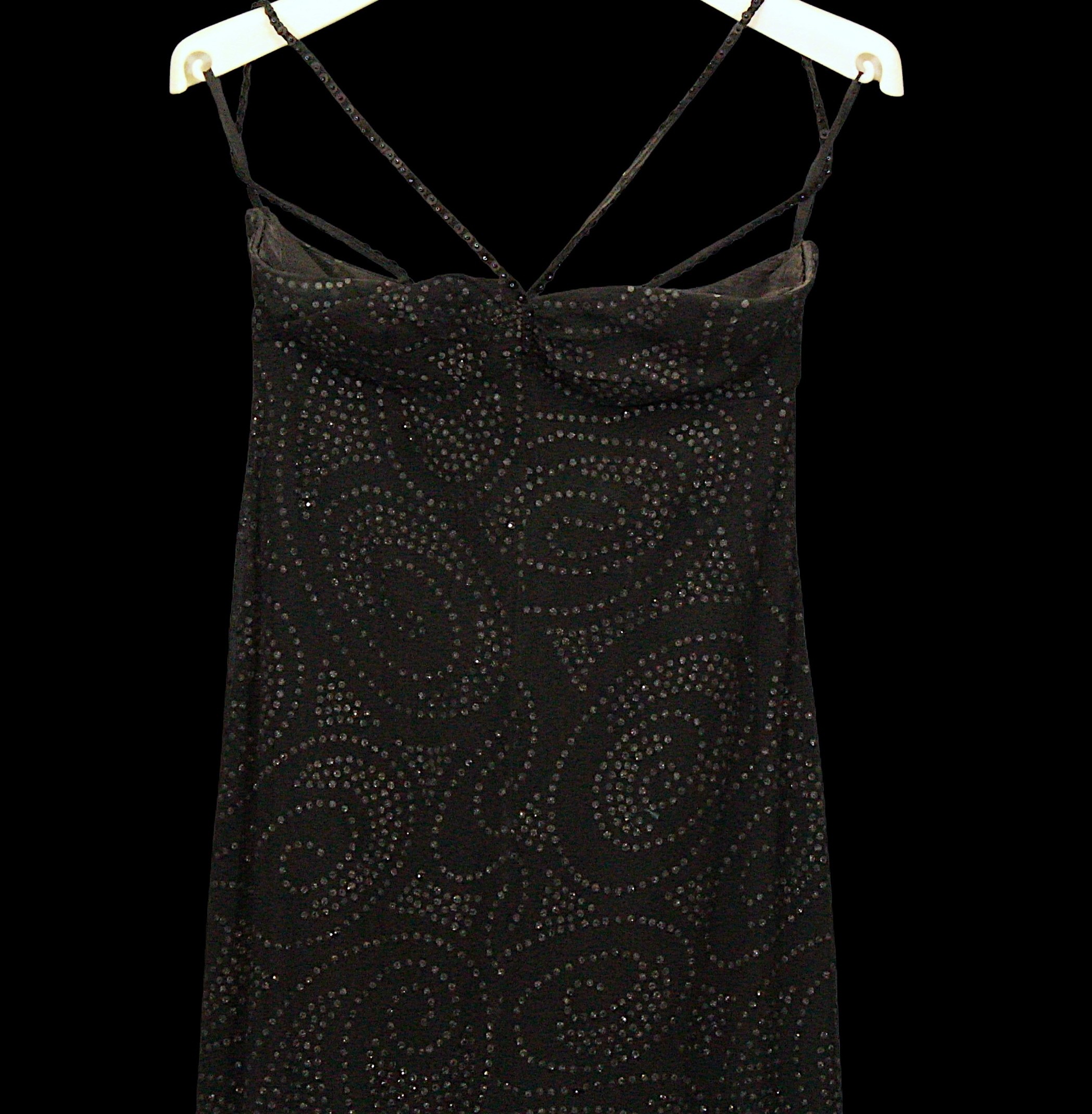 Evening Wear / Stage Costume: A collection of six items of evening wear, dark colours, c. 1960s - c. 2000s, including; a black chiffon effect full length halter tie gown and matching evening coat, embellished with silver, coat trimmed with feathers, dress waist flat approximately 33cm; a black maxi dress, with halter tie neckline, embellished with multicoloured sequins, waist flat approximately 38cm; a black maxi dress, sheer net sleeves, rhinestone buckle to front; a red sleeveless v-neck gown, overlaid with black chiffon type fabric and embellished with black beads, waist flat approximately 33cm; and a Jovani black gown, beaded spaghetti straps, with bodice decorated with black and silver beads and floral appliqué, skirt with circular taffeta appliqué, labelled size 8 (6)