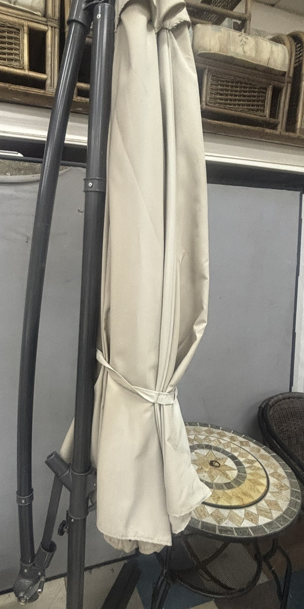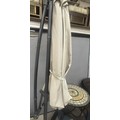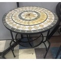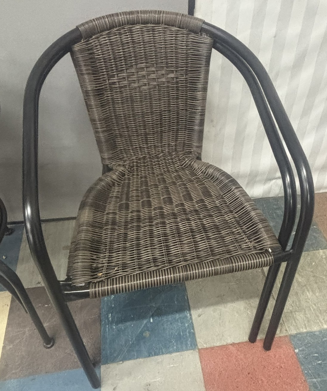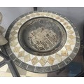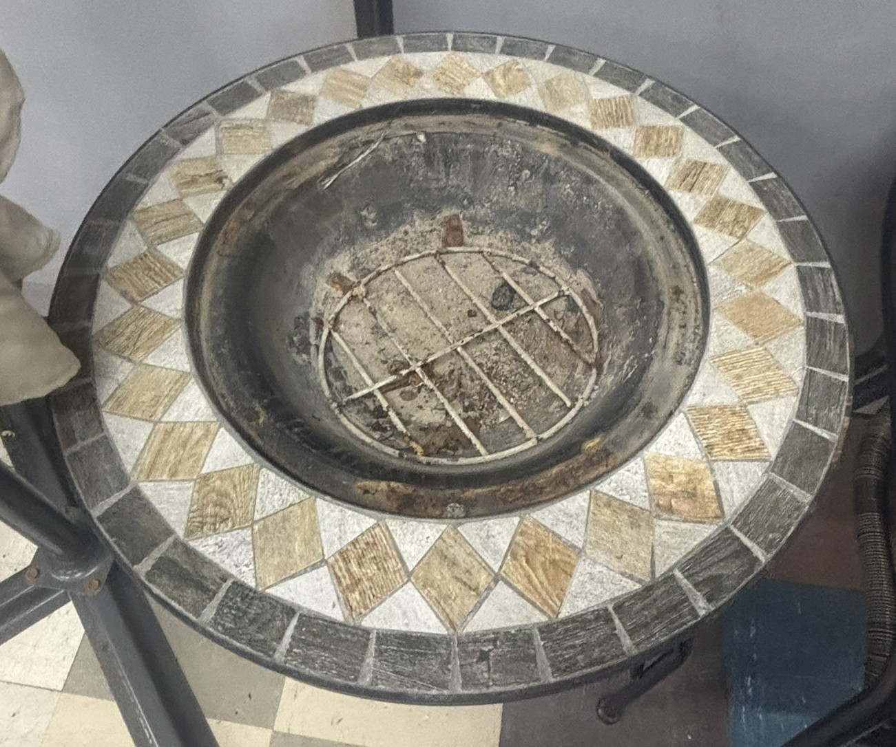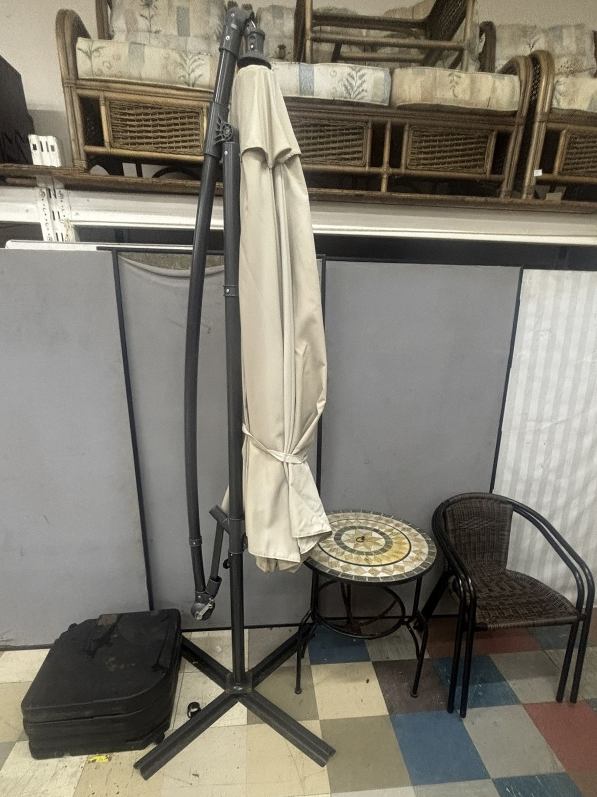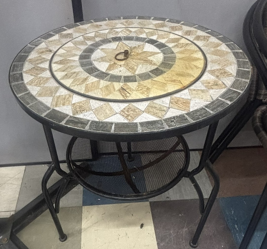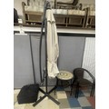 FIREPIT GARDEN TABLE, 2 METAL FRAME WOVEN CHAIRS, LARGE PARASOL & BASE PLUS A SET OF 4 PARASOL BASES