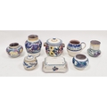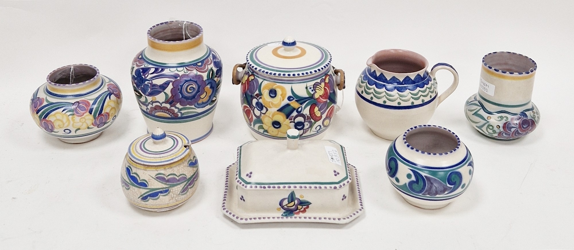 Collection of Poole Pottery, impressed Carter, Stabler & Adams Ltd, various painted initials and numerals, painted in a bright palette with flowers, swags and leaves, including: vases, a two-handled jar and cover, a jug, a sugar bowl and cover and a butter-tub cover and stand (8)