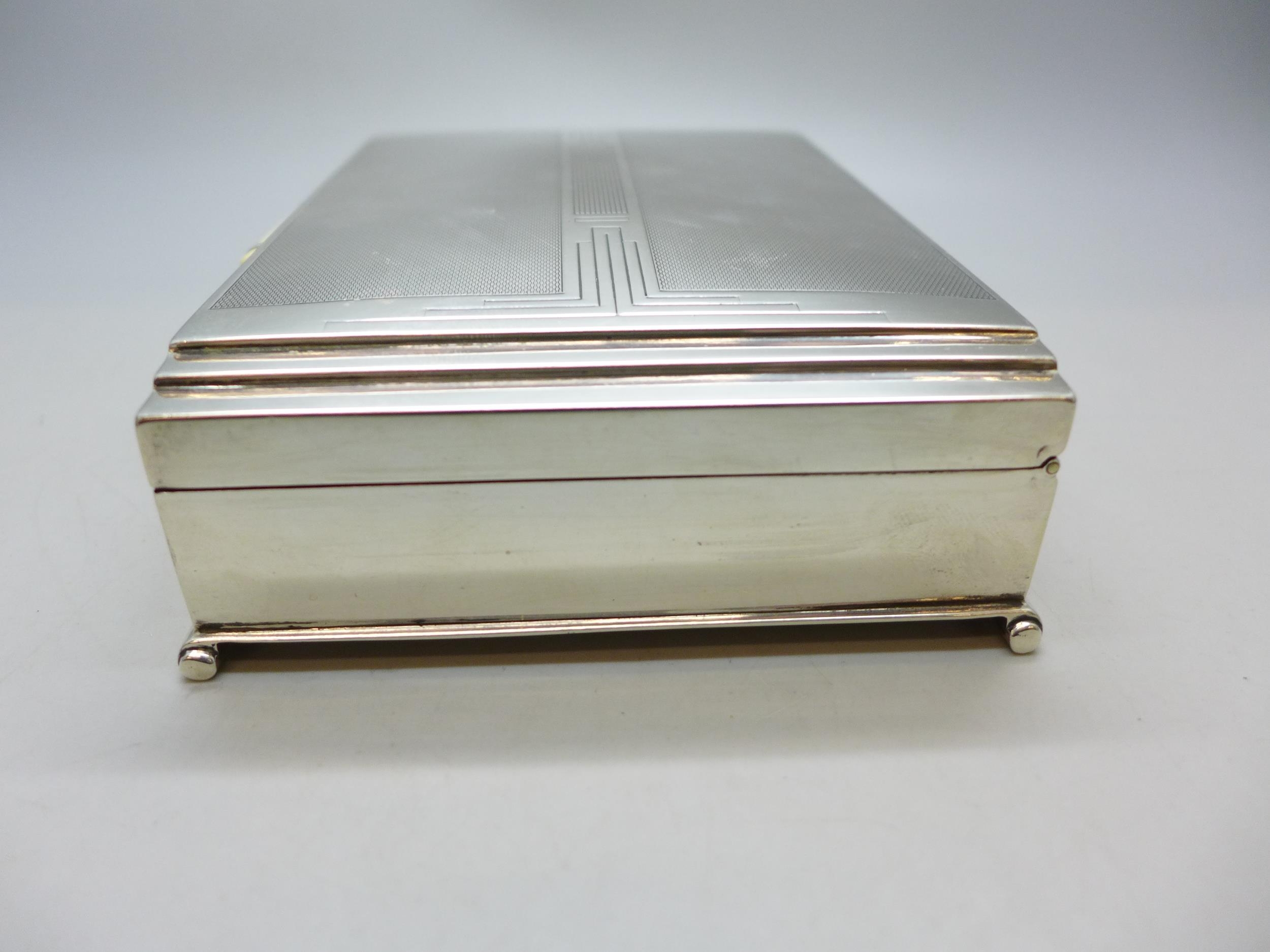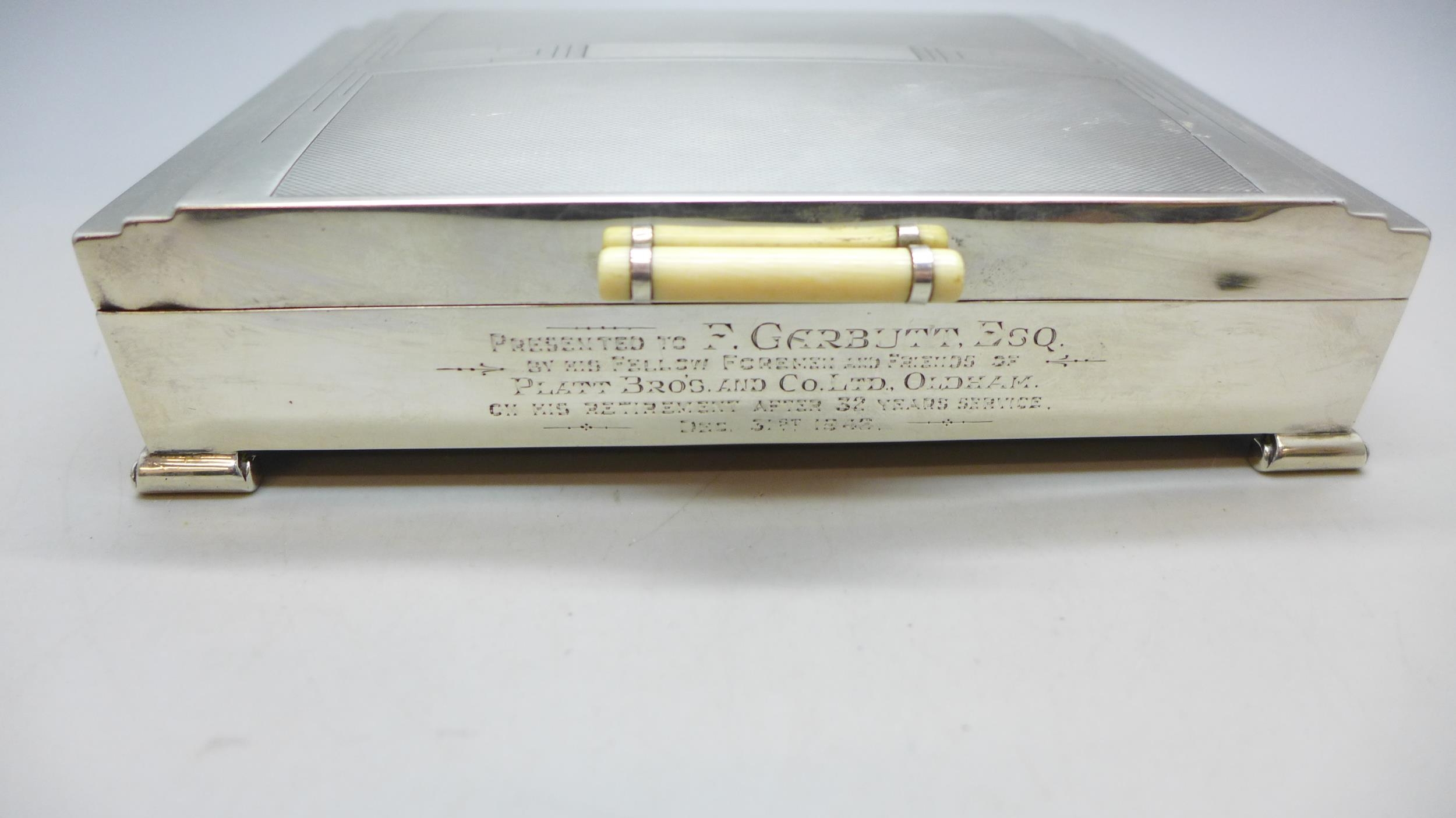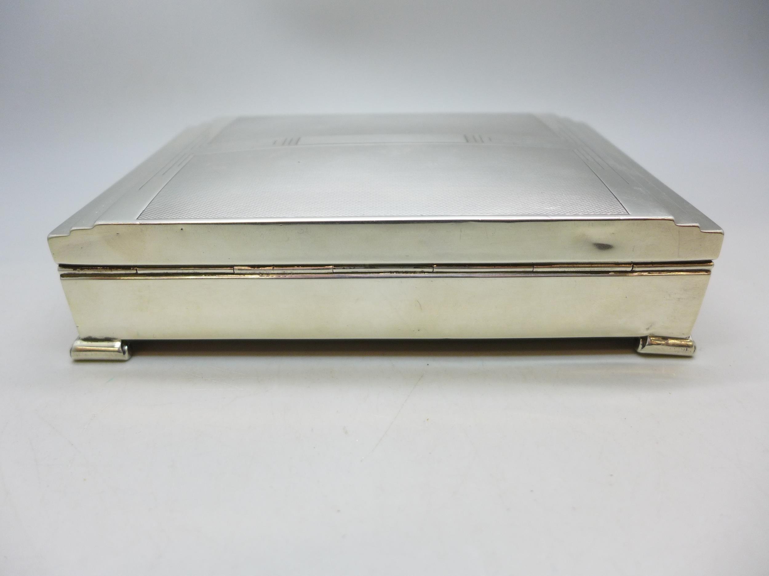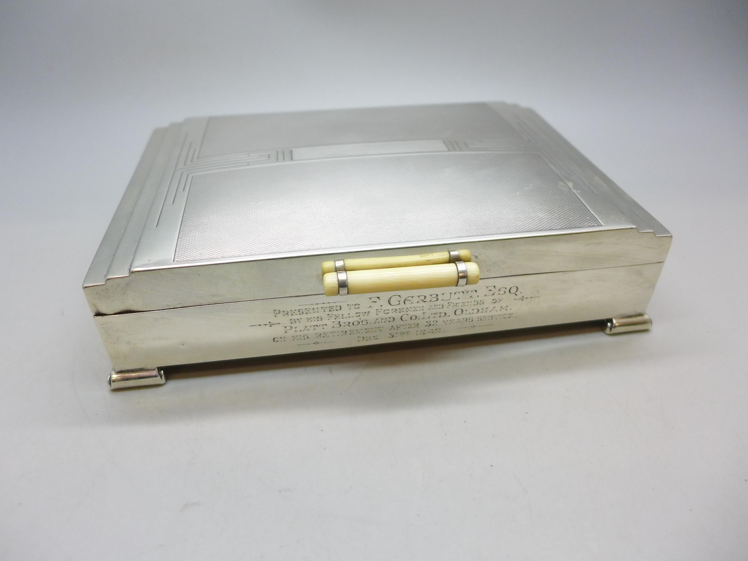 An Art Deco silver cigarette box with stepped form and engine turned design, with personalised long service inscription, maker's mark worn, Birmingham, 1936, 16.1 x 10.9cm, 535g, with Non-Transferable Standard Ivory Declaration, no. HBU4K1AN