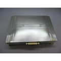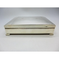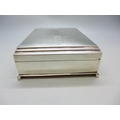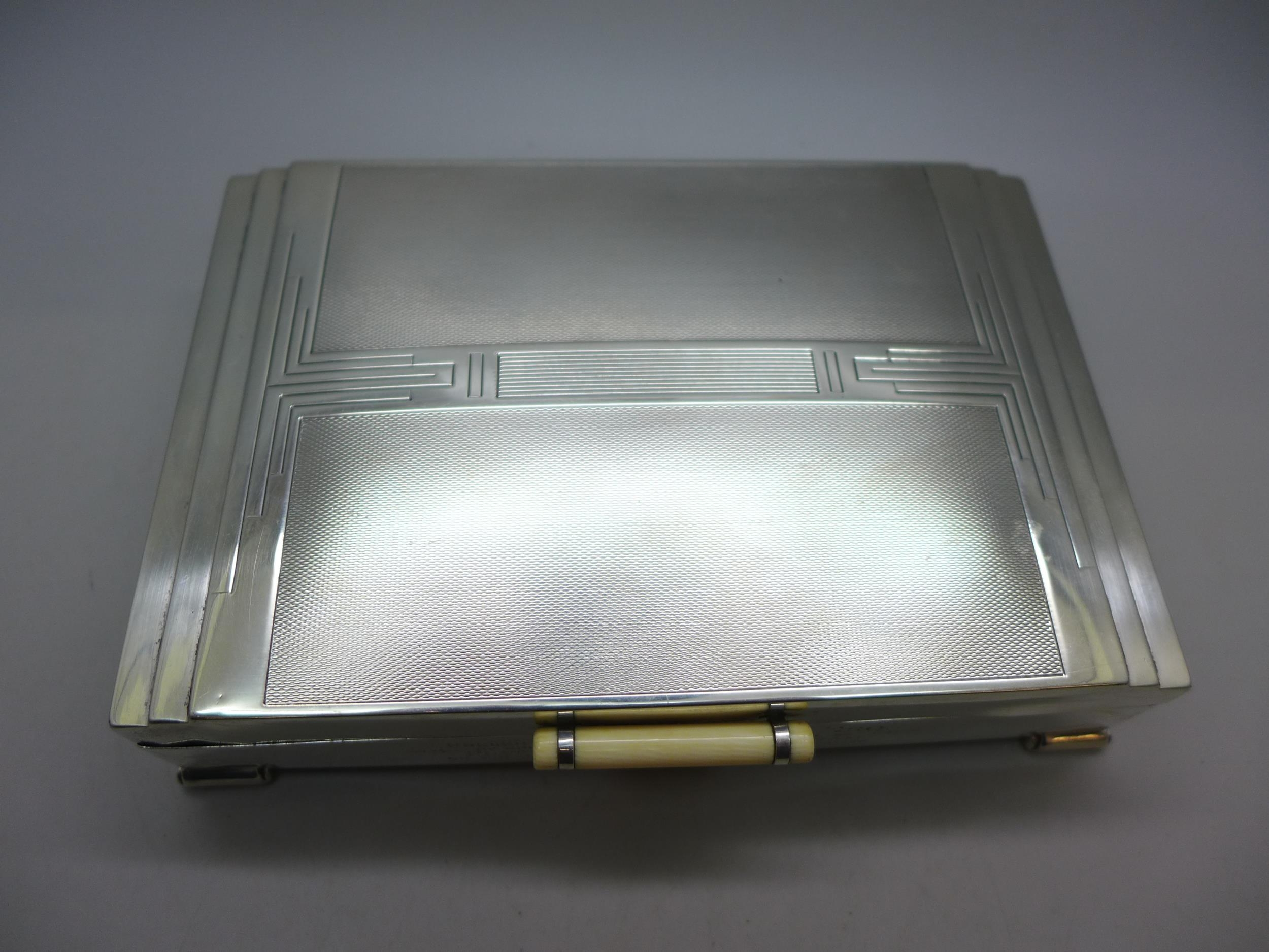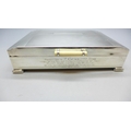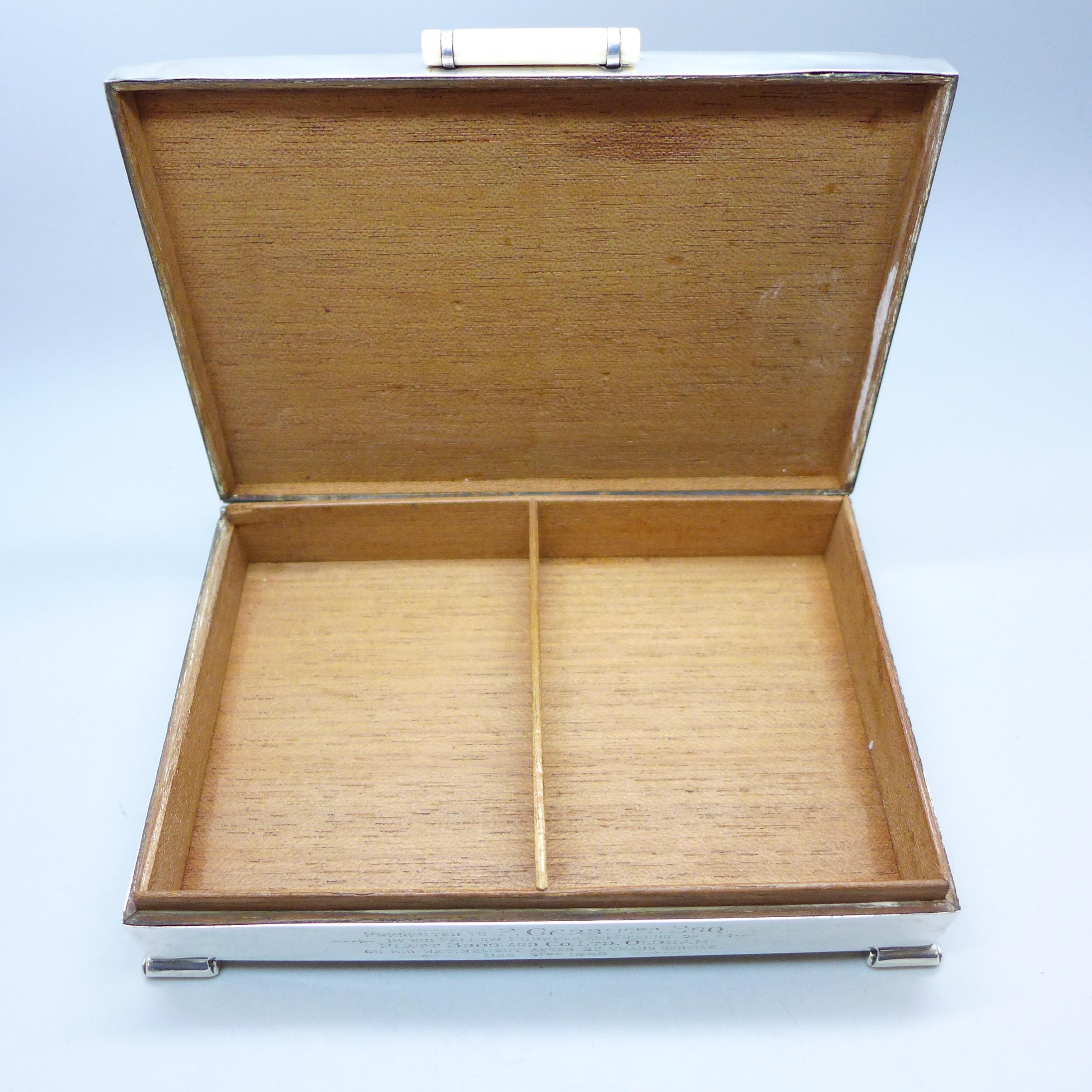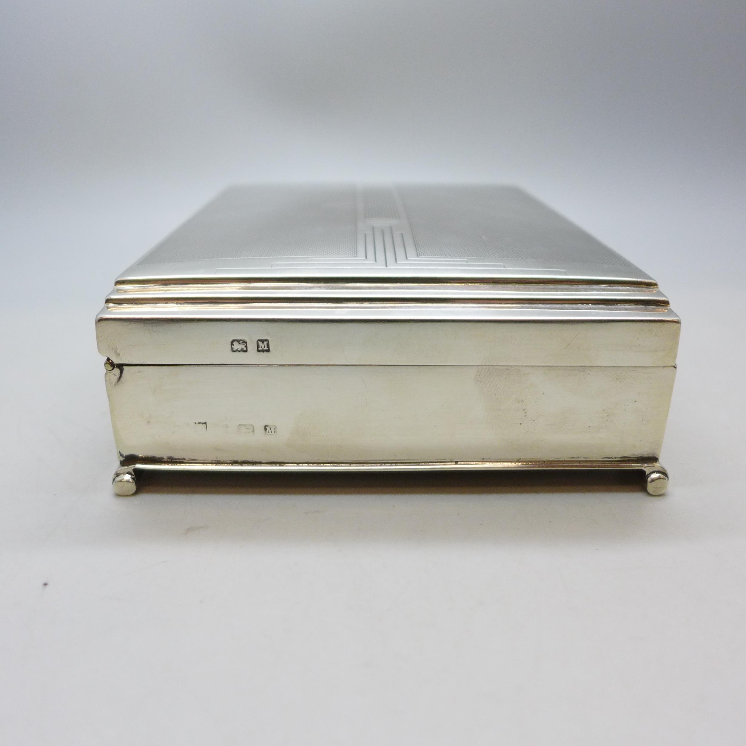 An Art Deco silver cigarette box with stepped form and engine turned design, with personalised long service inscription, maker's mark worn, Birmingham, 1936, 16.1 x 10.9cm, 535g, with Non-Transferable Standard Ivory Declaration, no. HBU4K1AN