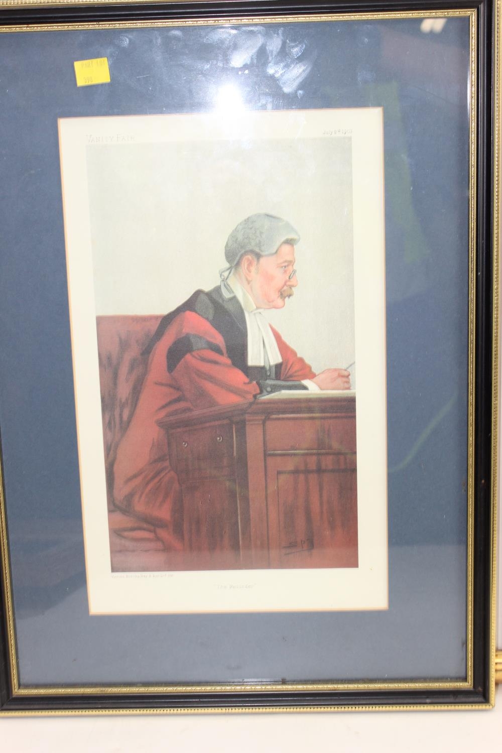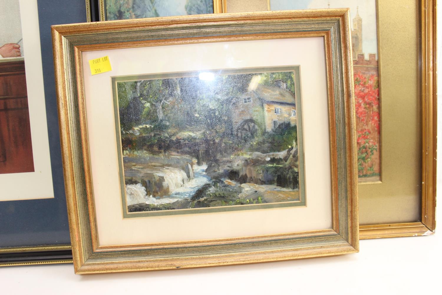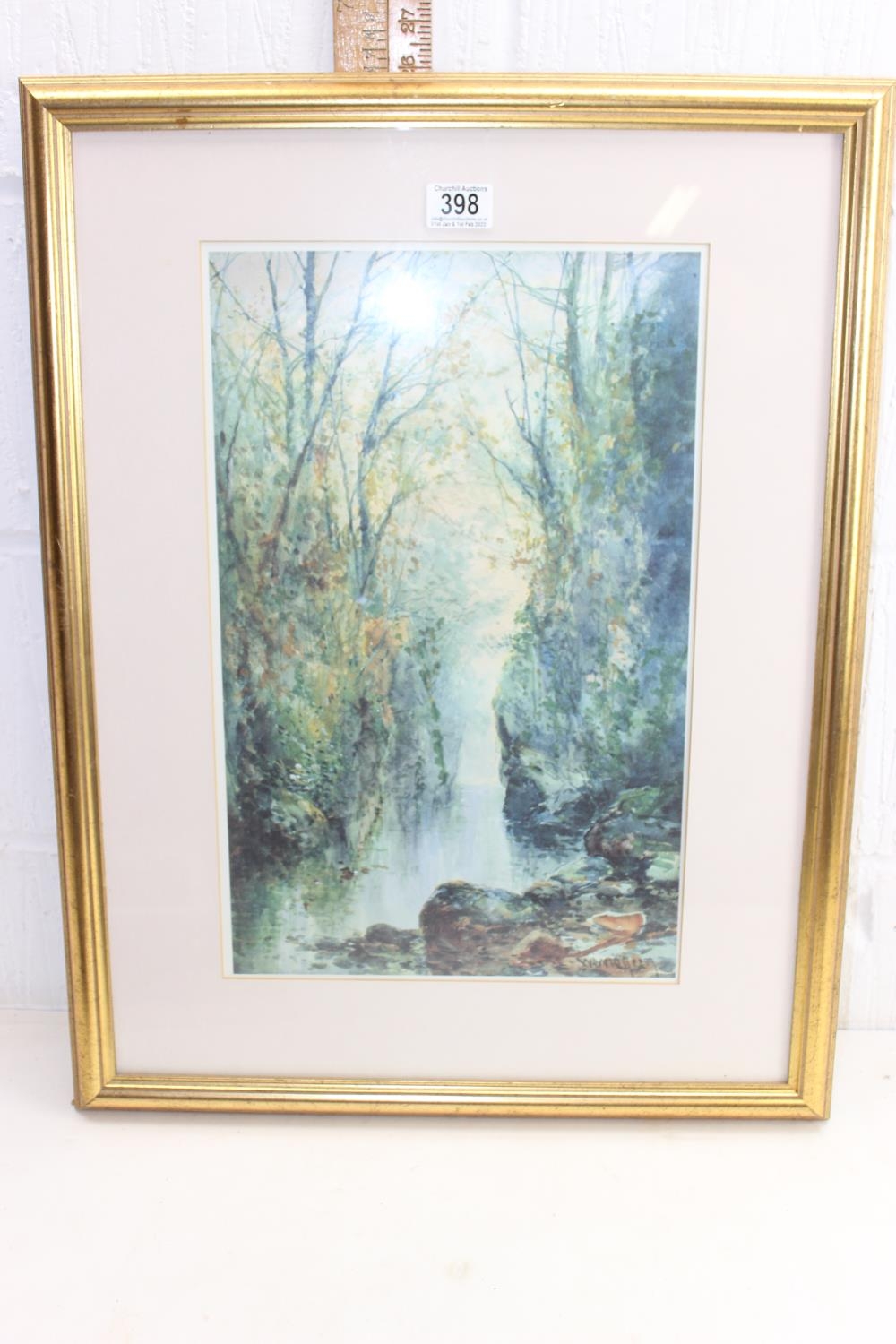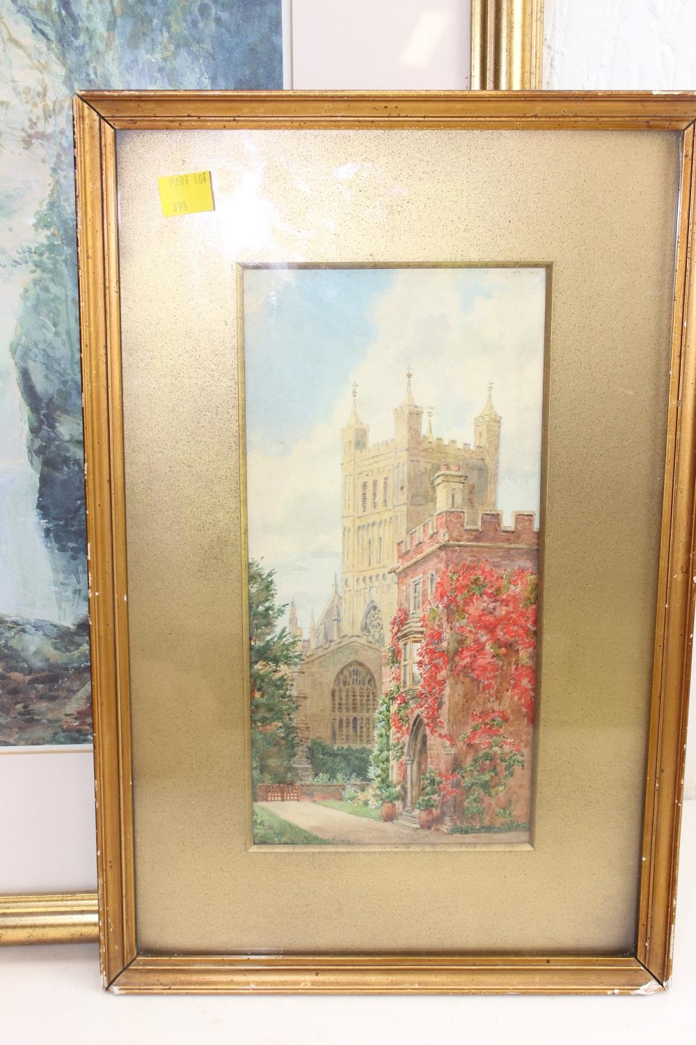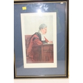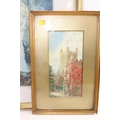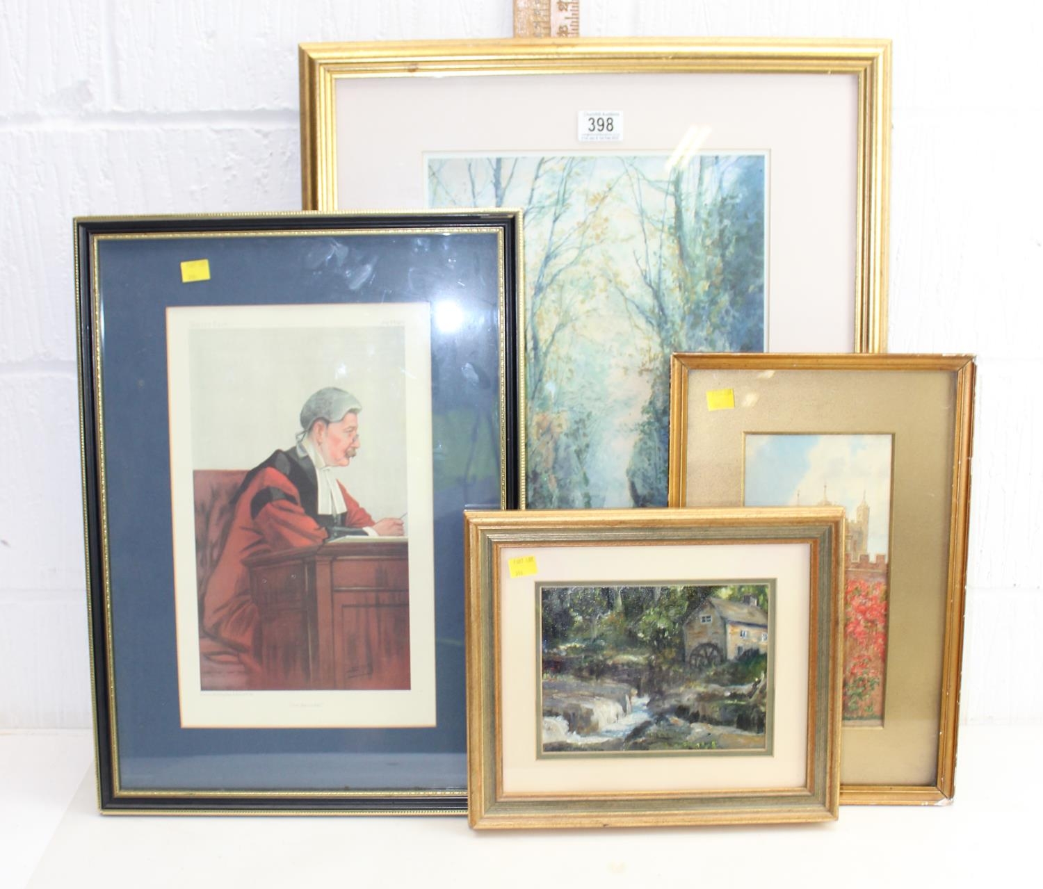 4 assorted pictures, a well-executed framed watercolour of a turreted cathedral – possibly Lincoln signed M Harding, framed and mounted oil on board of a mill with water wheel by B Higgleton, Edwardian framed and mounted Vanity Fair colour print of ‘The Recorder’ Spy edition & a large framed signed print of a forest with river scene.