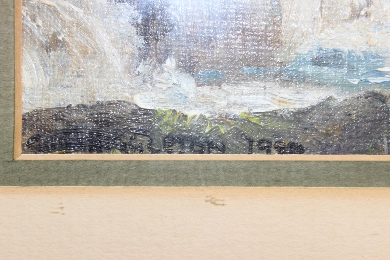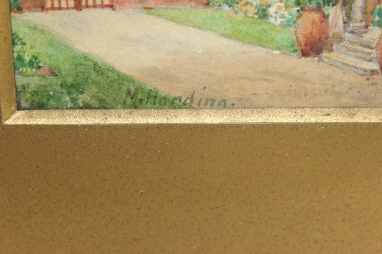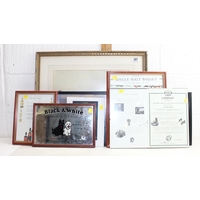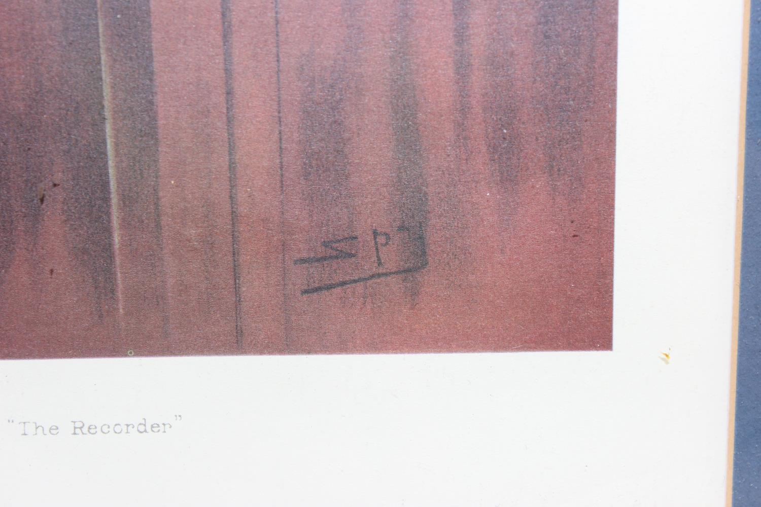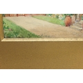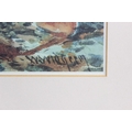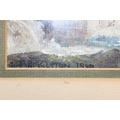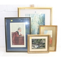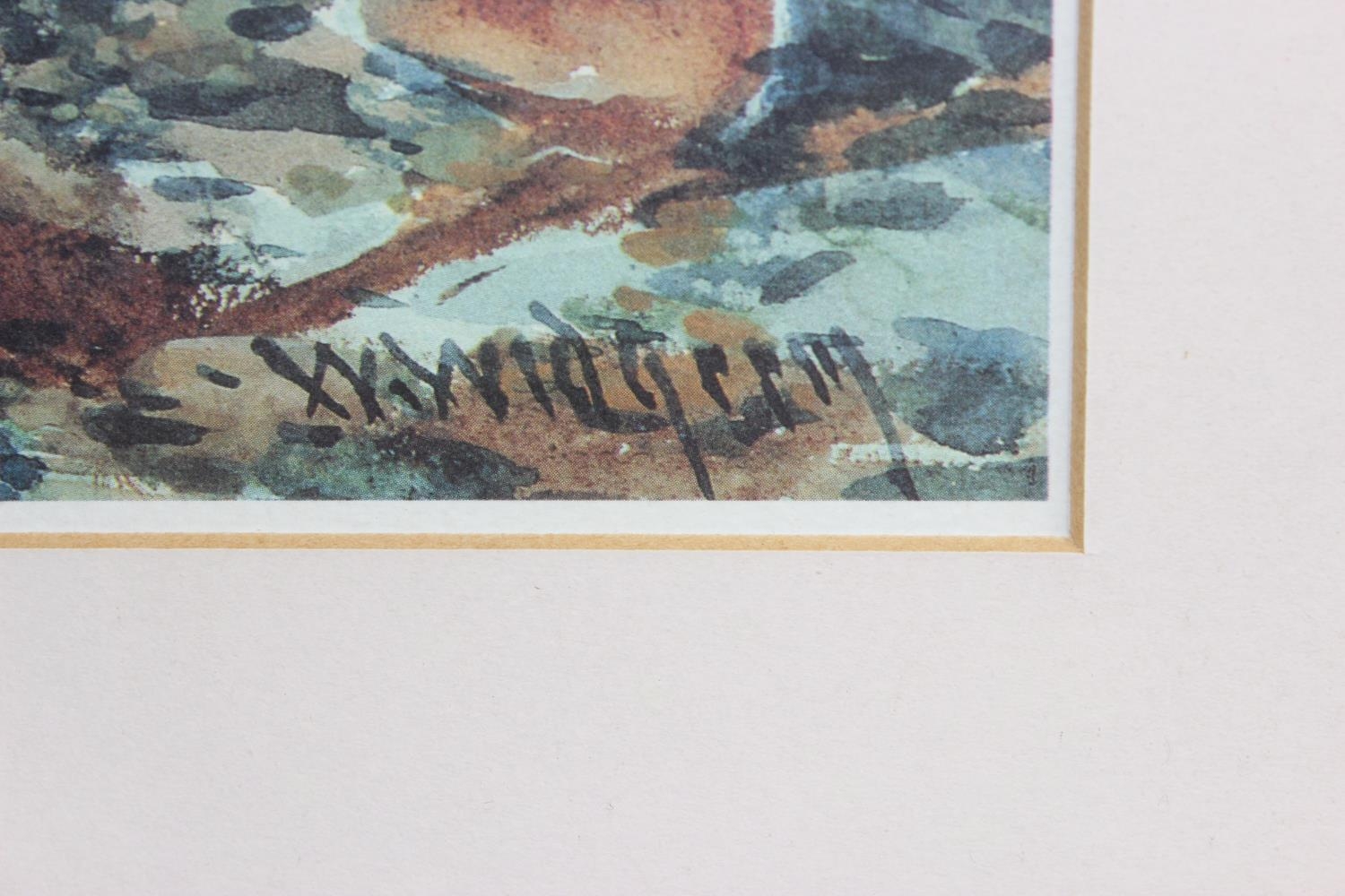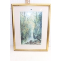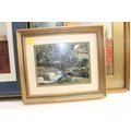 4 assorted pictures, a well-executed framed watercolour of a turreted cathedral – possibly Lincoln signed M Harding, framed and mounted oil on board of a mill with water wheel by B Higgleton, Edwardian framed and mounted Vanity Fair colour print of ‘The Recorder’ Spy edition & a large framed signed print of a forest with river scene.
