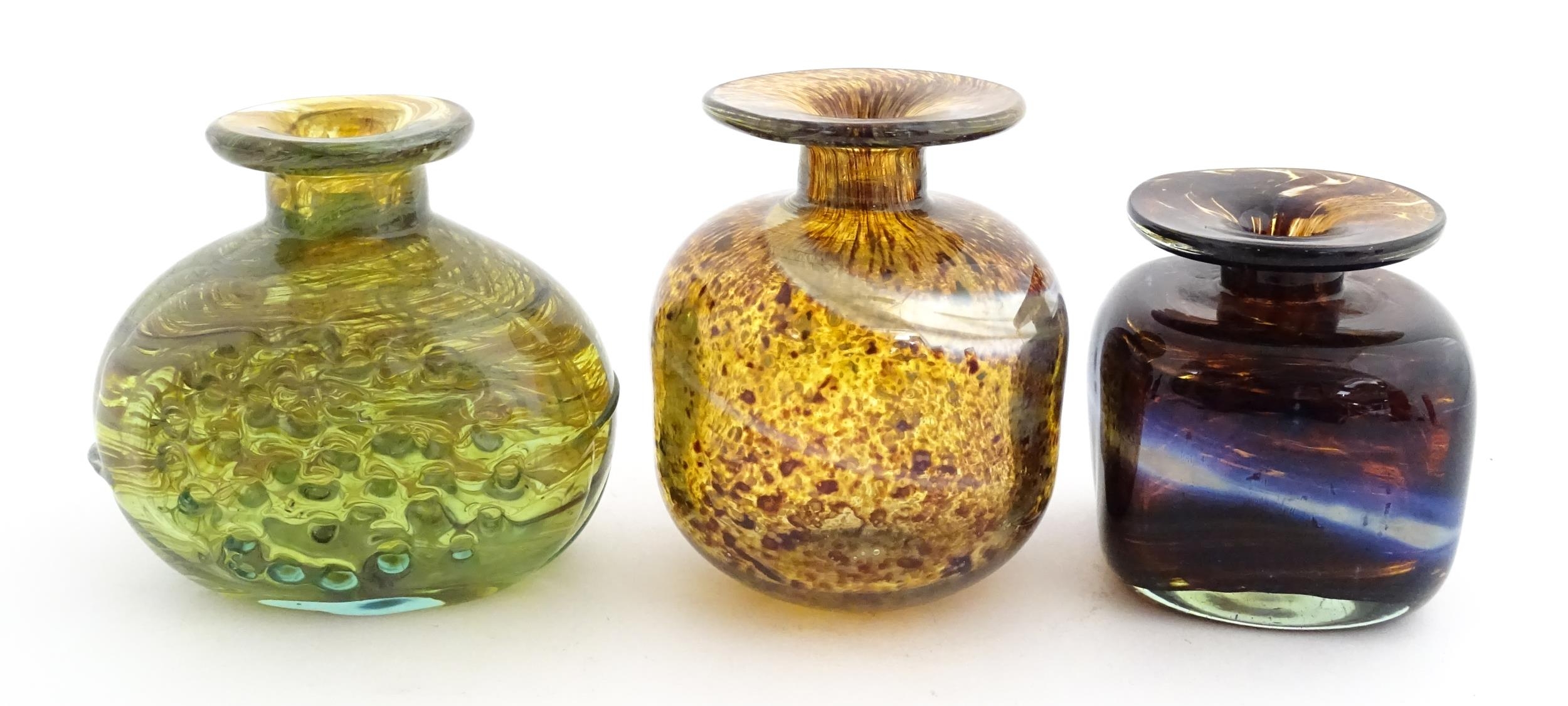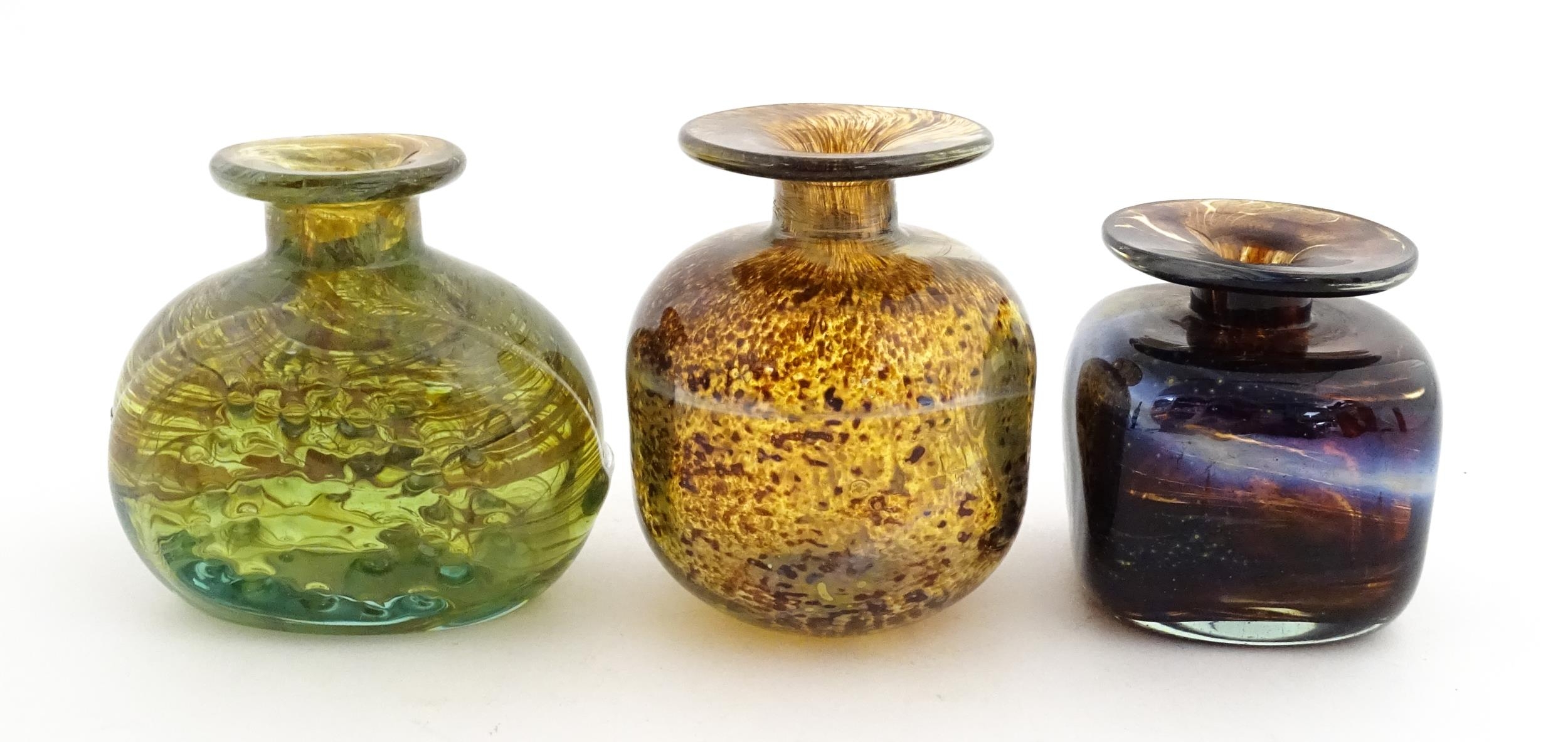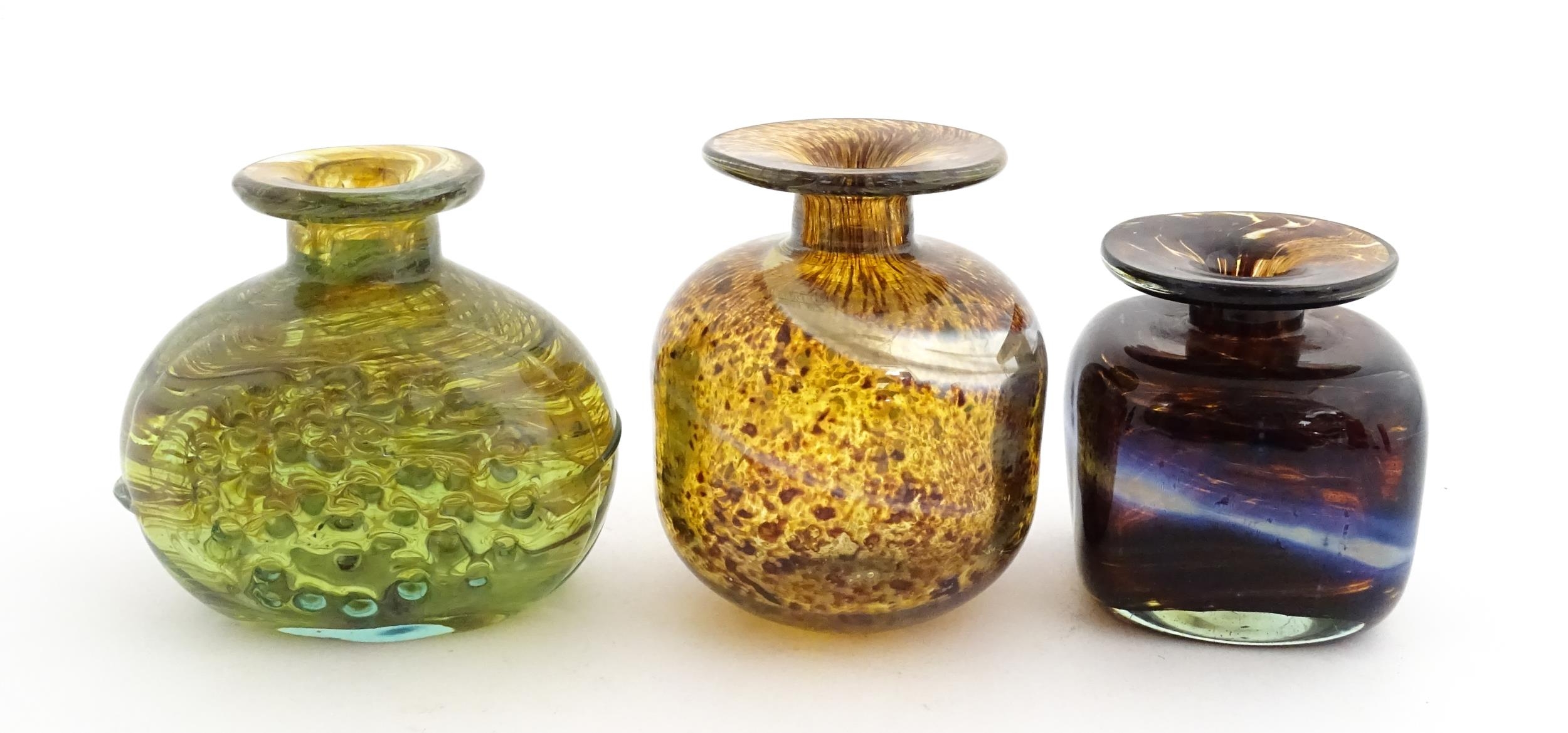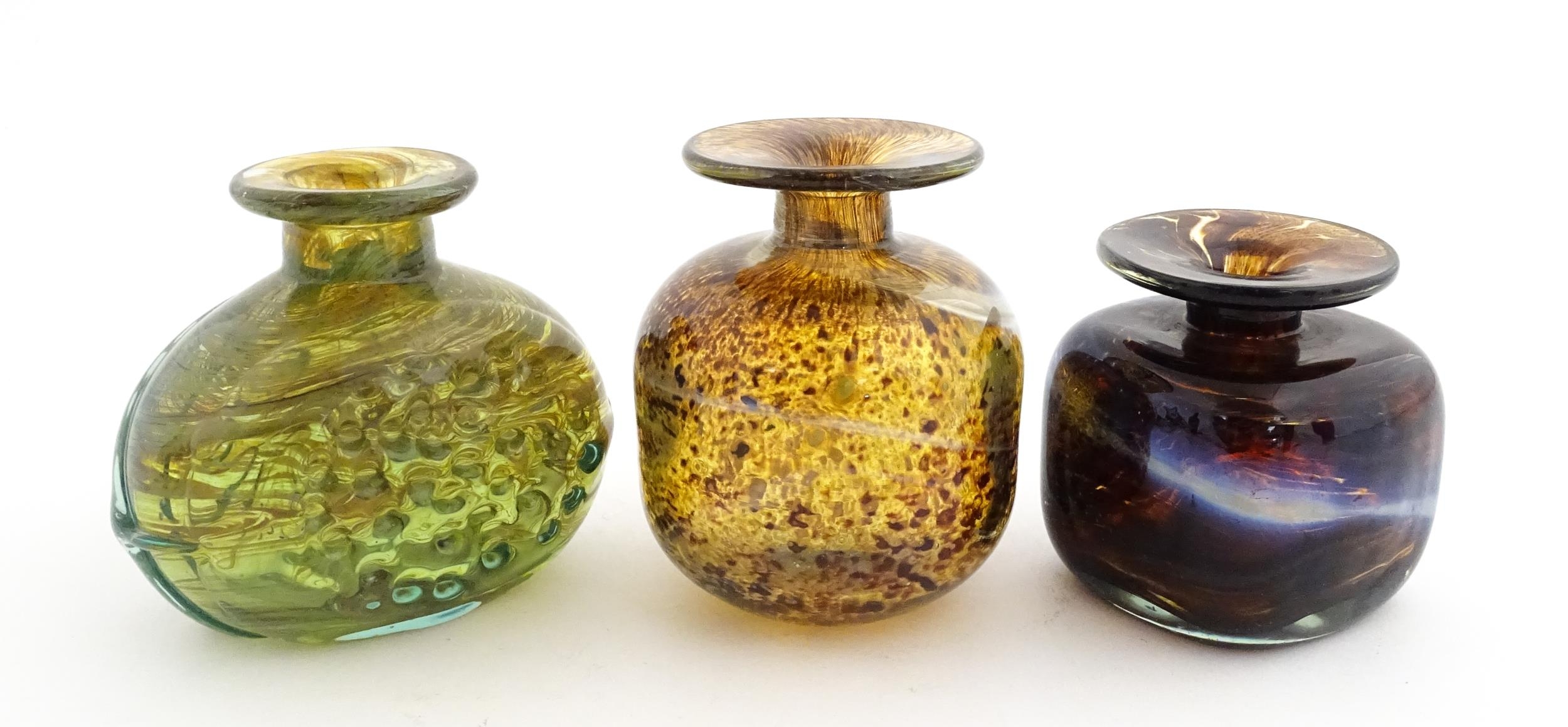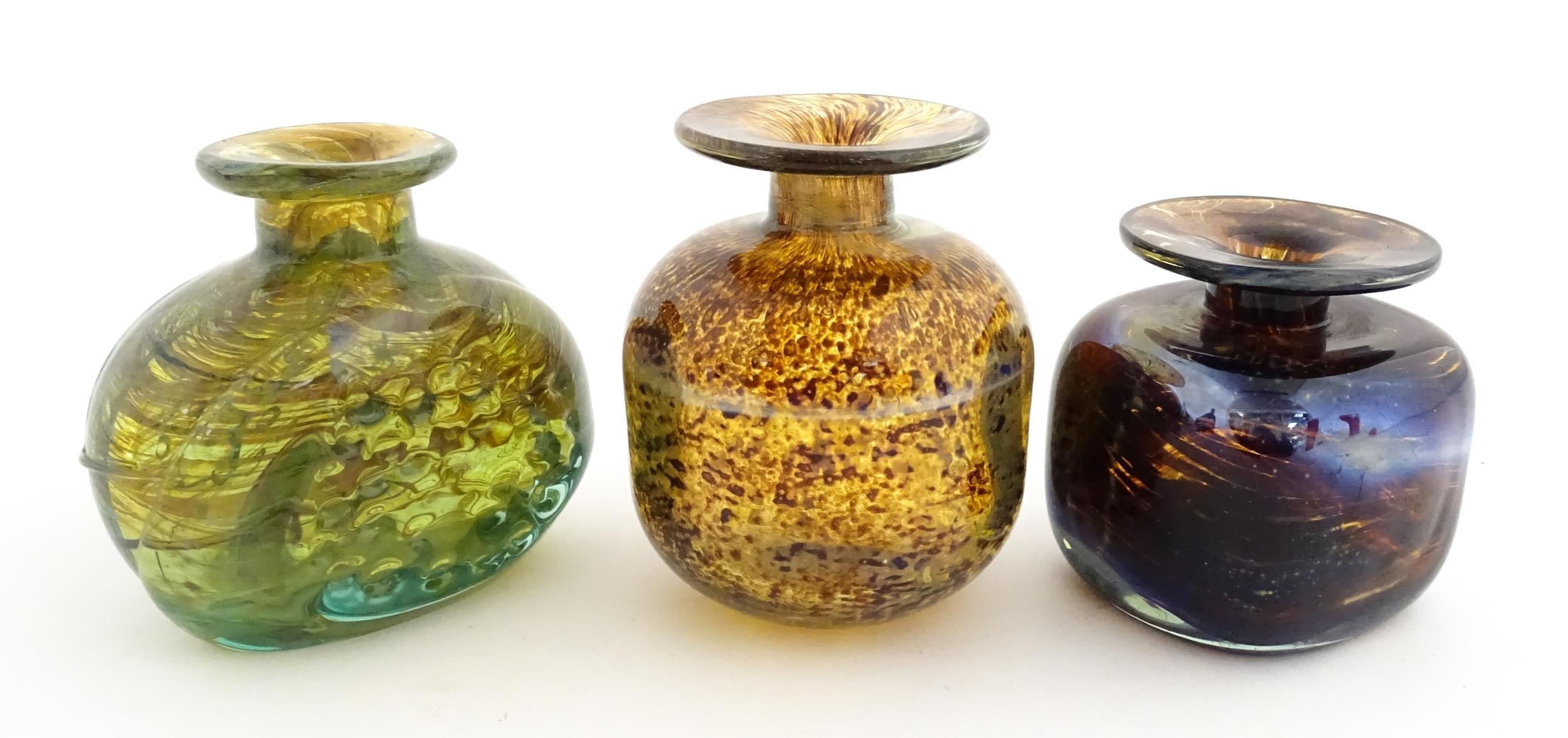 A Mdina glass squat vase, signed under. Together with two further art / studio glass vases, one with textured detail. Unsigned. The tallest approx 40 1/4" high (3)