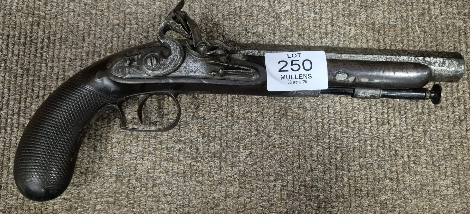 AN ANTIQUE FLINTLOCK PISTOL Signed Grierson with a chequered walnut handle and original ram rod
