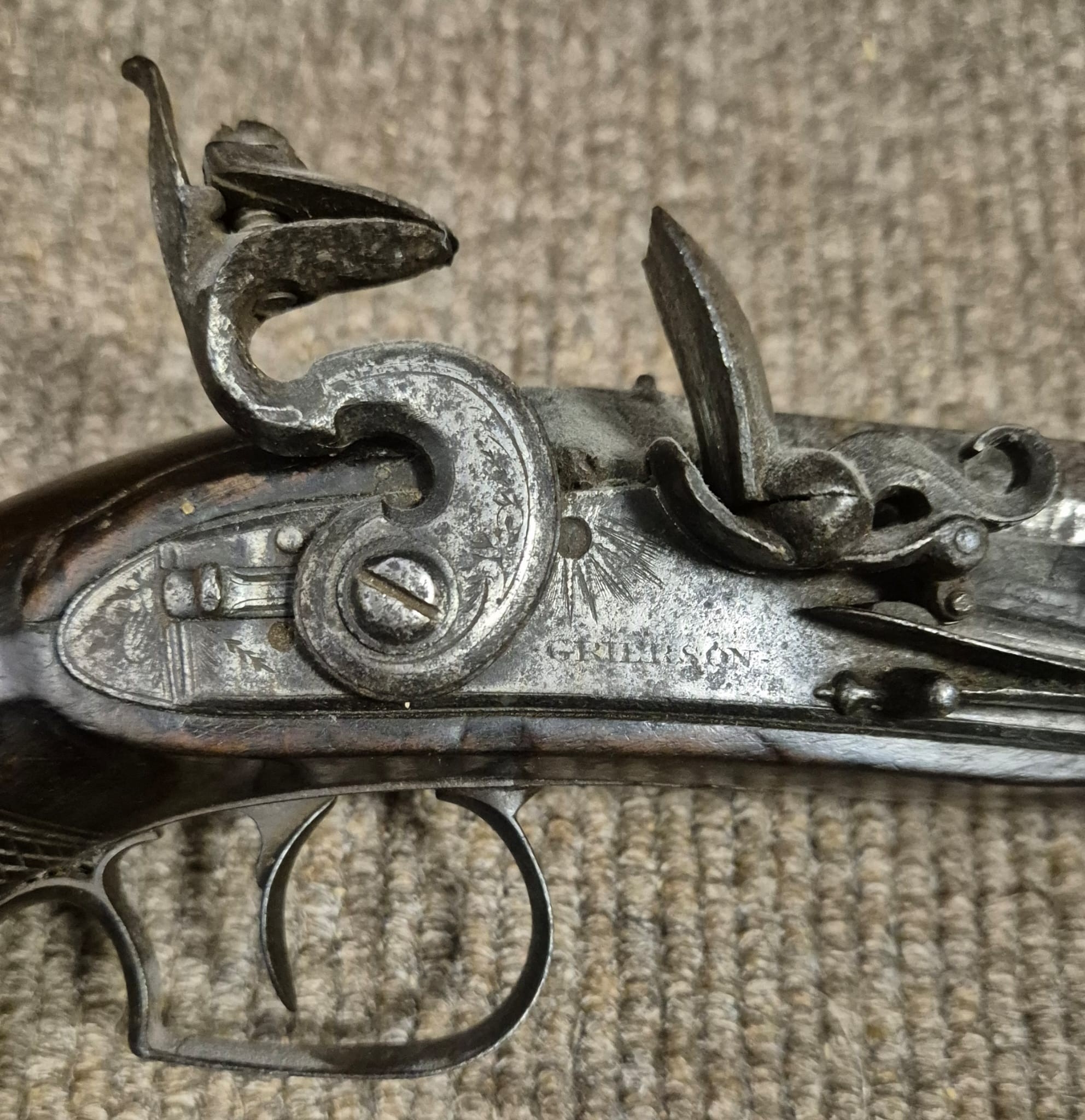 AN ANTIQUE FLINTLOCK PISTOL Signed Grierson with a chequered...