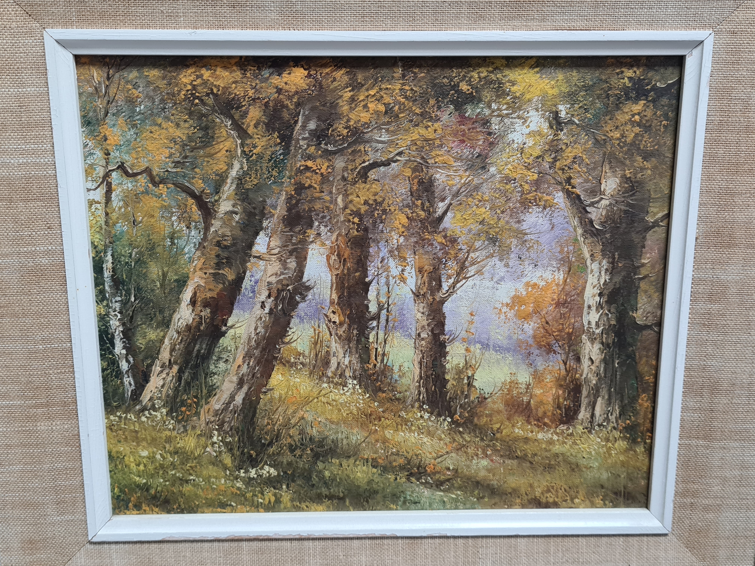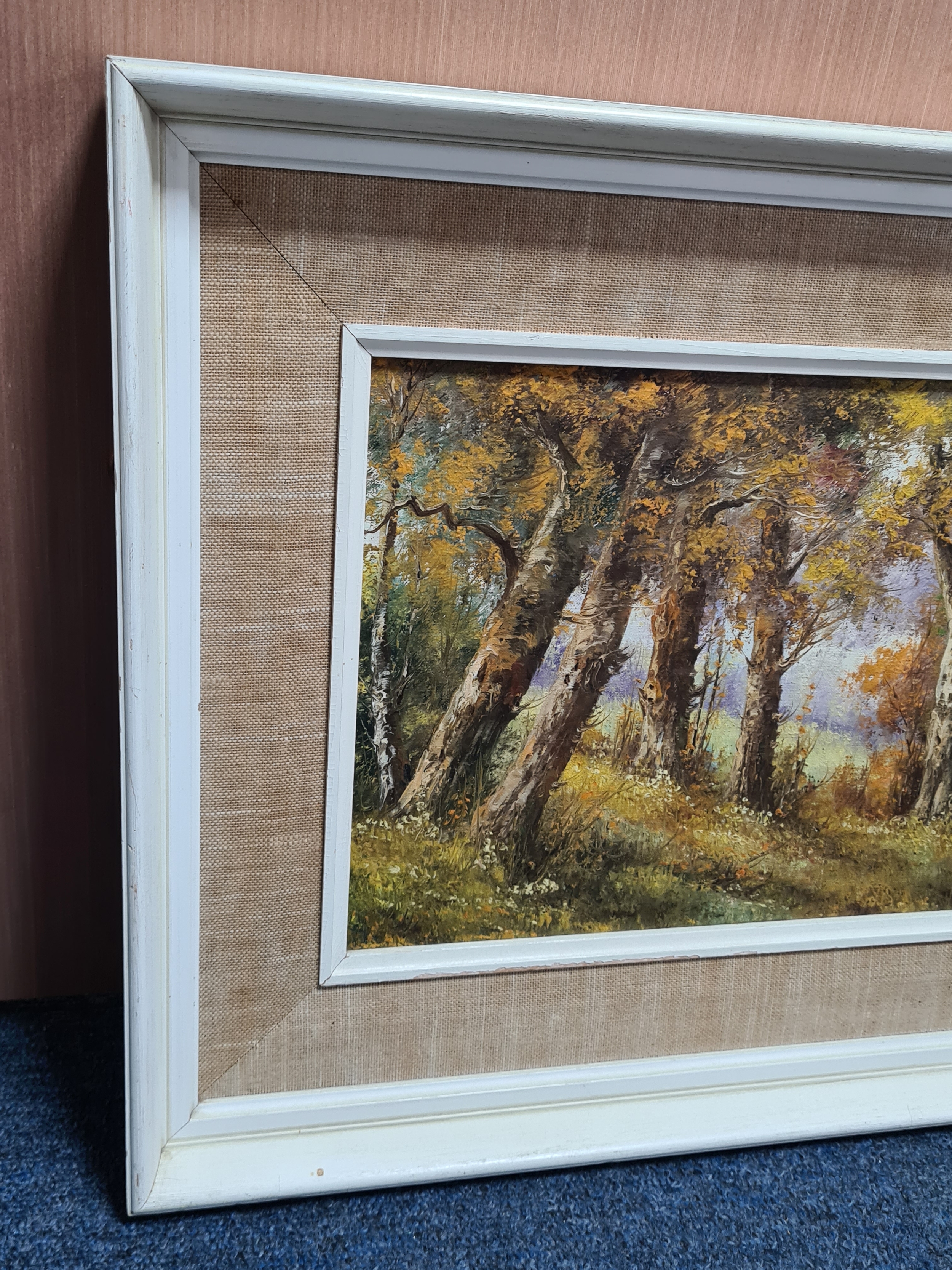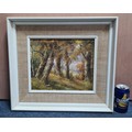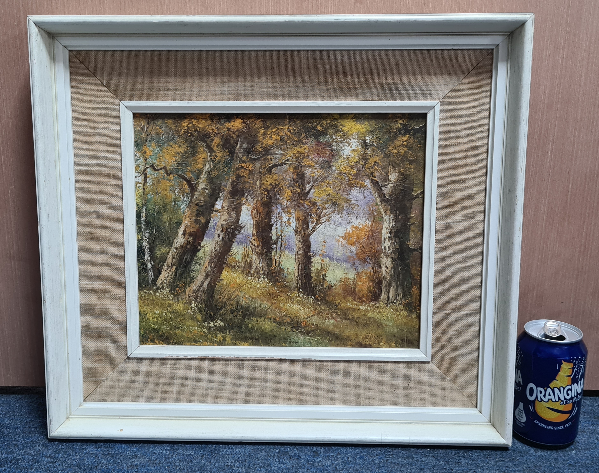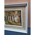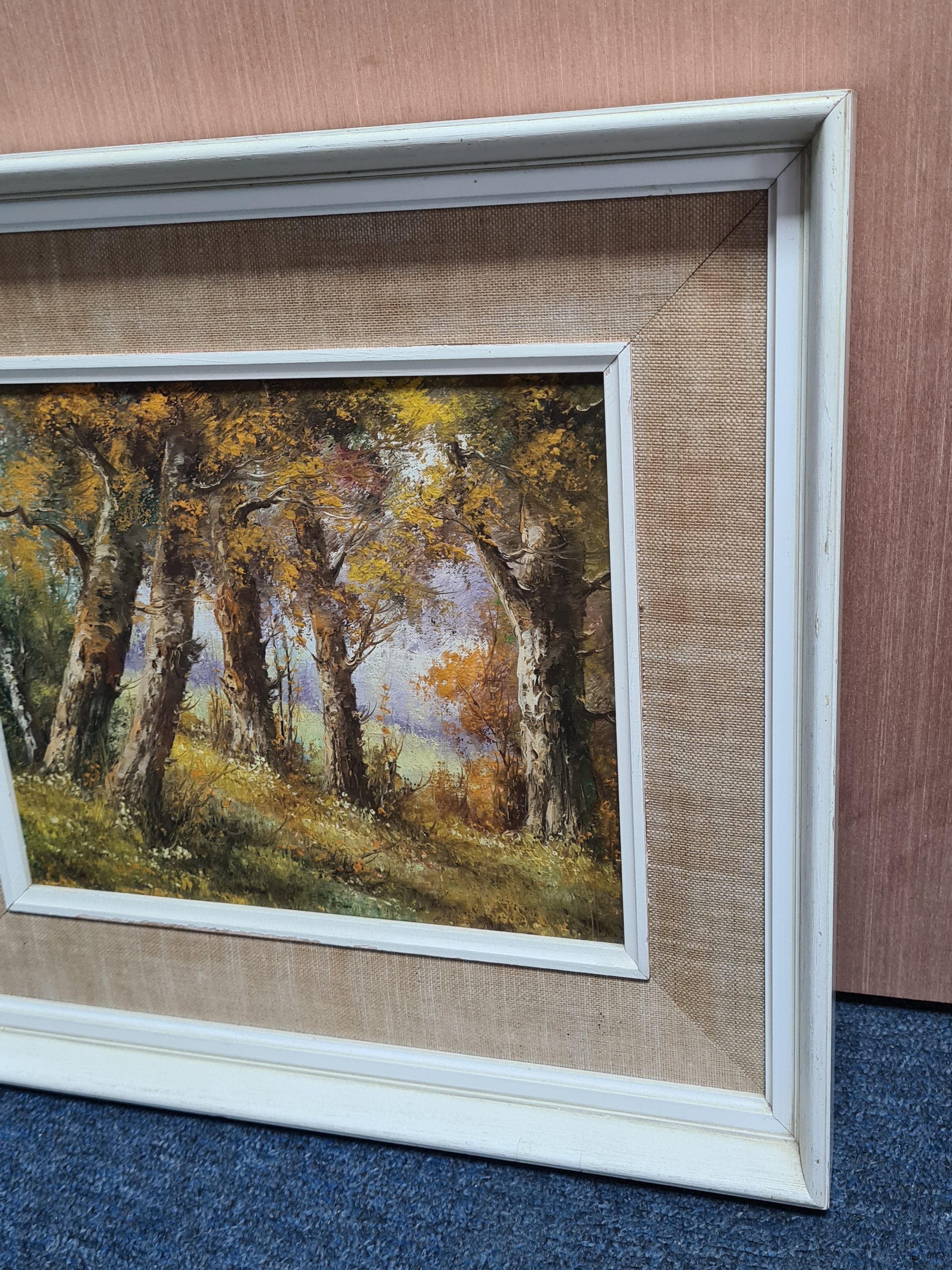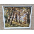 Framed mid century Oil landscape painting of a autumnal woodland, signed but illegible. Measures H41cm x46cm.