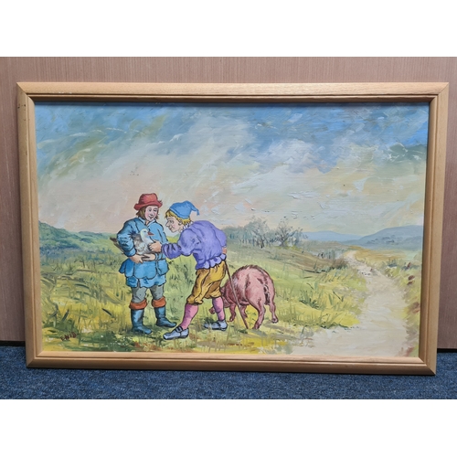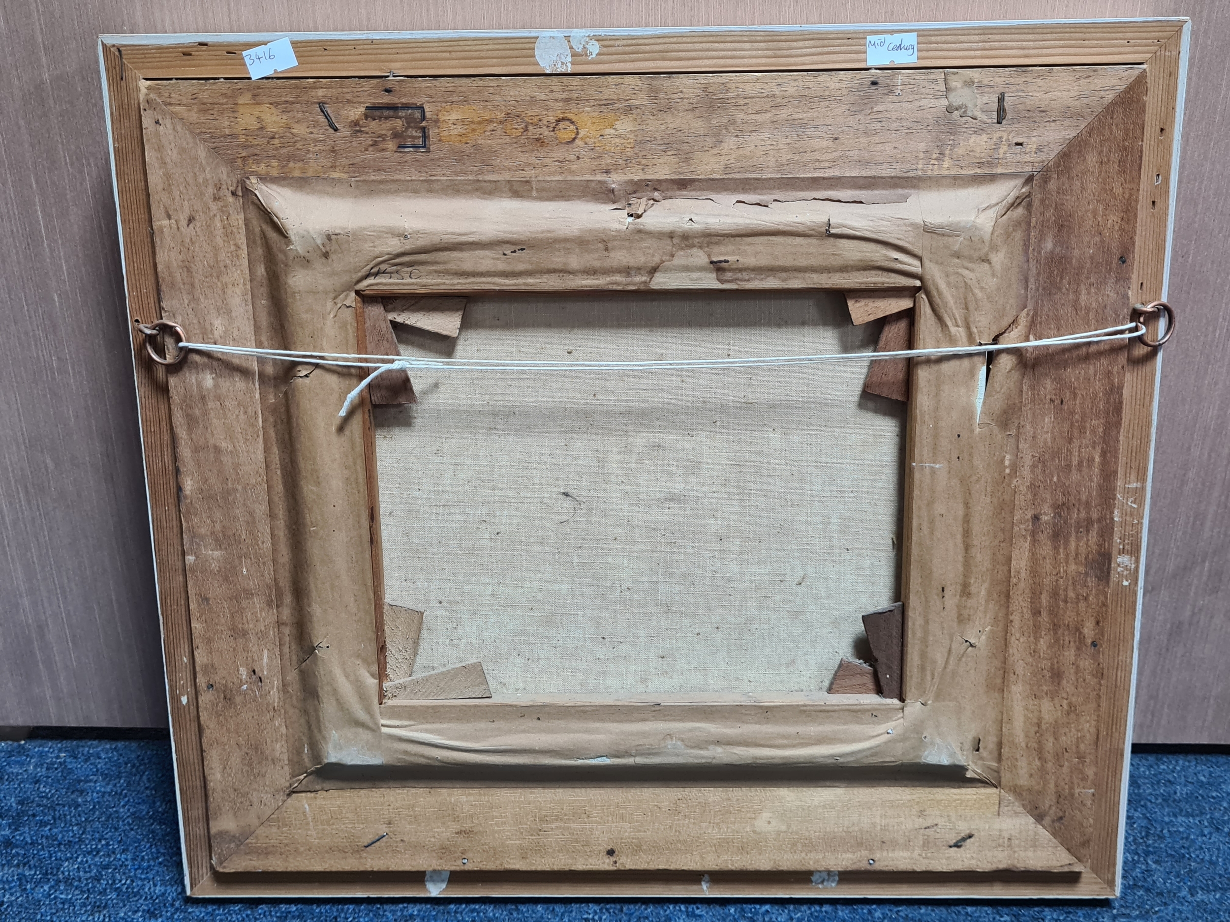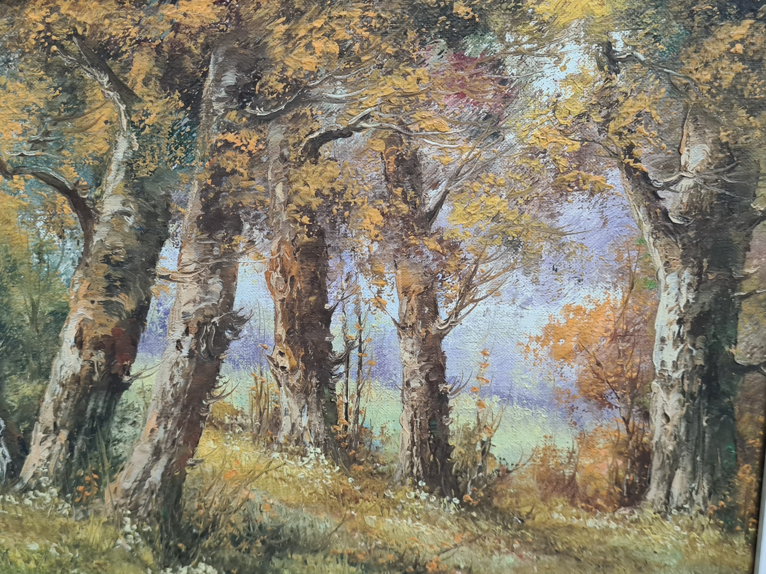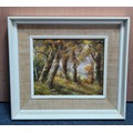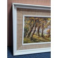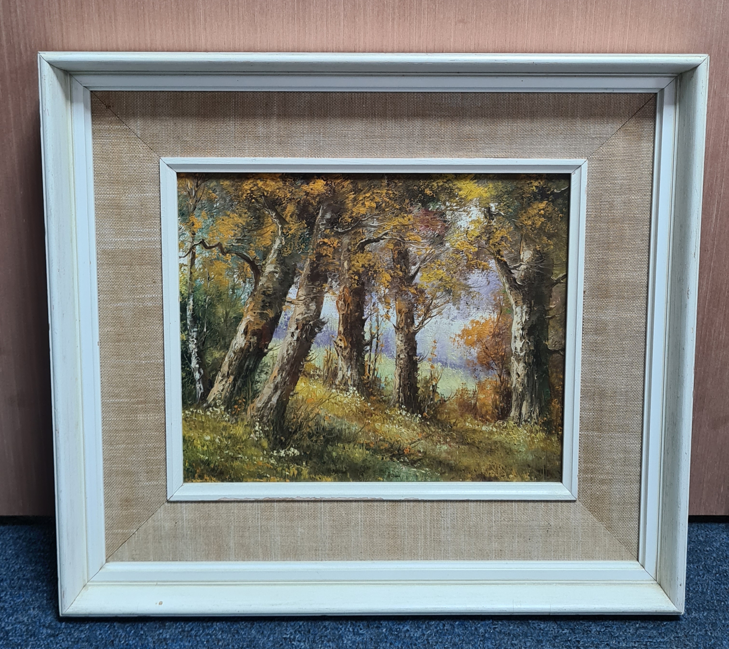Framed mid century Oil landscape painting of a autumnal woodland, signed but illegible. Measures H41cm x46cm.