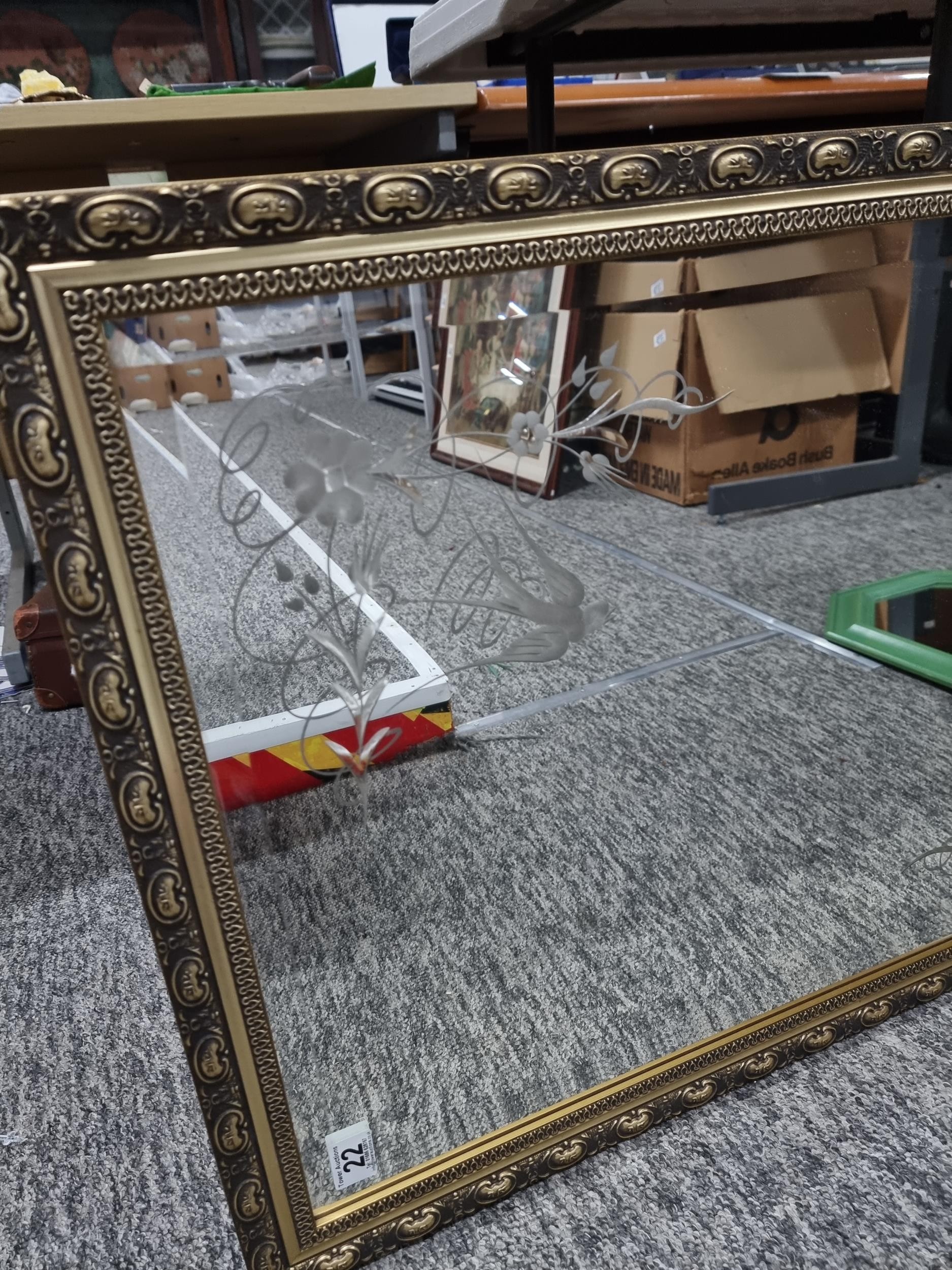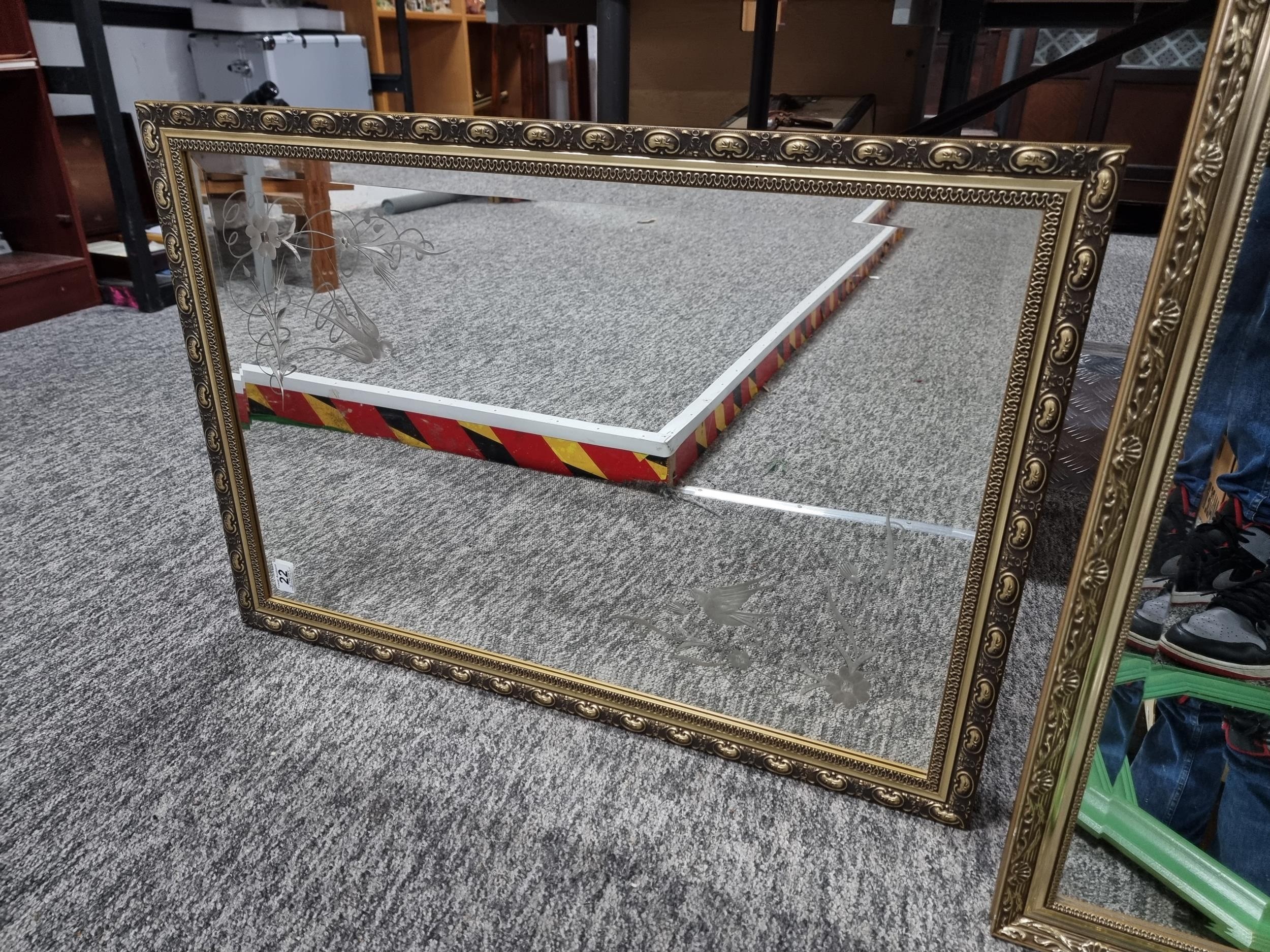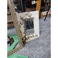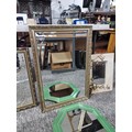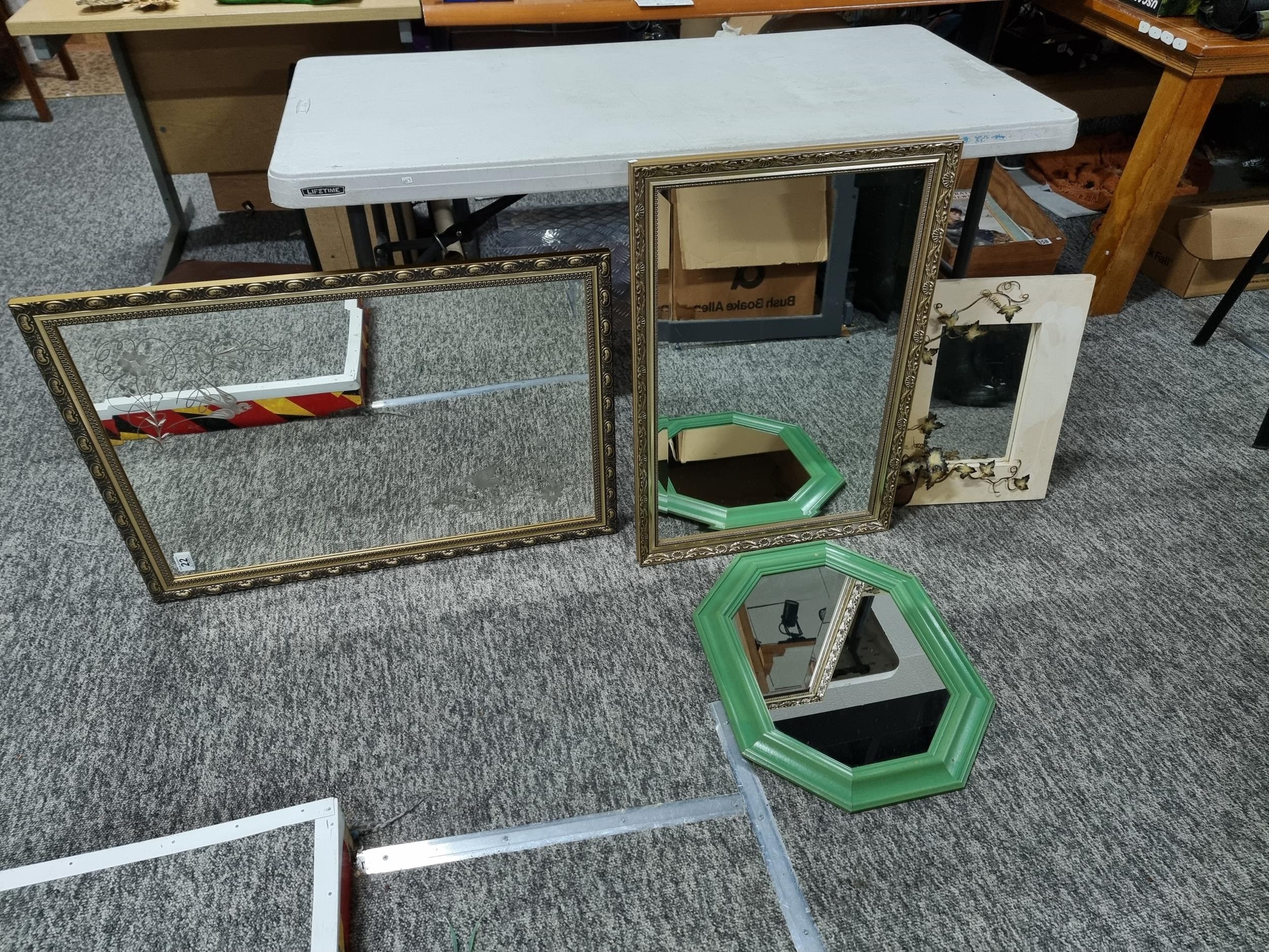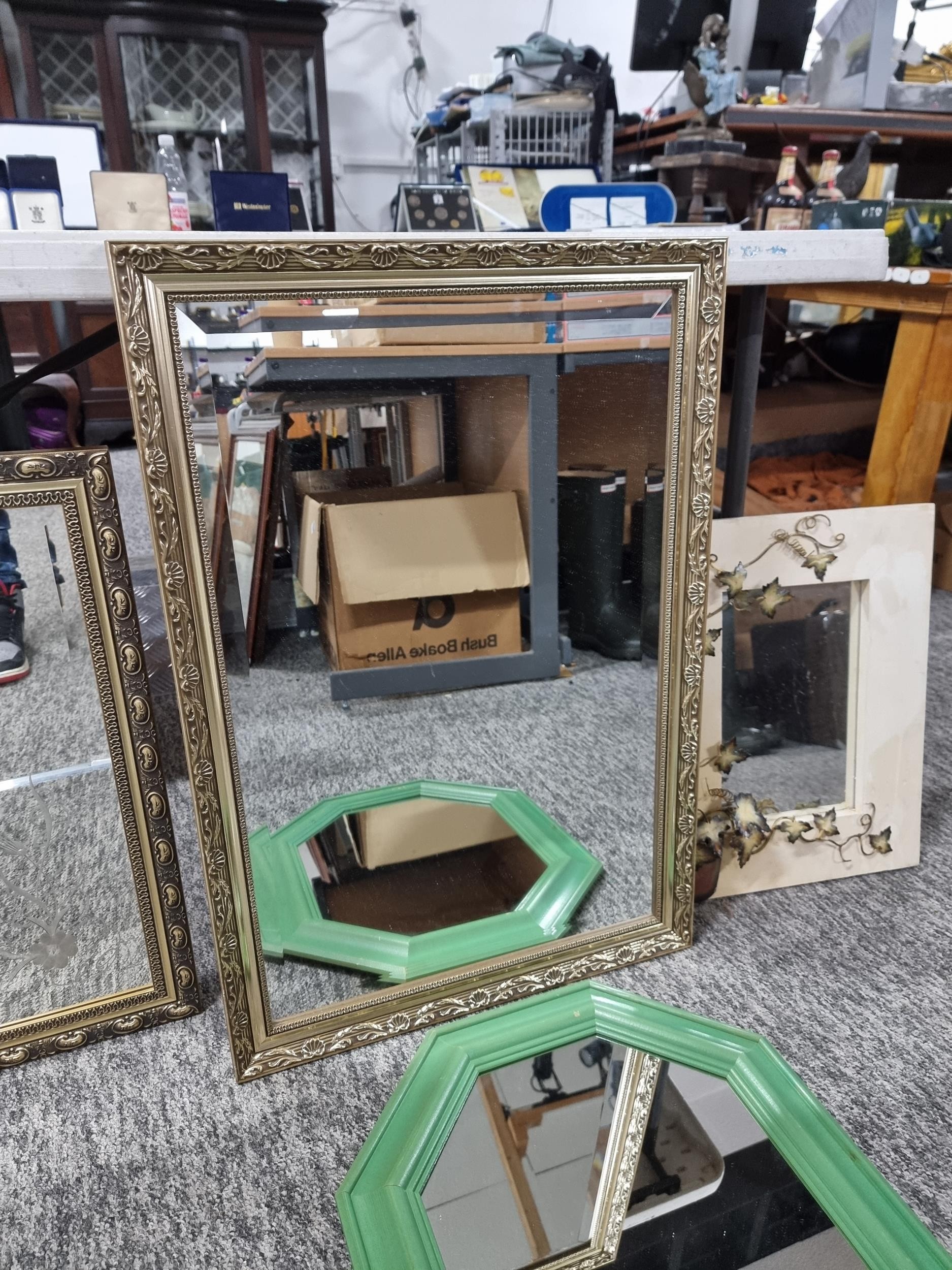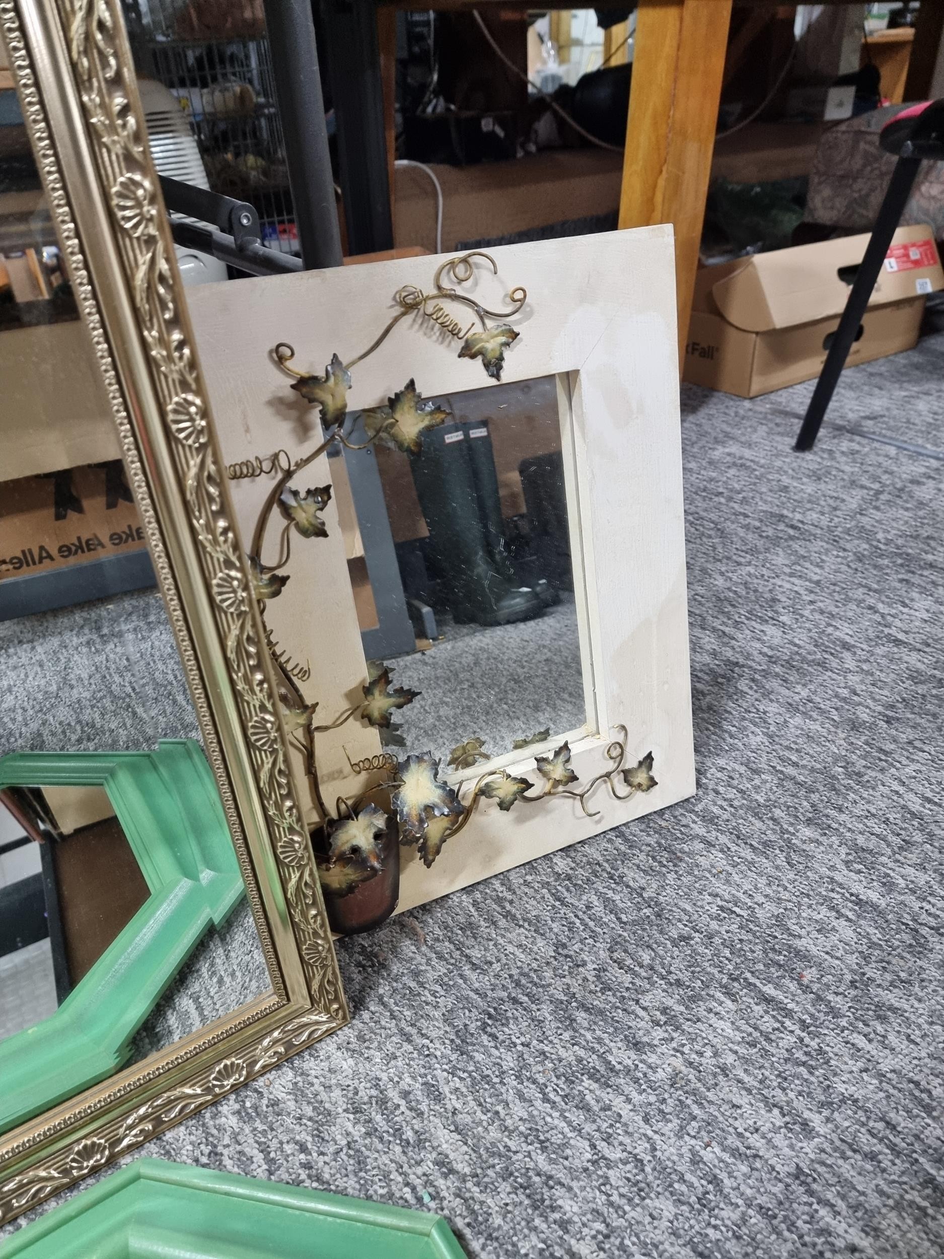 Collection of 4x framed mirrors inc 2x gilt framed bevel edged mirrors a green framed wooden octagonal mirror and a modern wood framed mirror with a 3d metal design of ivy in a pot to the edge, largest mirror measures 84cm high by 58cm wide