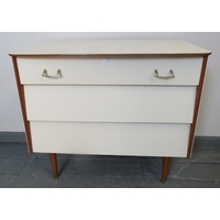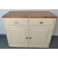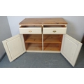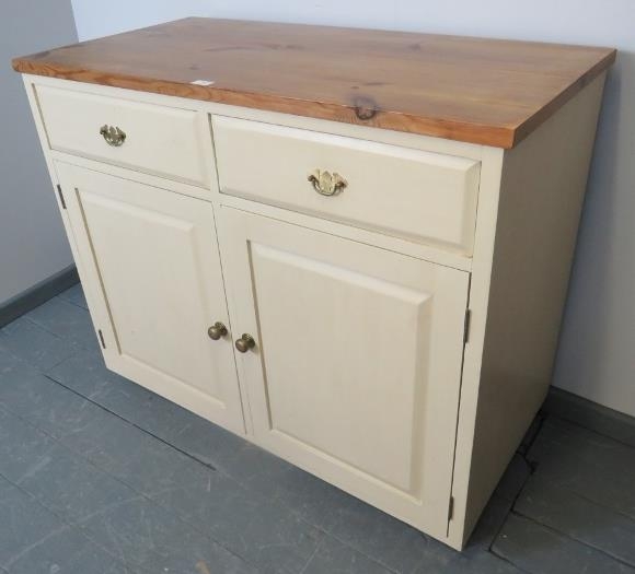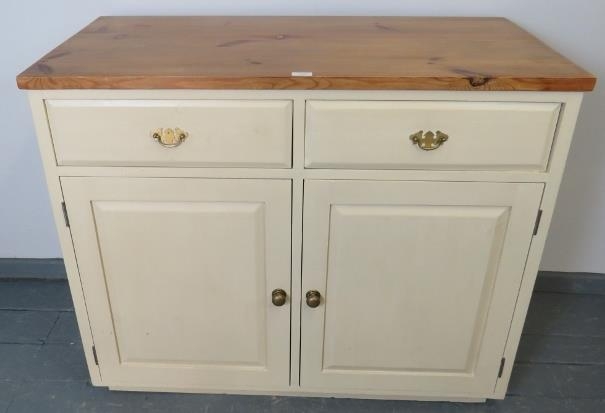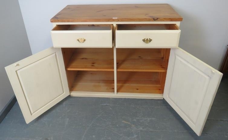 A pine sideboard painted cream with stripped top, housing two short drawers over two cupboards, all with brass fittings.