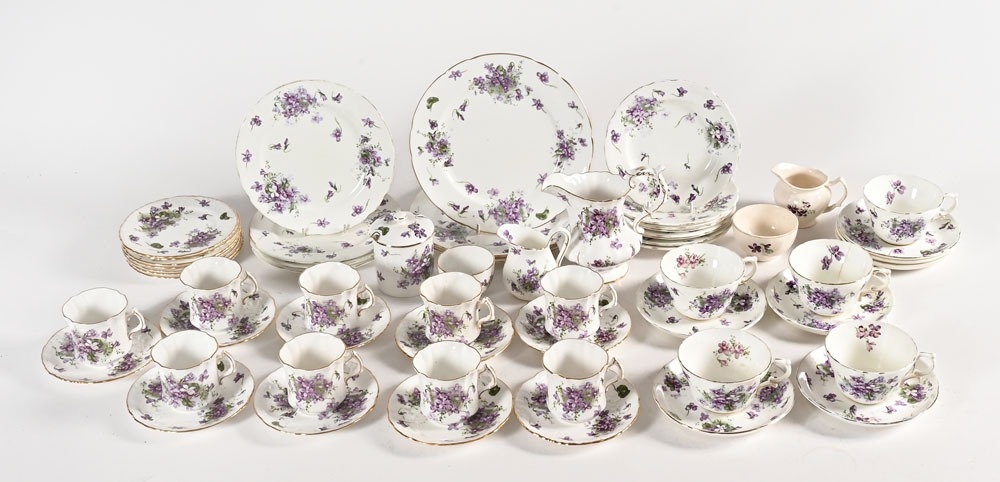 A Hammersley bone china "Victorian Violets" part tea and dinner service, together with a Johnson Brothers "Old Chelsea" pattern sugar basin and cream jug.