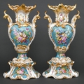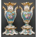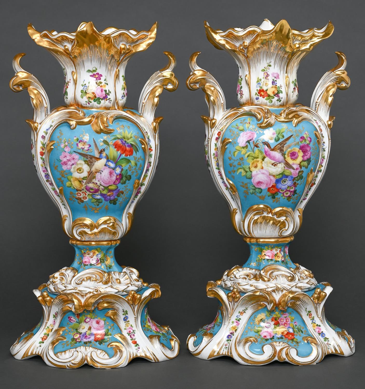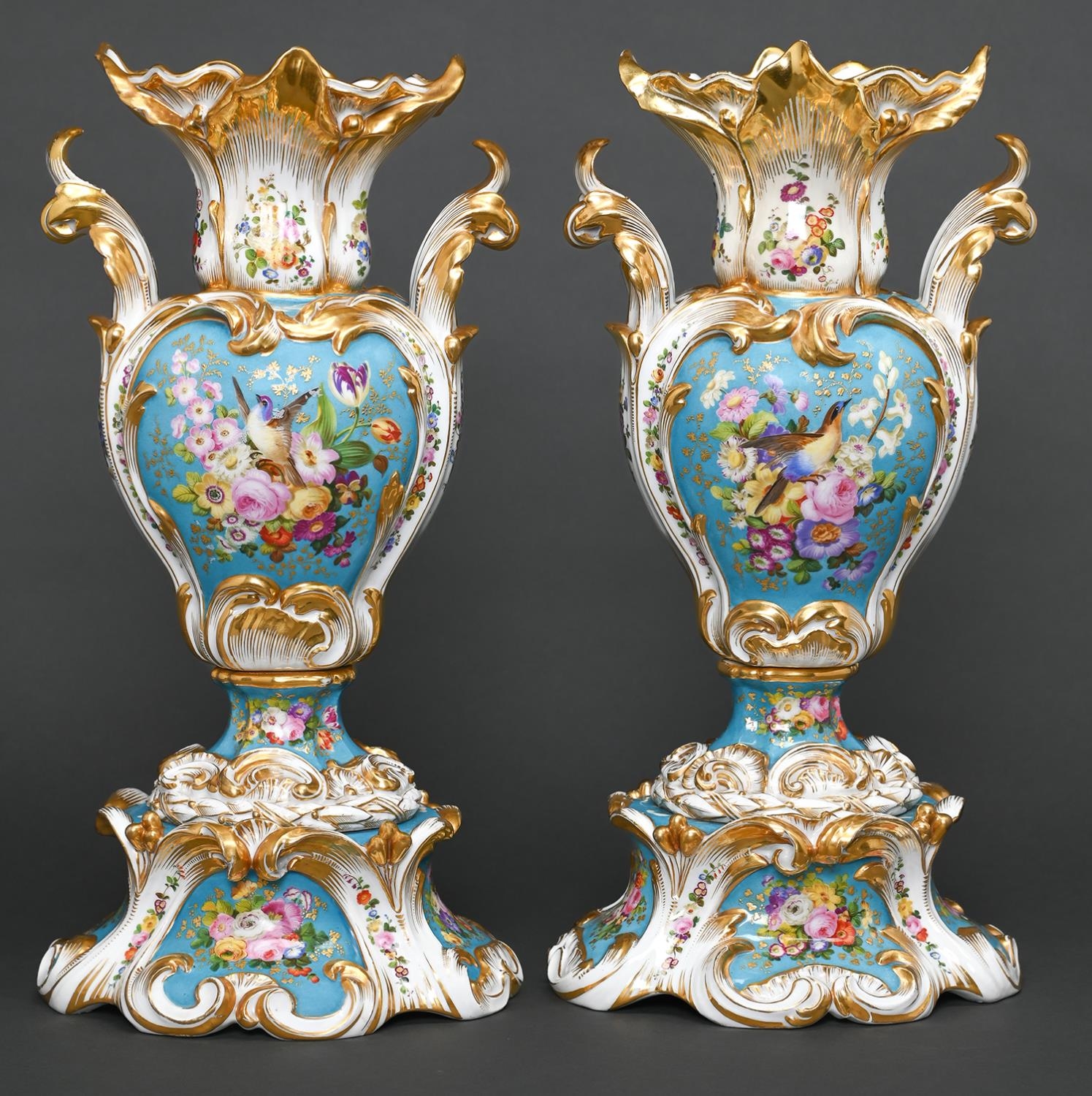 A pair of French revived rococo vases, c1850, painted with birds and flowers reserved on a bleu celeste ground framed by leafy scrolls and trailing flowers, 45.5cm h, MA in underglaze blue