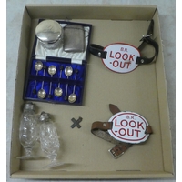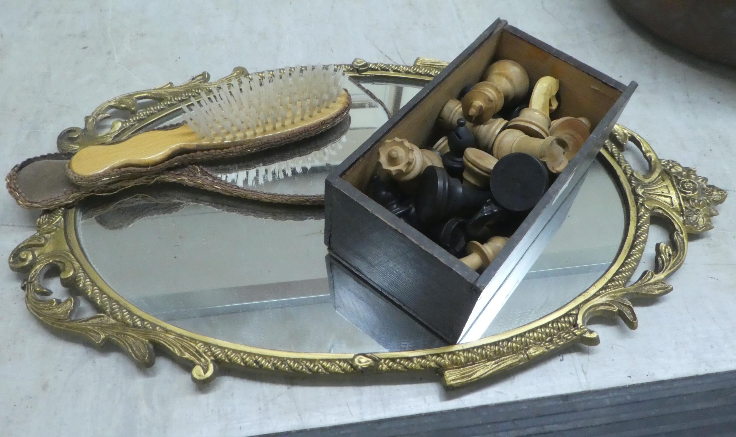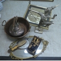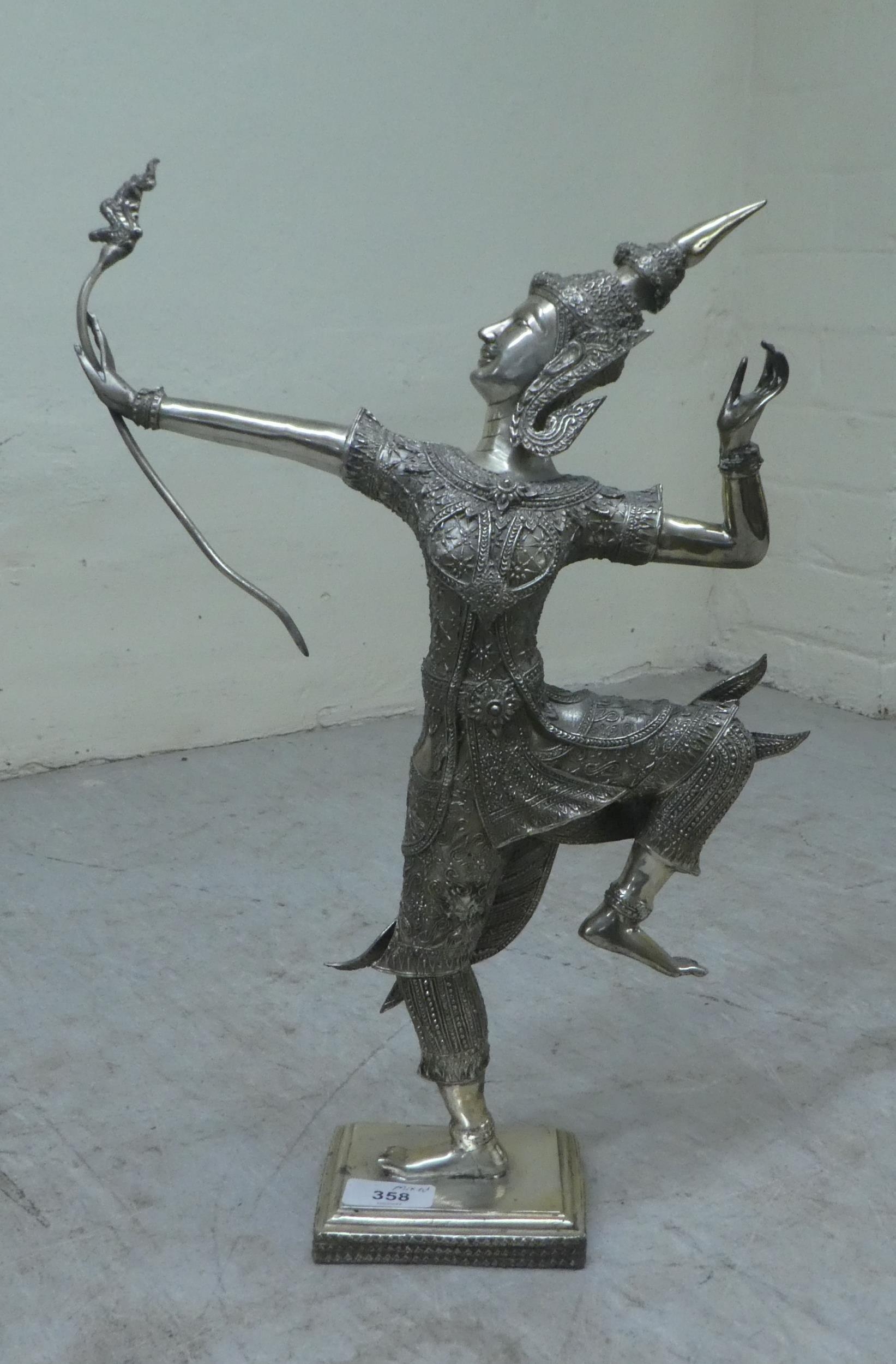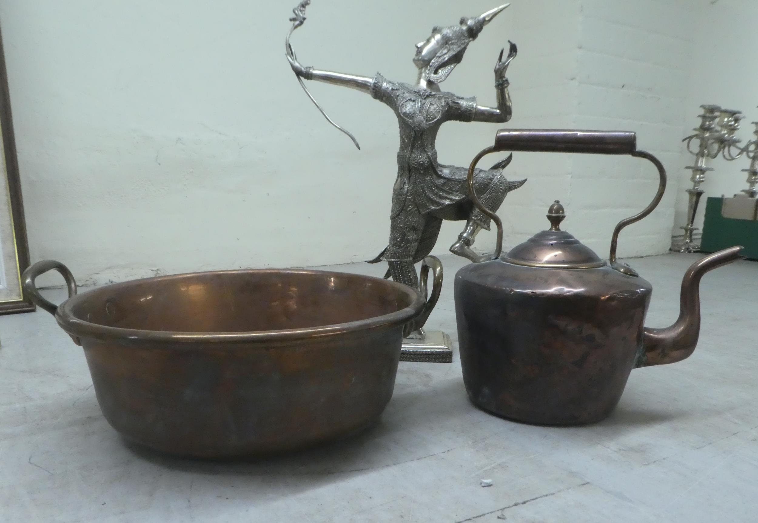 A mixed lot: to include two items of vintage copper cookware; and a modern silvered figure of a Thai dancer 15"h