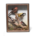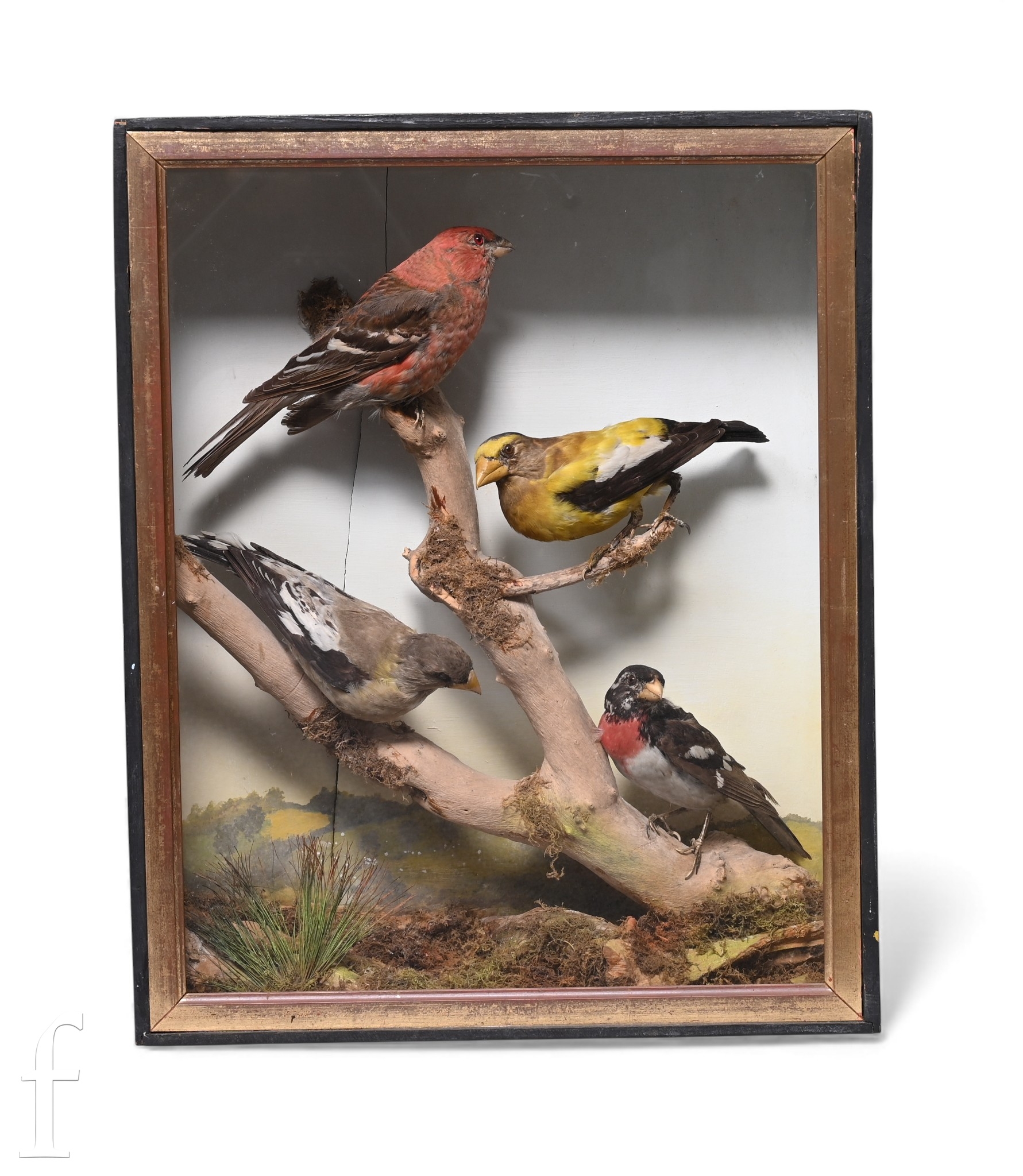 An Edwardian taxidermy study of grosbeaks, to include a male and female evening grosbeak, a male pine grosbeak and a male rose-breasted grosbeak, all perched on a branch within a naturalistic setting with painted background, height 46cm, width 36.5cm and depth 13cm, slight damage.