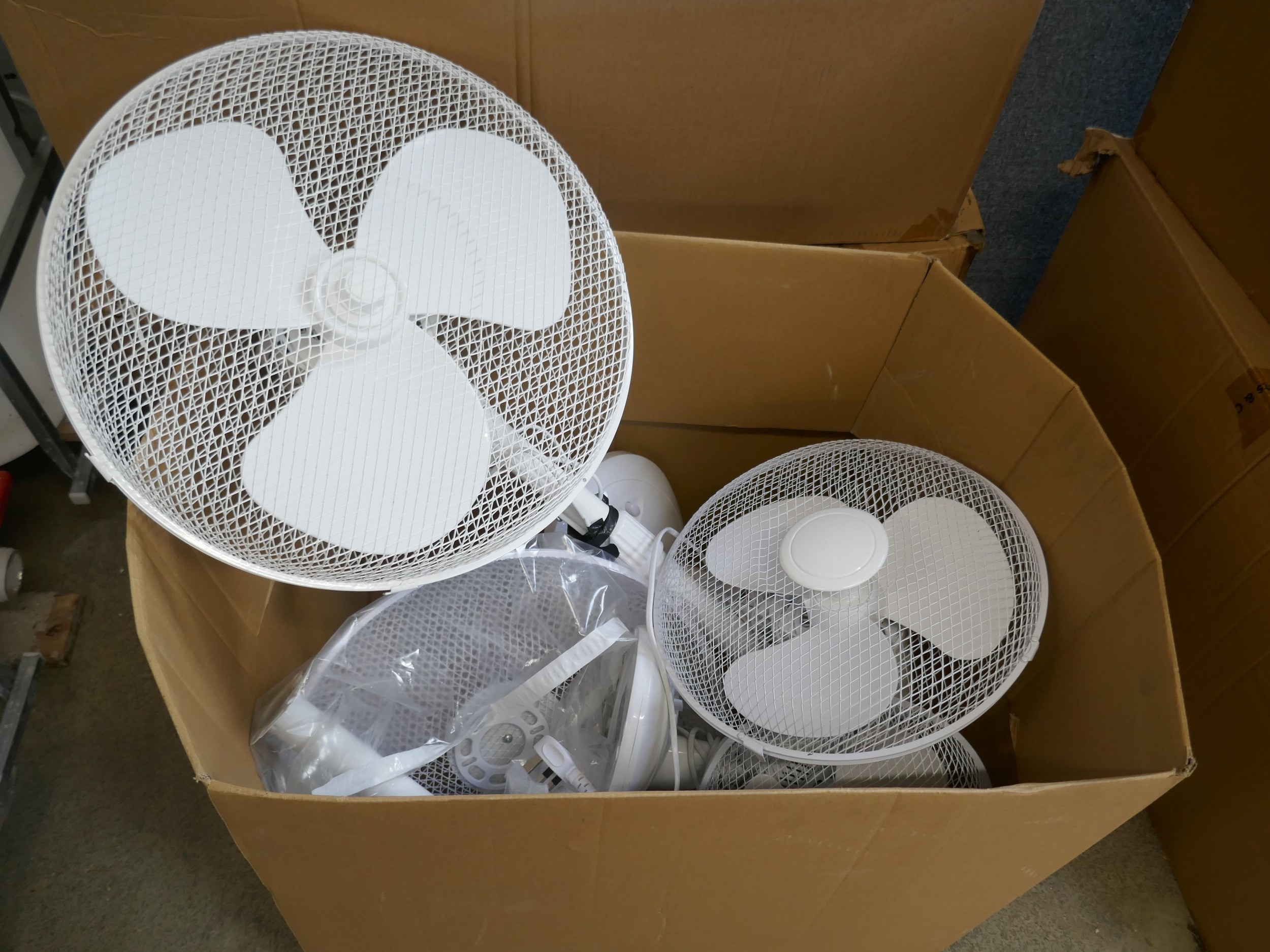 A box of assorted fans/parts **One failed PAT test due to damaged casing - do not use * This lot is subject to VAT