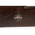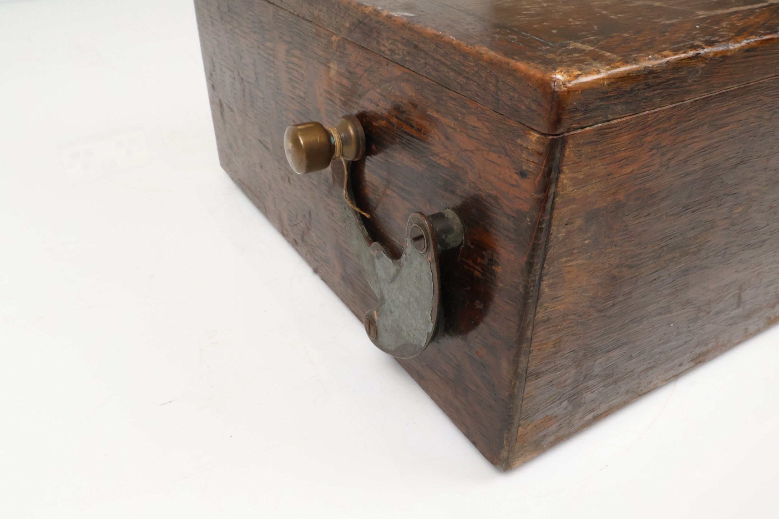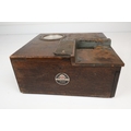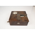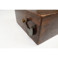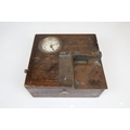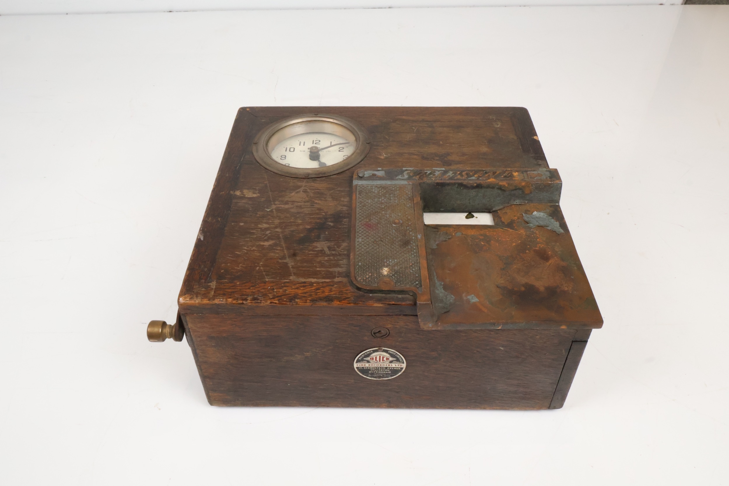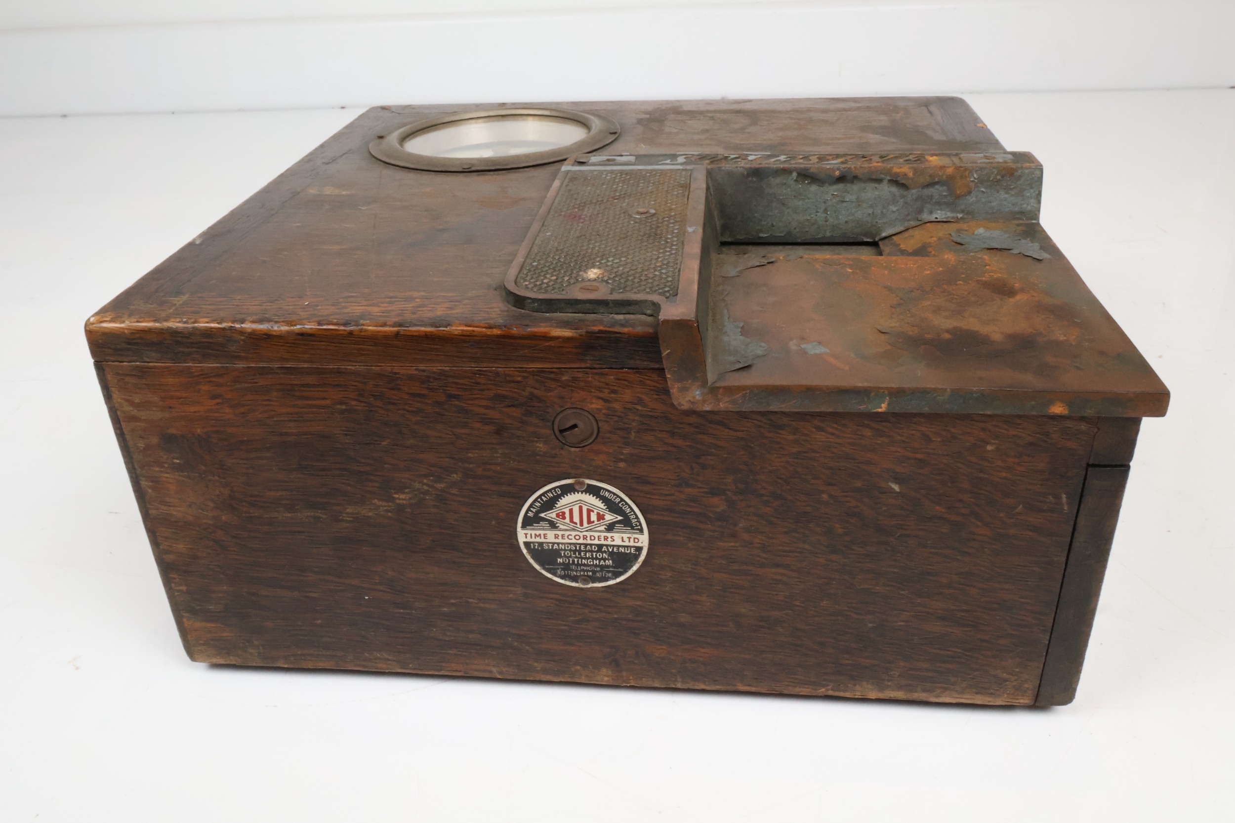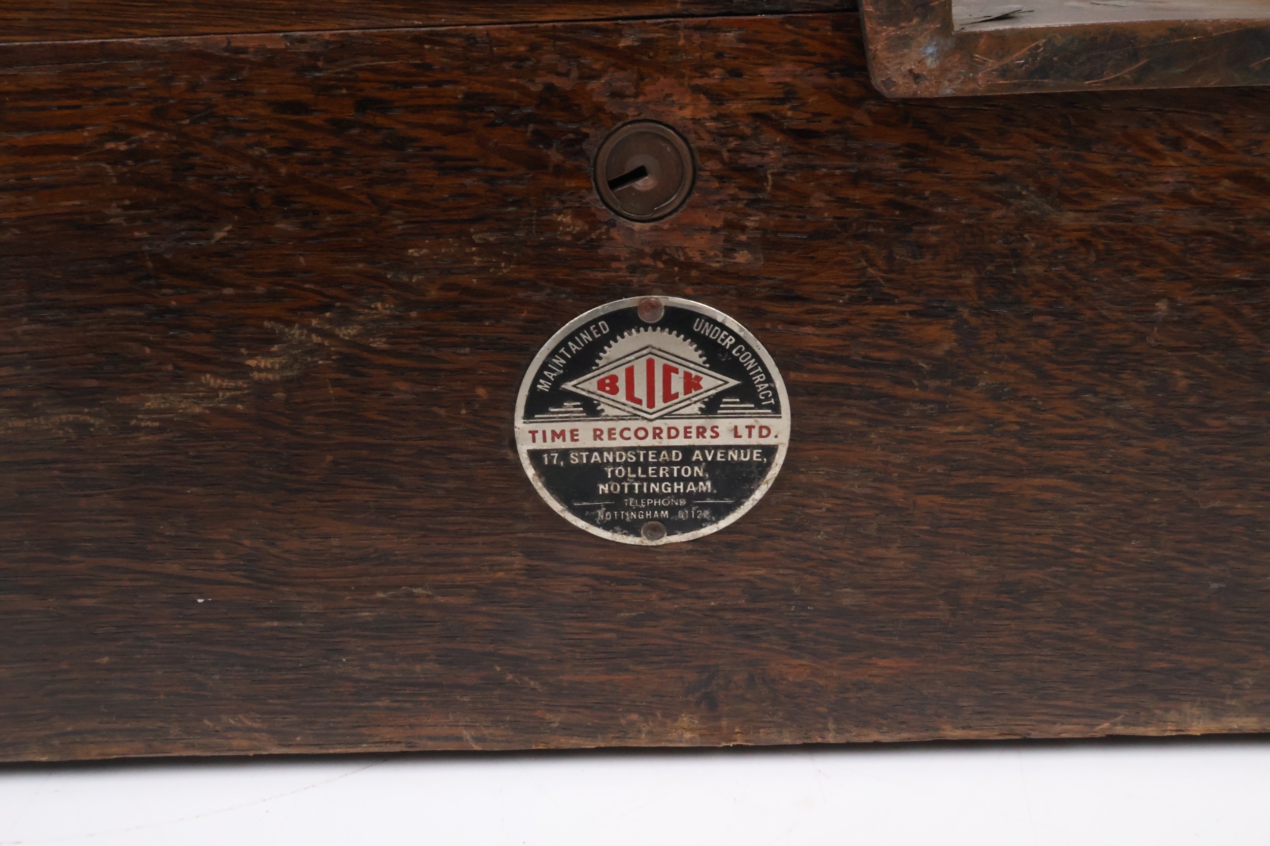 A mechanical time recorder or punch clock supplied by Blick Time Recorders Ltd. The device is housed within a dark-stained hardwood case, likely oak, designed for industrial or office use. The top surface features an integrated clock face marked "BLICK" set within a brass-toned bezel. Adjacent to the clock is the metal slot and tray mechanism used for recording time cards. A winding knob and lever mechanism are visible on the left side of the case. The front panel includes a keyhole and a circular metal plaque identifying the supplier and maintenance service: "BLICK TIME RECORDERS LTD. 17, STANDSTEAD AVENUE, TOLLERTON, NOTTINGHAM."
