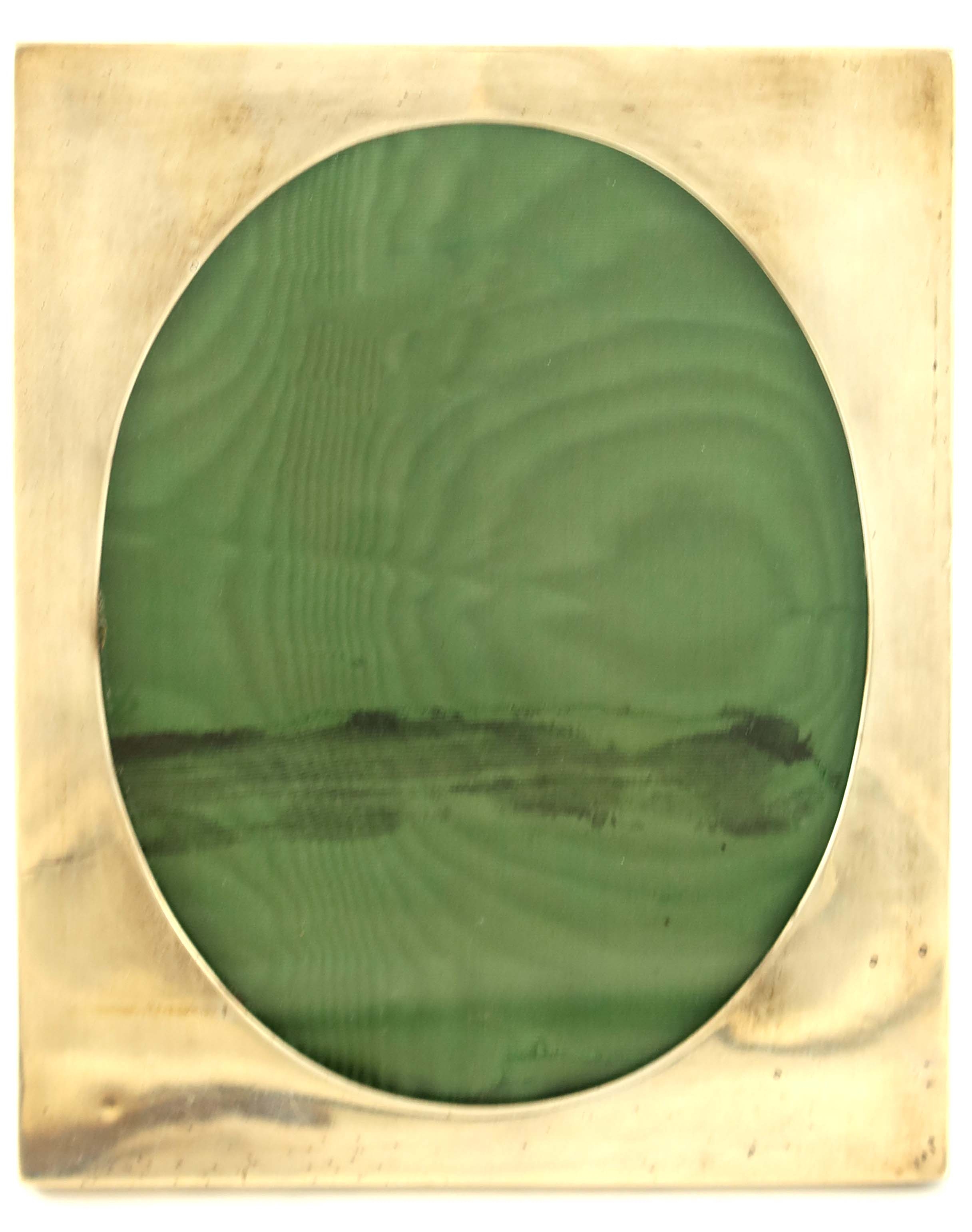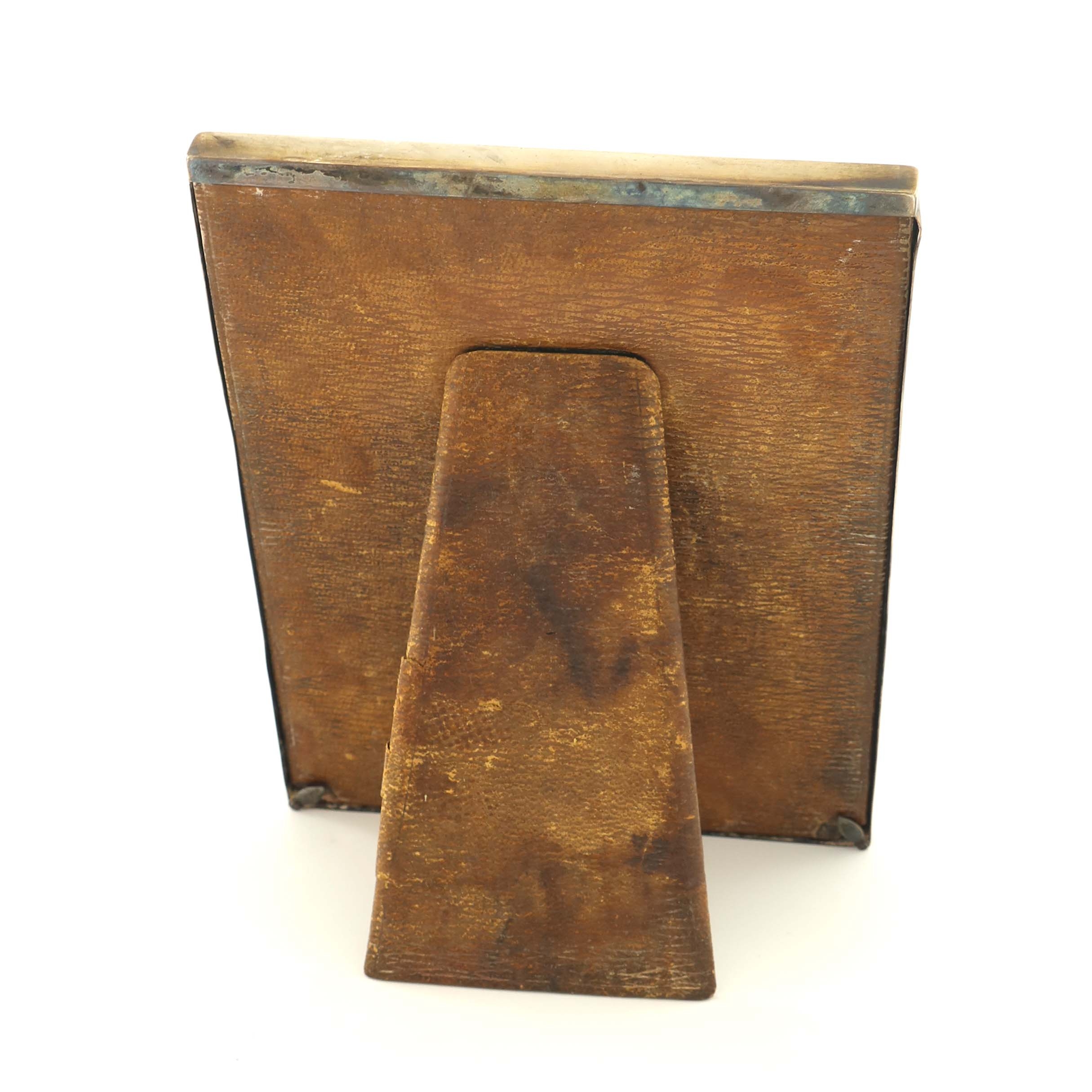 An Edwardian silver photo frame, Asprey and Co., London 1908, plain rectangular form with oval aperture, Moroccan leather back and easel support, opening 16.5cm x 12cm, overall 19cm x 14.5cm
