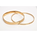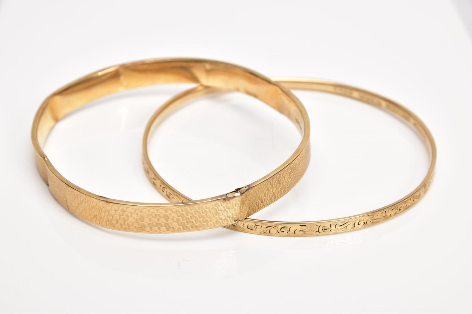 A 9CT GOLD BANGLE AND A YELLOW METAL BANGLE, the first an AF bangle of an engine turned design, (splits and damage in places) stamped '9ct', approximate gross weight 8.9 grams, together with a yellow metal bronze core bangle with a foliate design, stamped 9ct gold