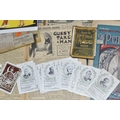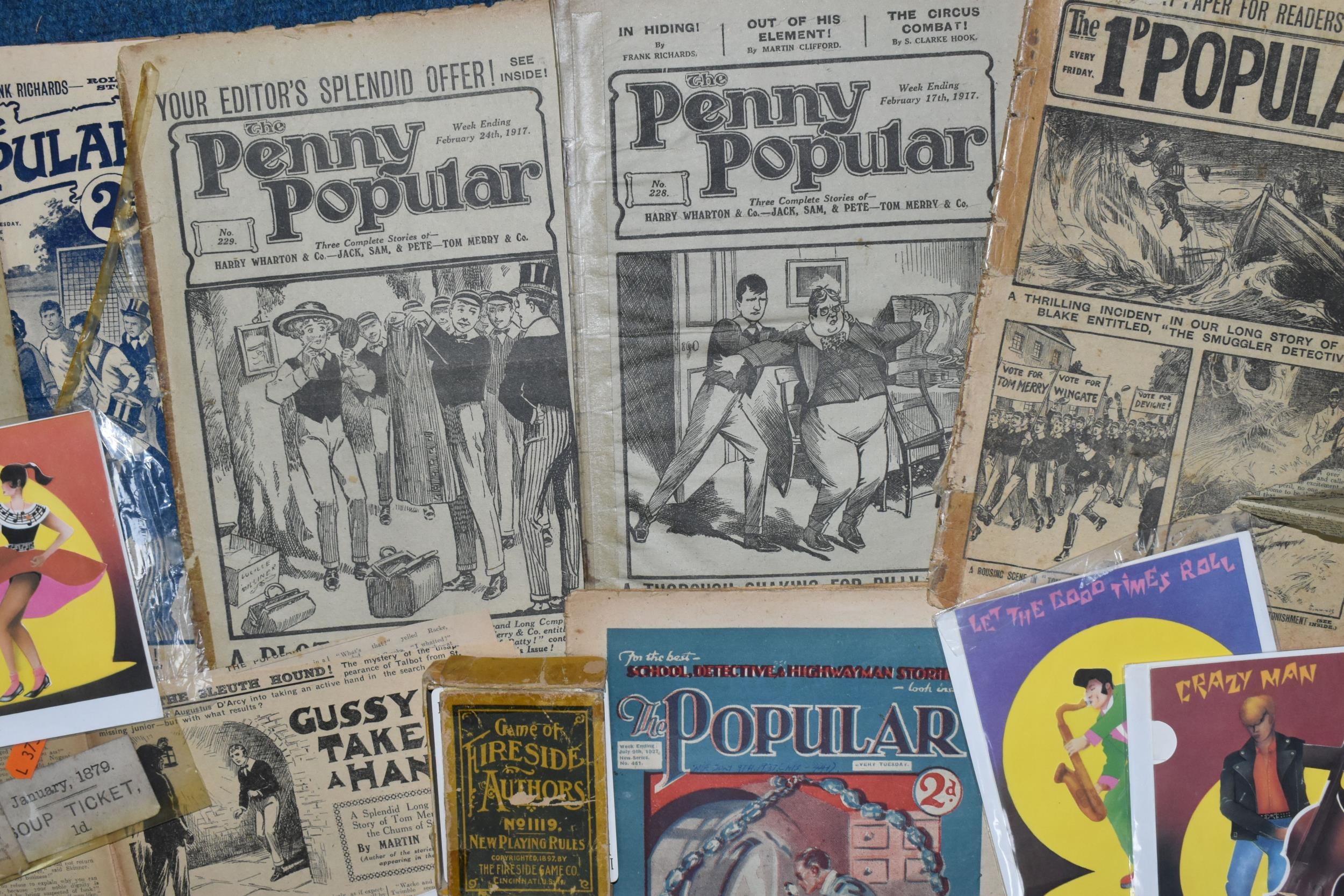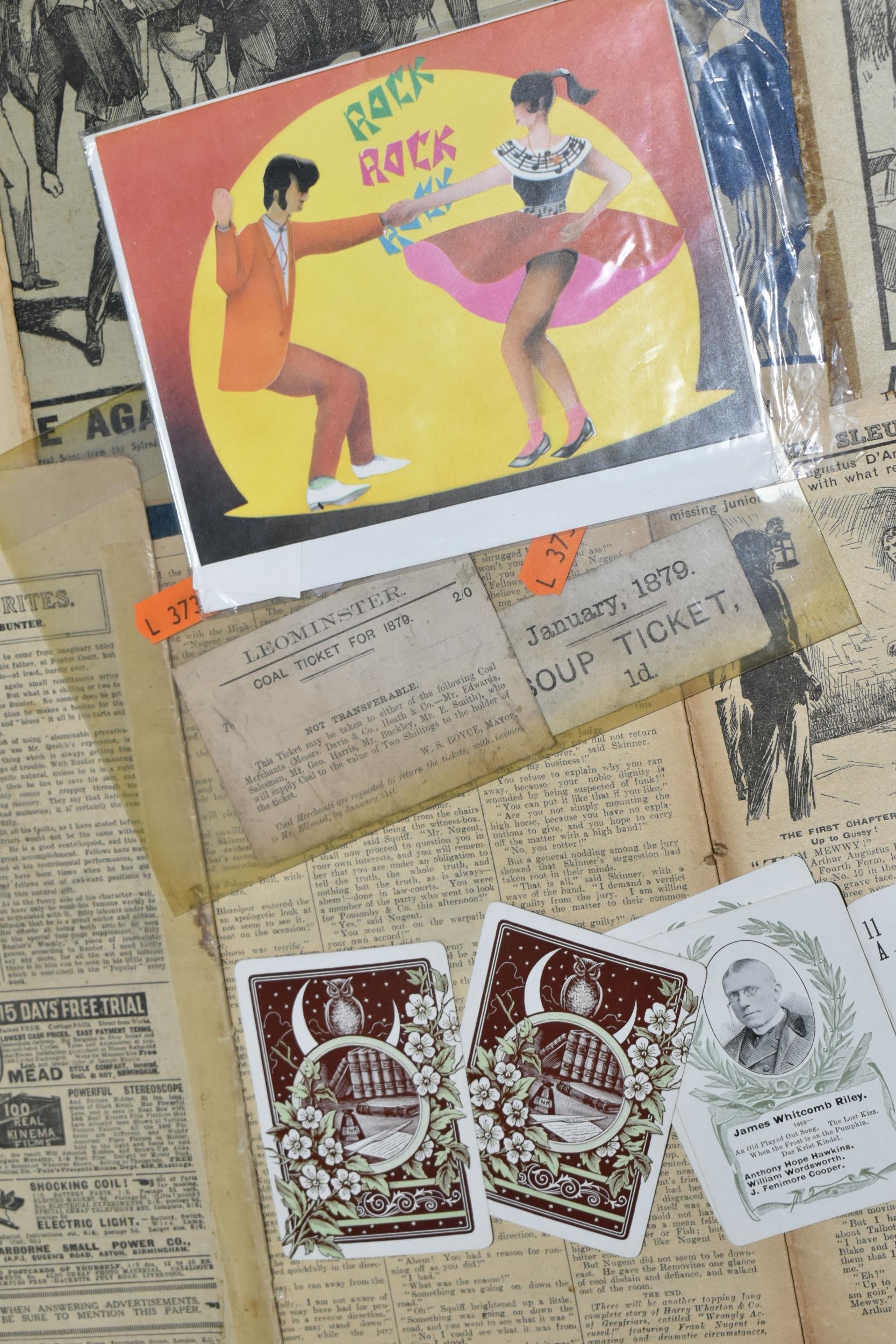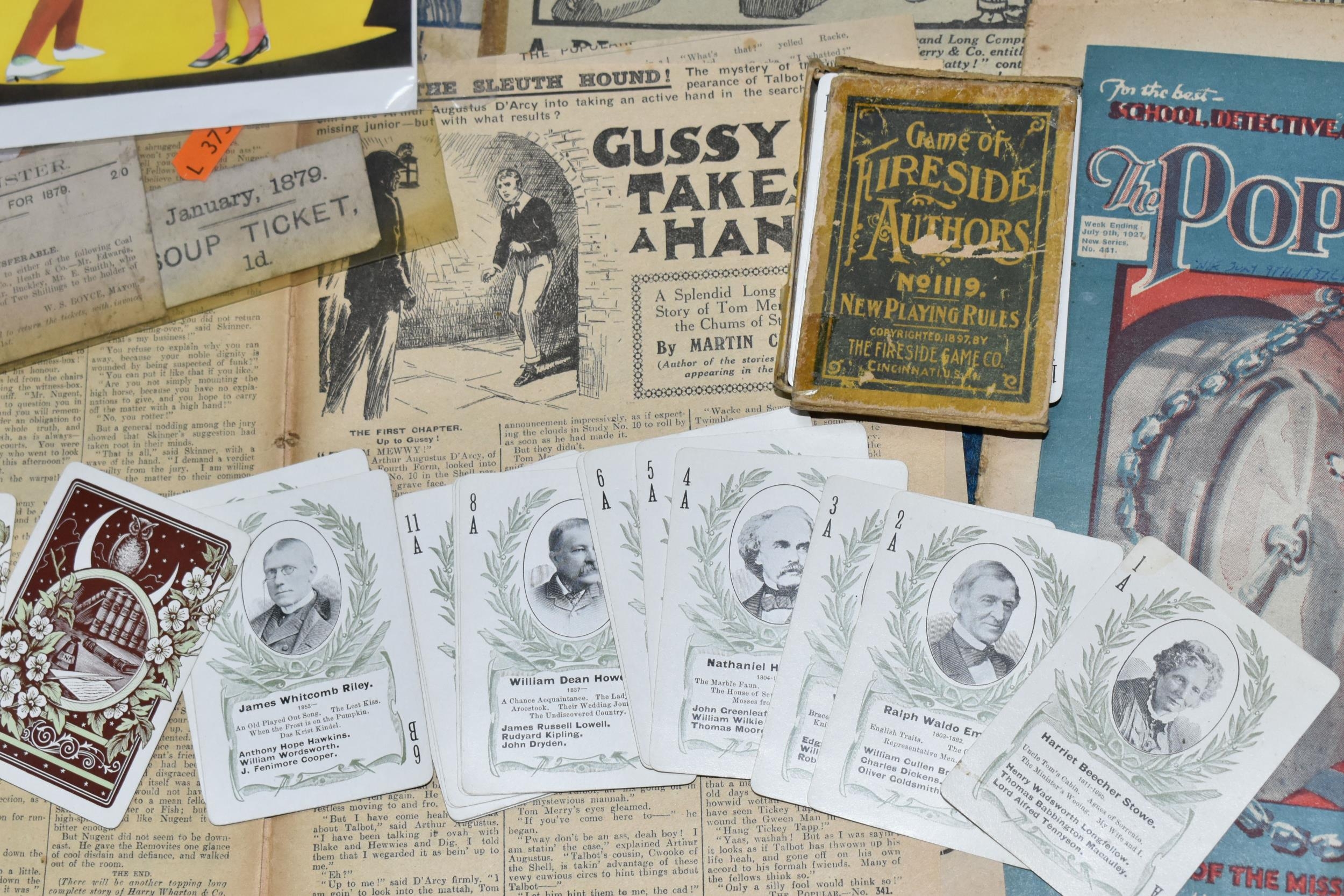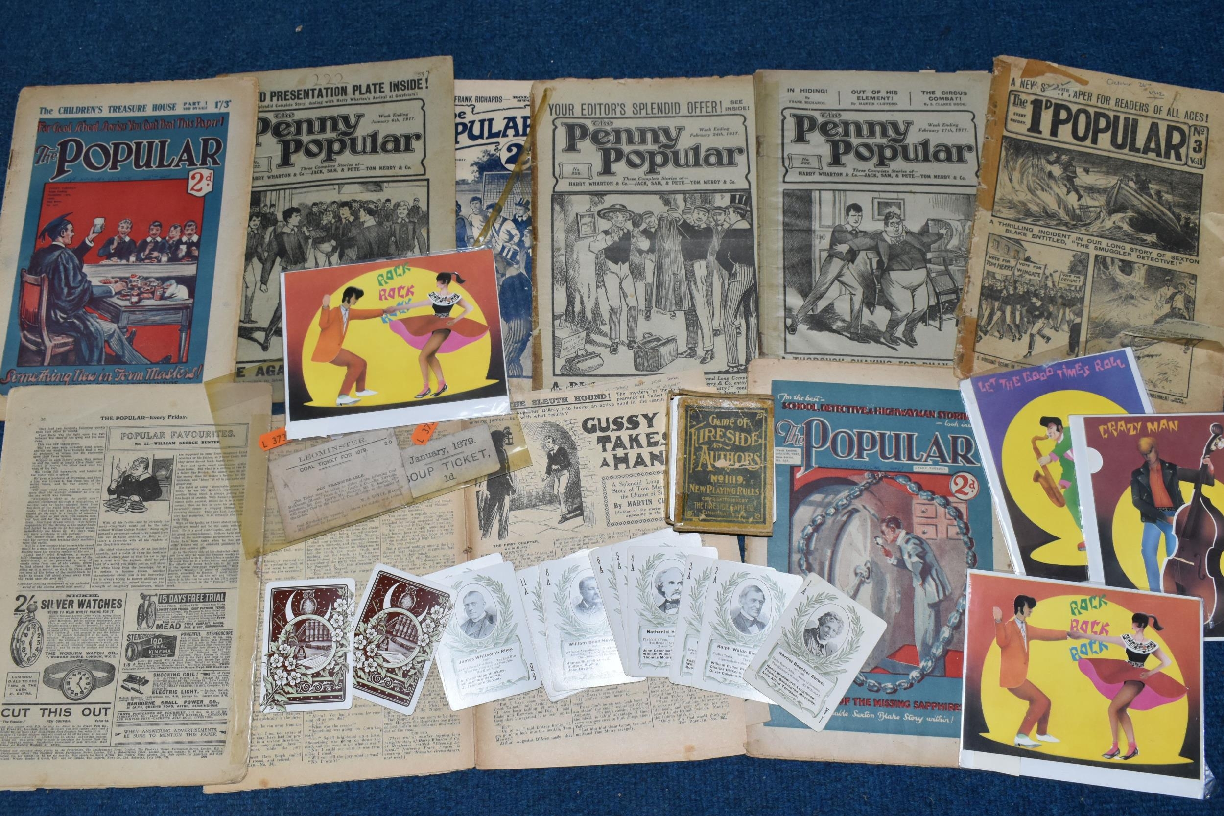 A QUANTITY OF PRINTED EPHEMERA, to include assorted copies of 'The Popular' magazine from 1912 onwards, boxed 'Game of Fireside Authors' card game, Leominster 2/0 Coal Ticket for 1879 and 1d Soup Ticket from January 1879, small quantity of 1980's greeting cards