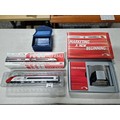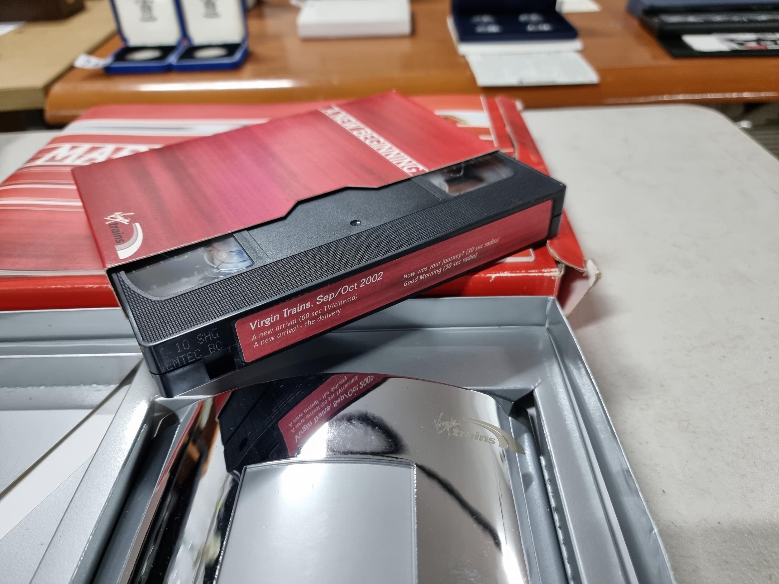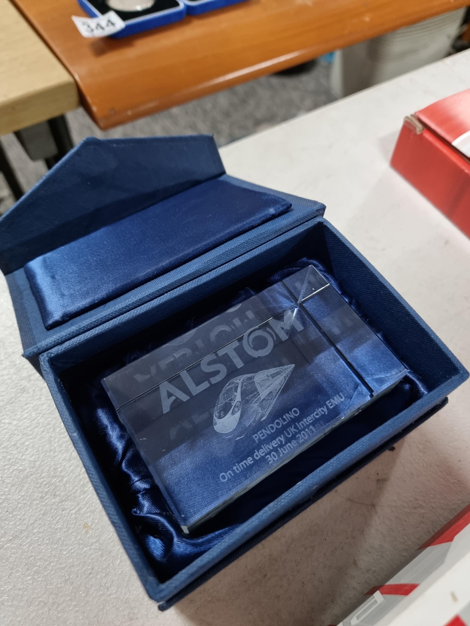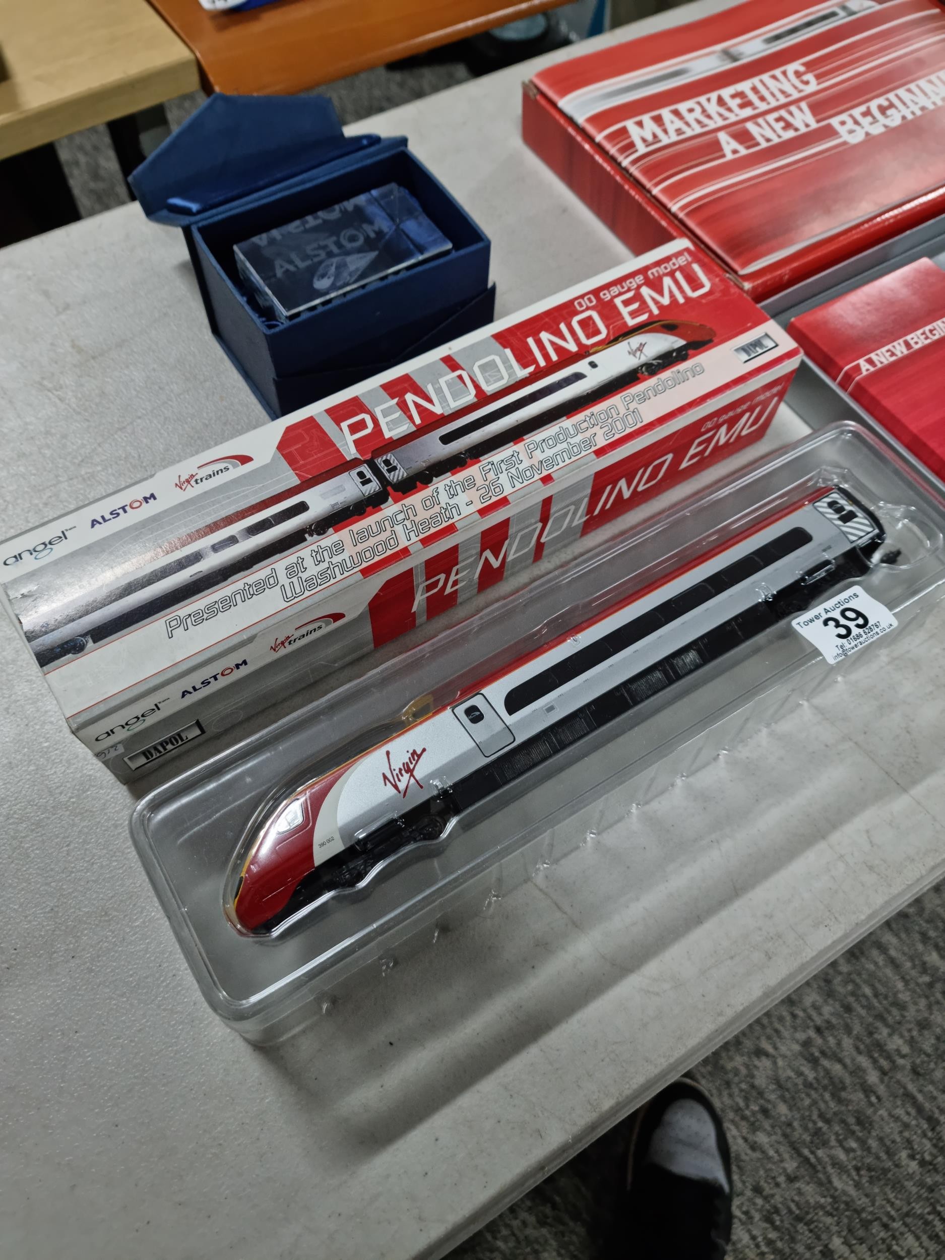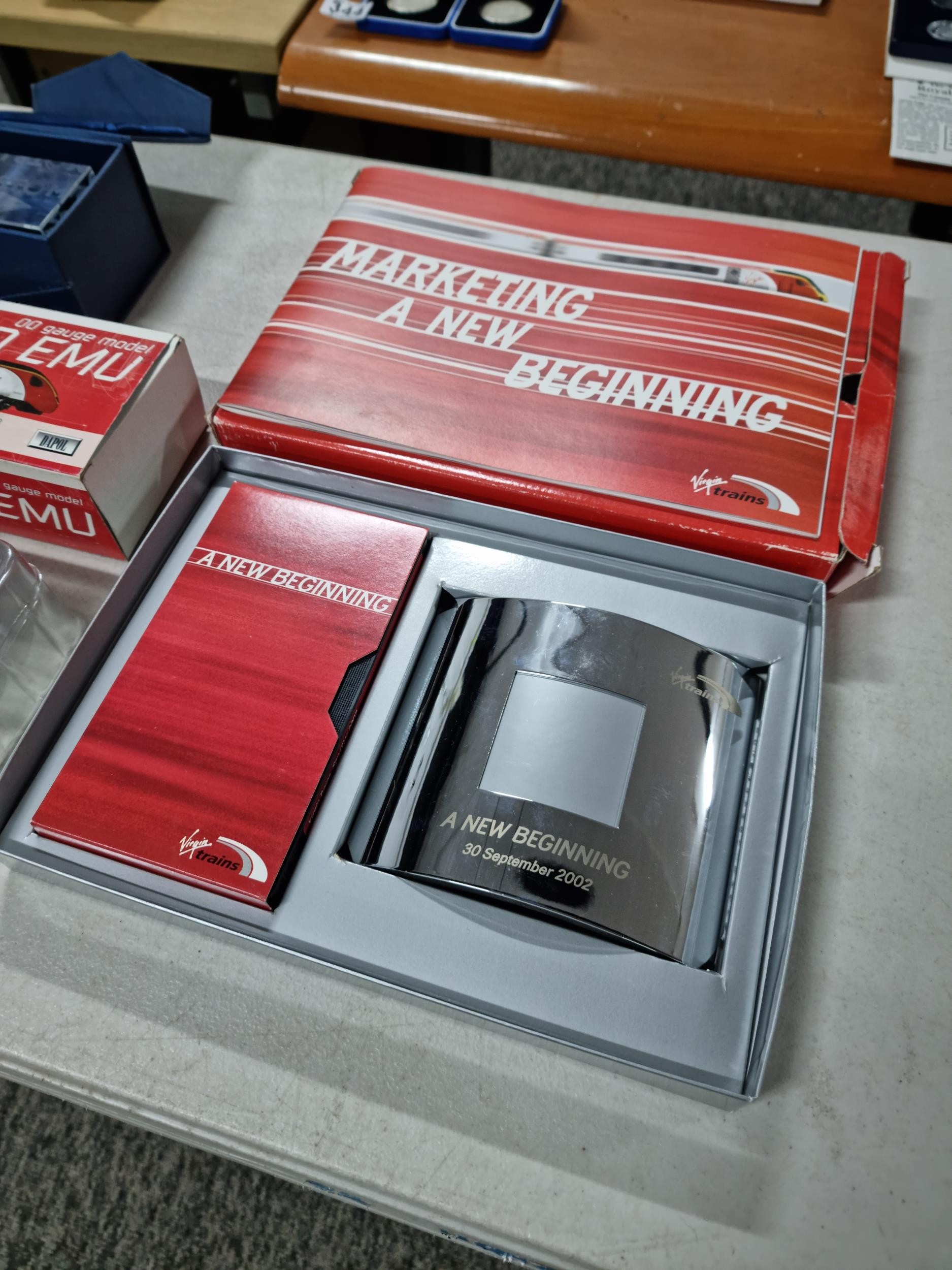 Boxed Pendolino EMU Virgin train model 69102 00 gauge, along with a boxed chrome photo frame which reads A New Beginning 2002, along with a boxed Pendolino paperweight.