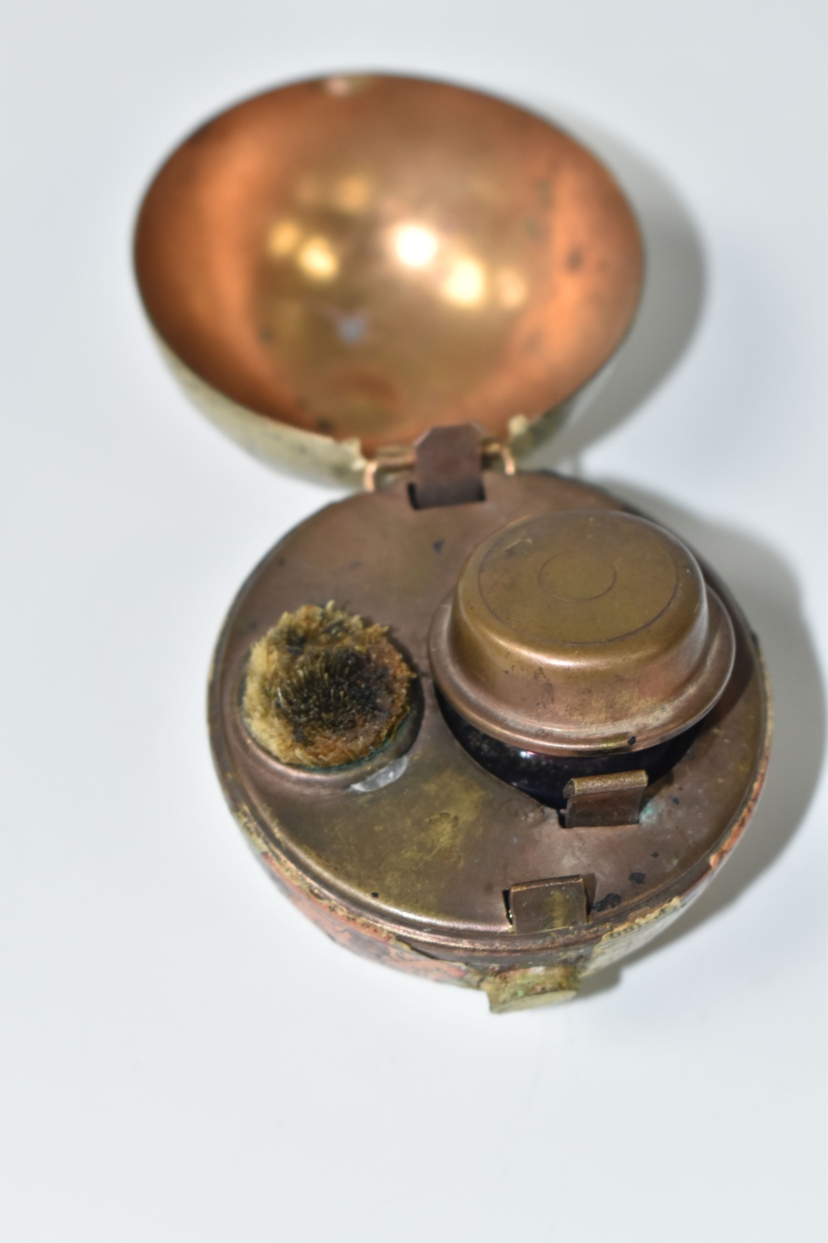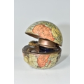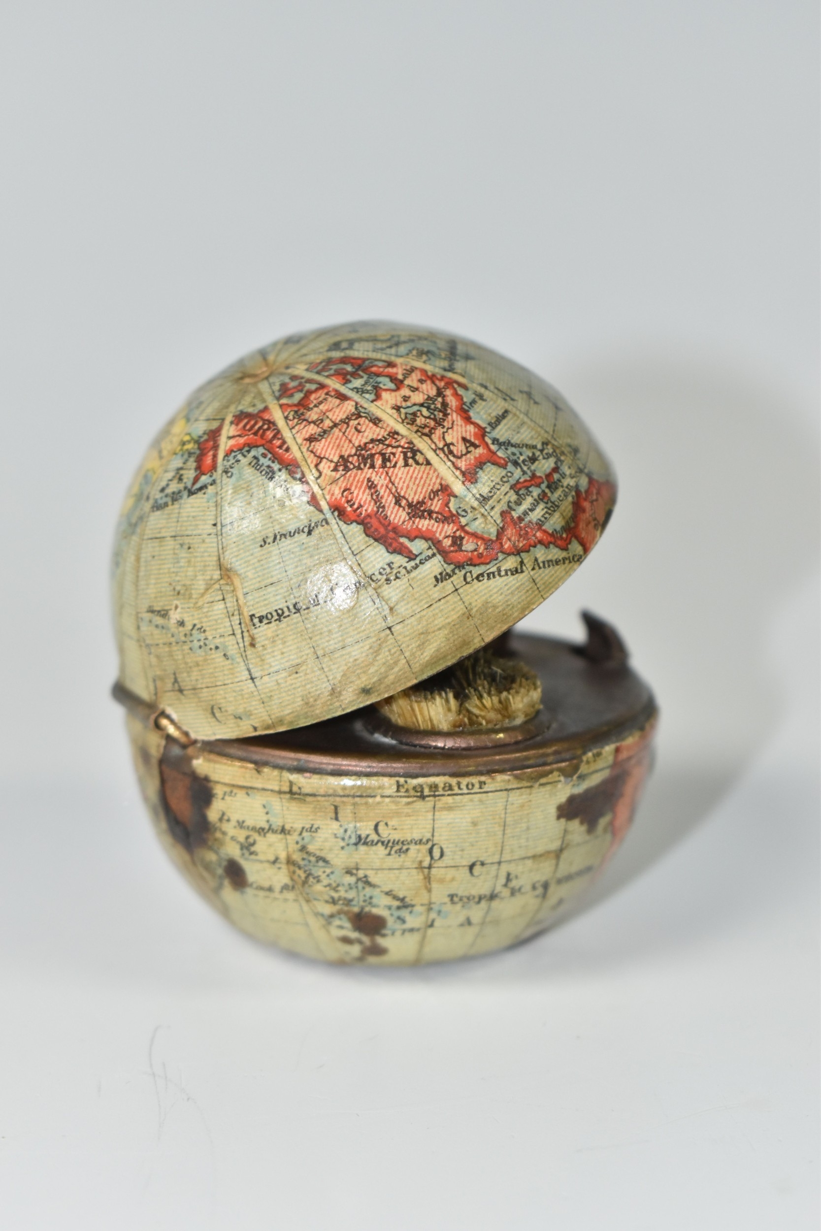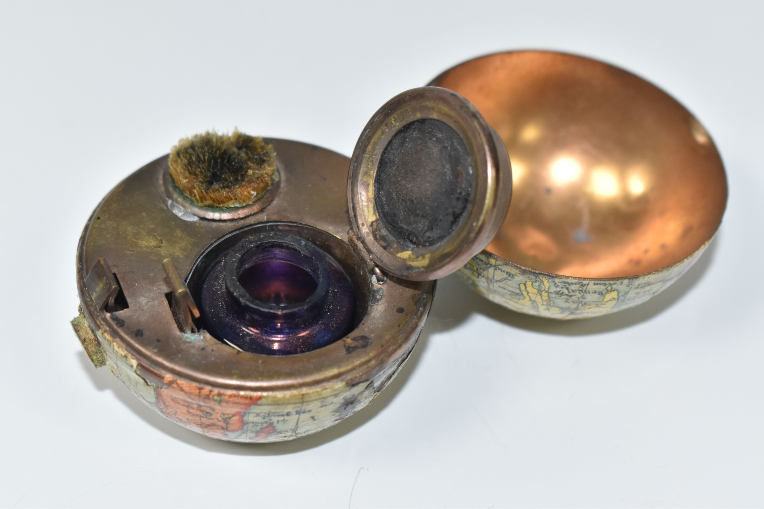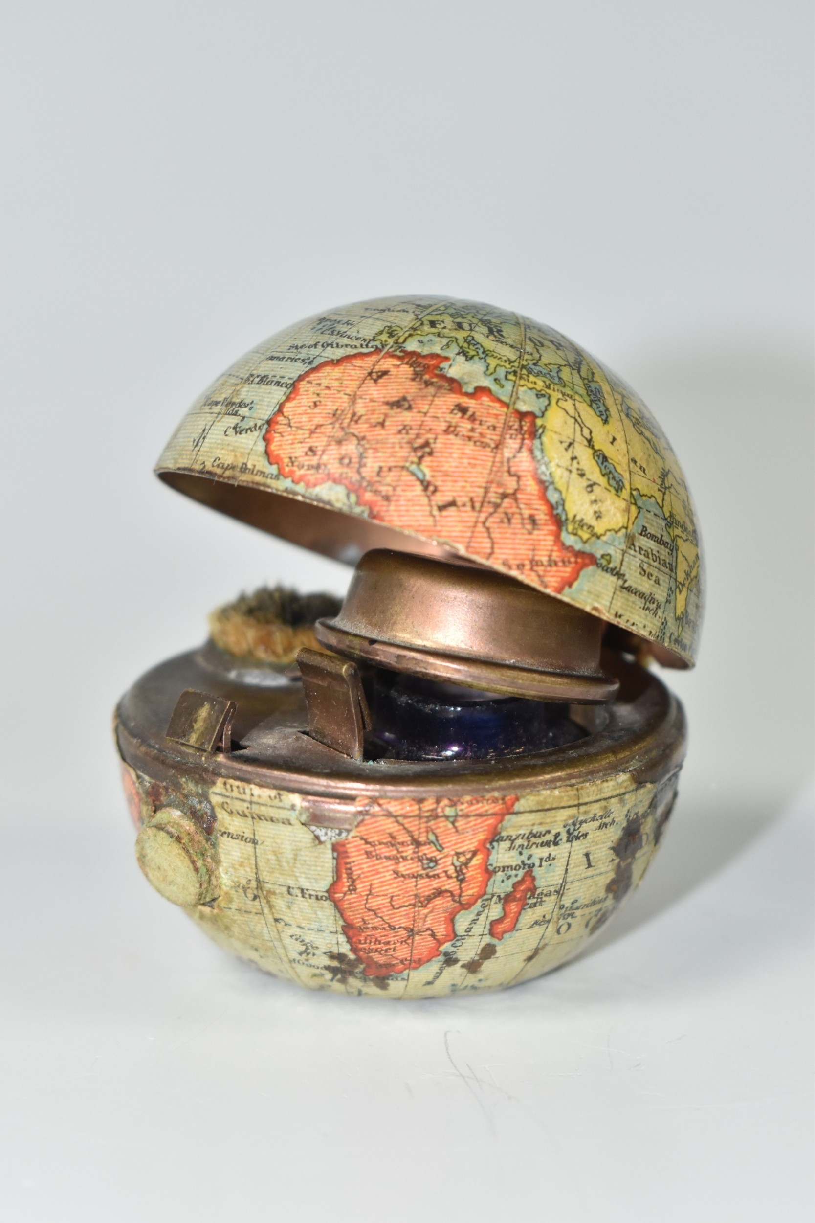 NOVELTY ANTIQUE GLOBE TRAVEL INKWELL, circa approximately 1900, featuring a global metal base and hinged lid covered in a paper map of the world, inside a sprung lid with concealed button at the front to reveal a single glass ink well, next to this is a bristle brush nib wipe, (1), (Condition Report: age related wear in places but overall ok)