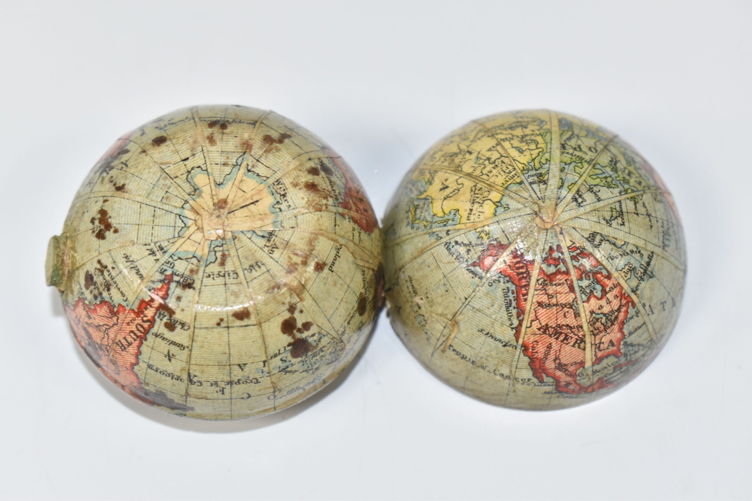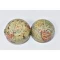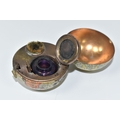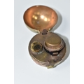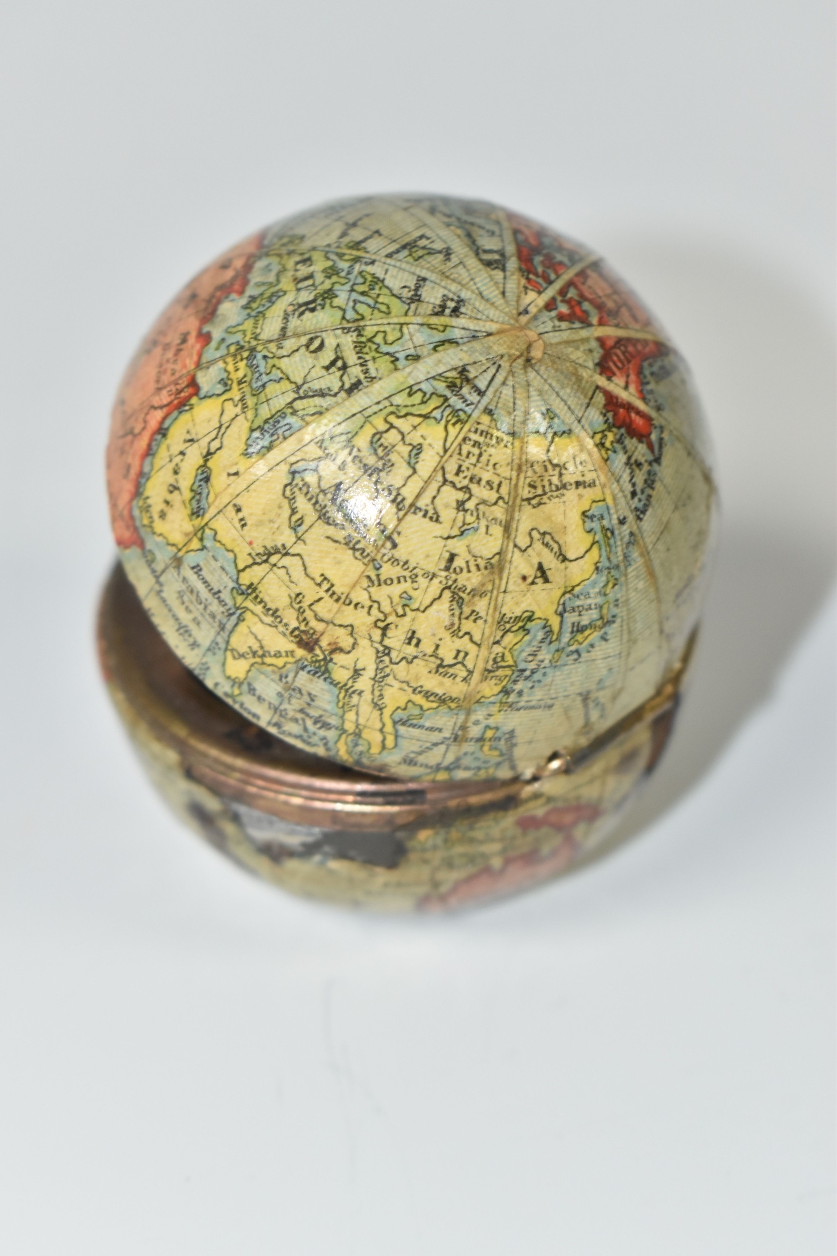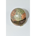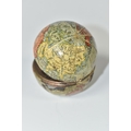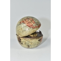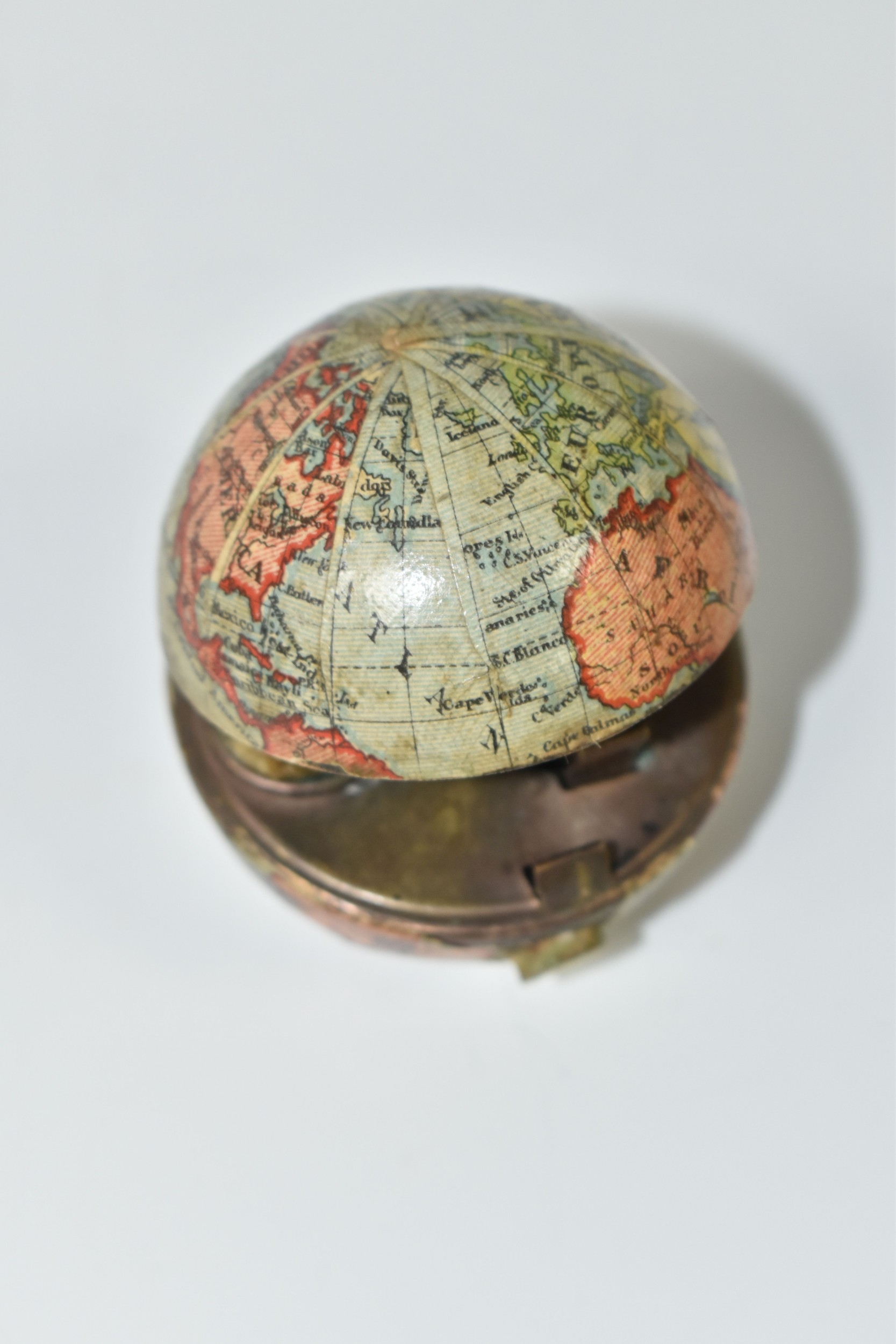 NOVELTY ANTIQUE GLOBE TRAVEL INKWELL, circa approximately 1900, featuring a global metal base and hinged lid covered in a paper map of the world, inside a sprung lid with concealed button at the front to reveal a single glass ink well, next to this is a bristle brush nib wipe, (1), (Condition Report: age related wear in places but overall ok)