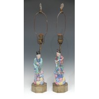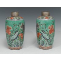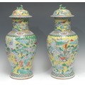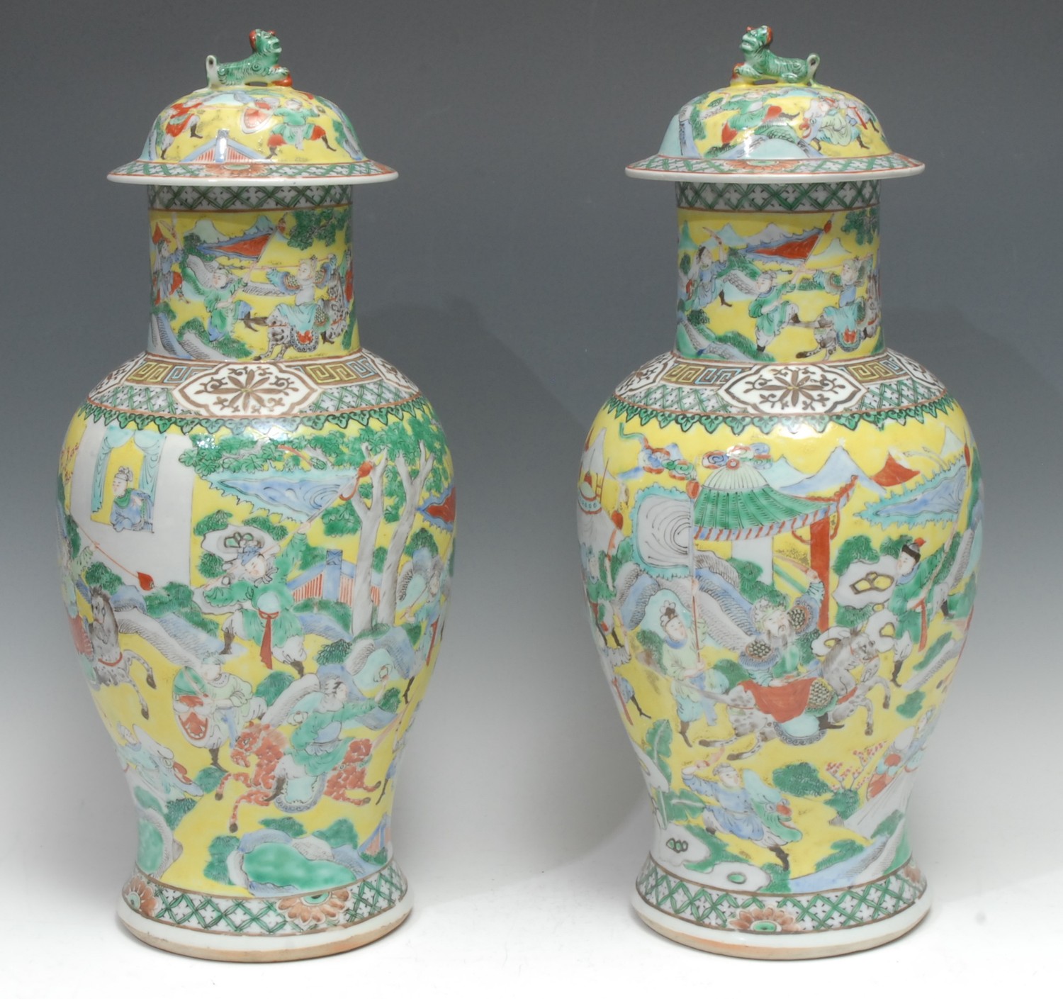 A pair of Chinese ovoid vases, profusely painted in polychrome with processions, on a yellow ground, domed covers with temple lion finials, 48cm high, 19th century