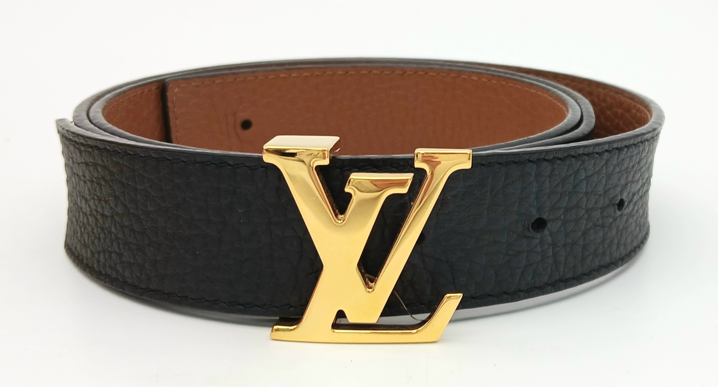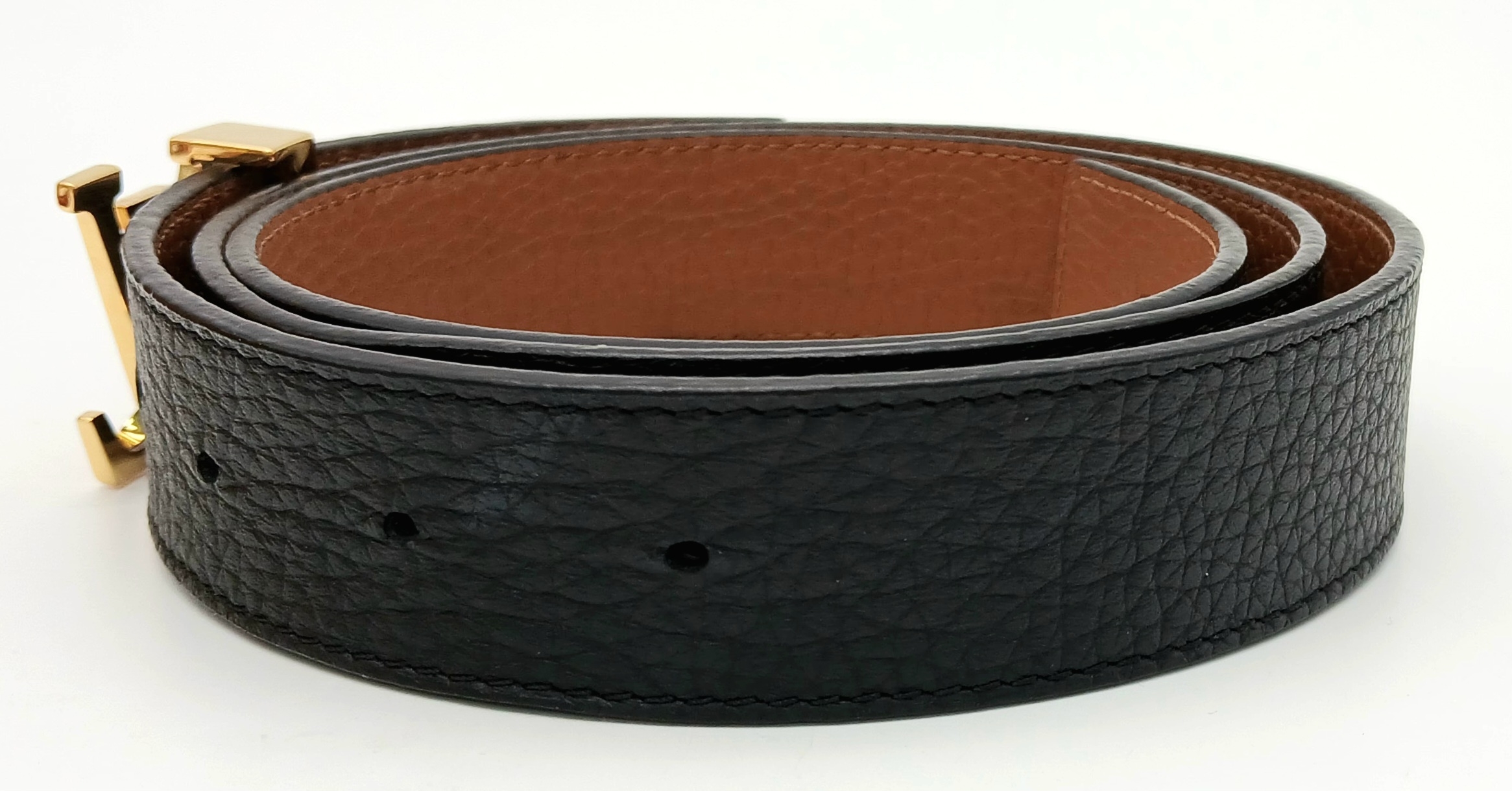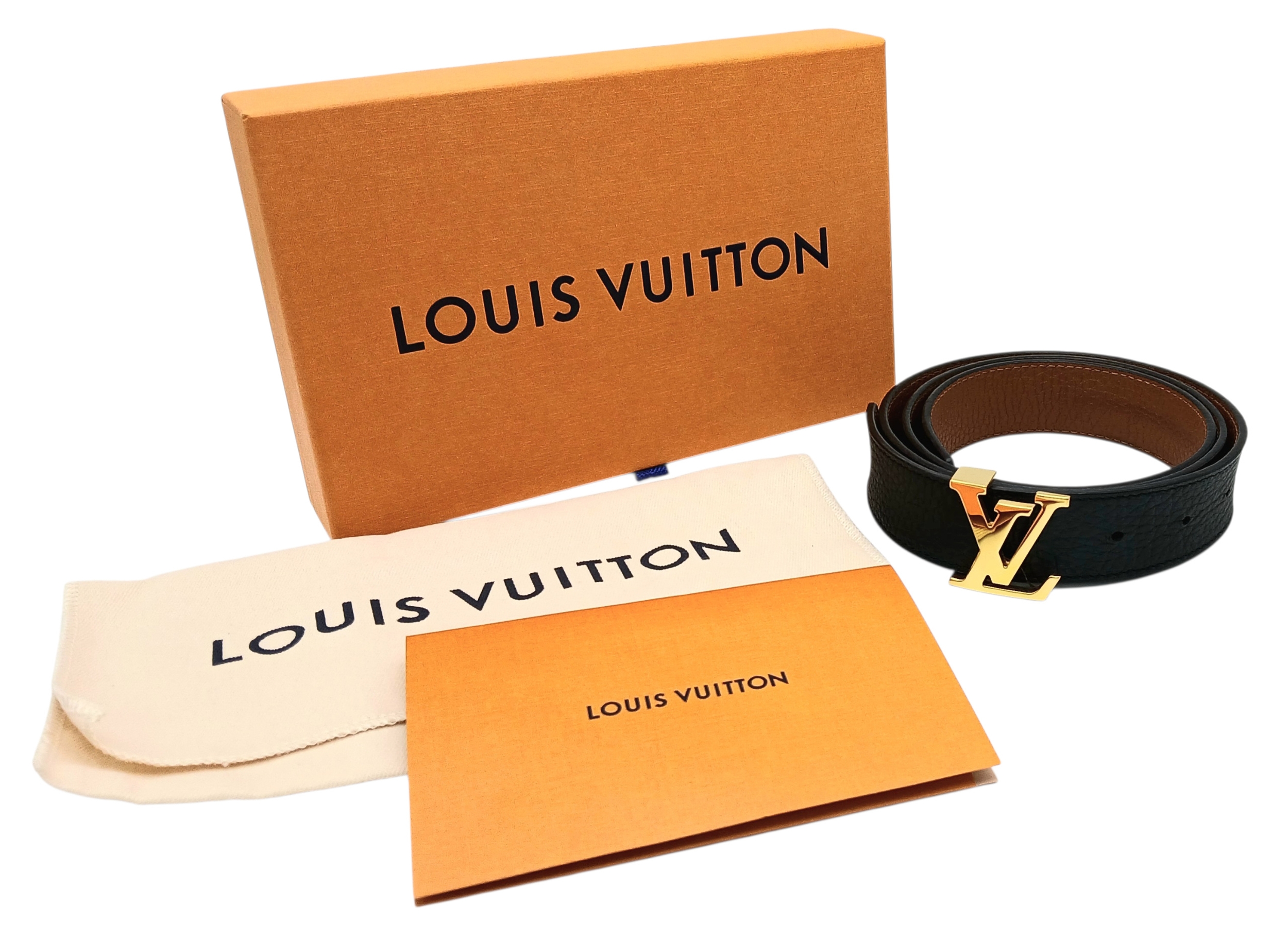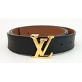 A Louis Vuitton Black Leather LV Initials Belt. Some tiny stains to the leather but in very good condition overall. Approx 106cm length. an original box, dust cover and purchased receipts. Please see photos or request a condition report. STK024634
