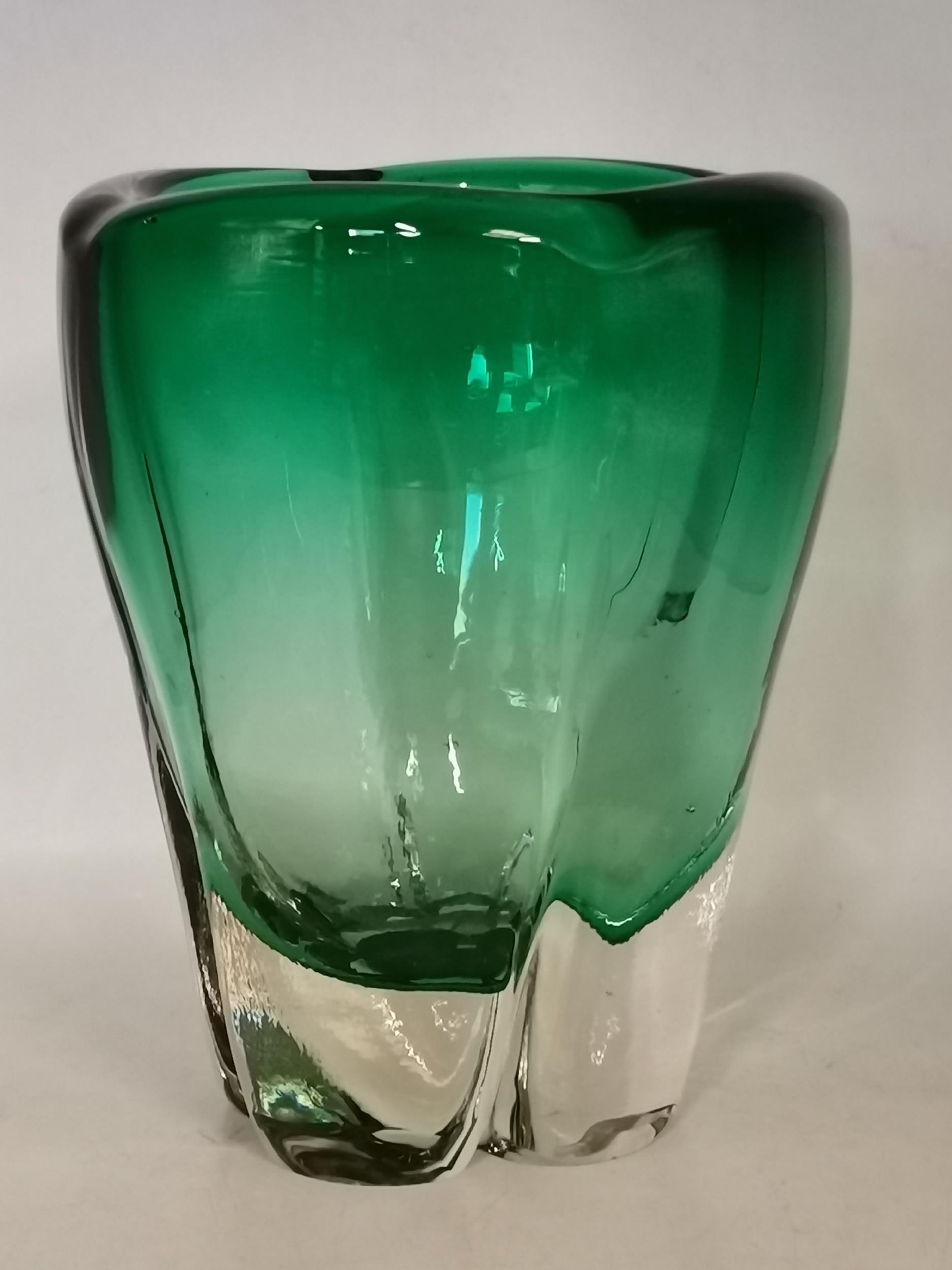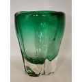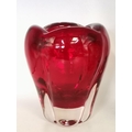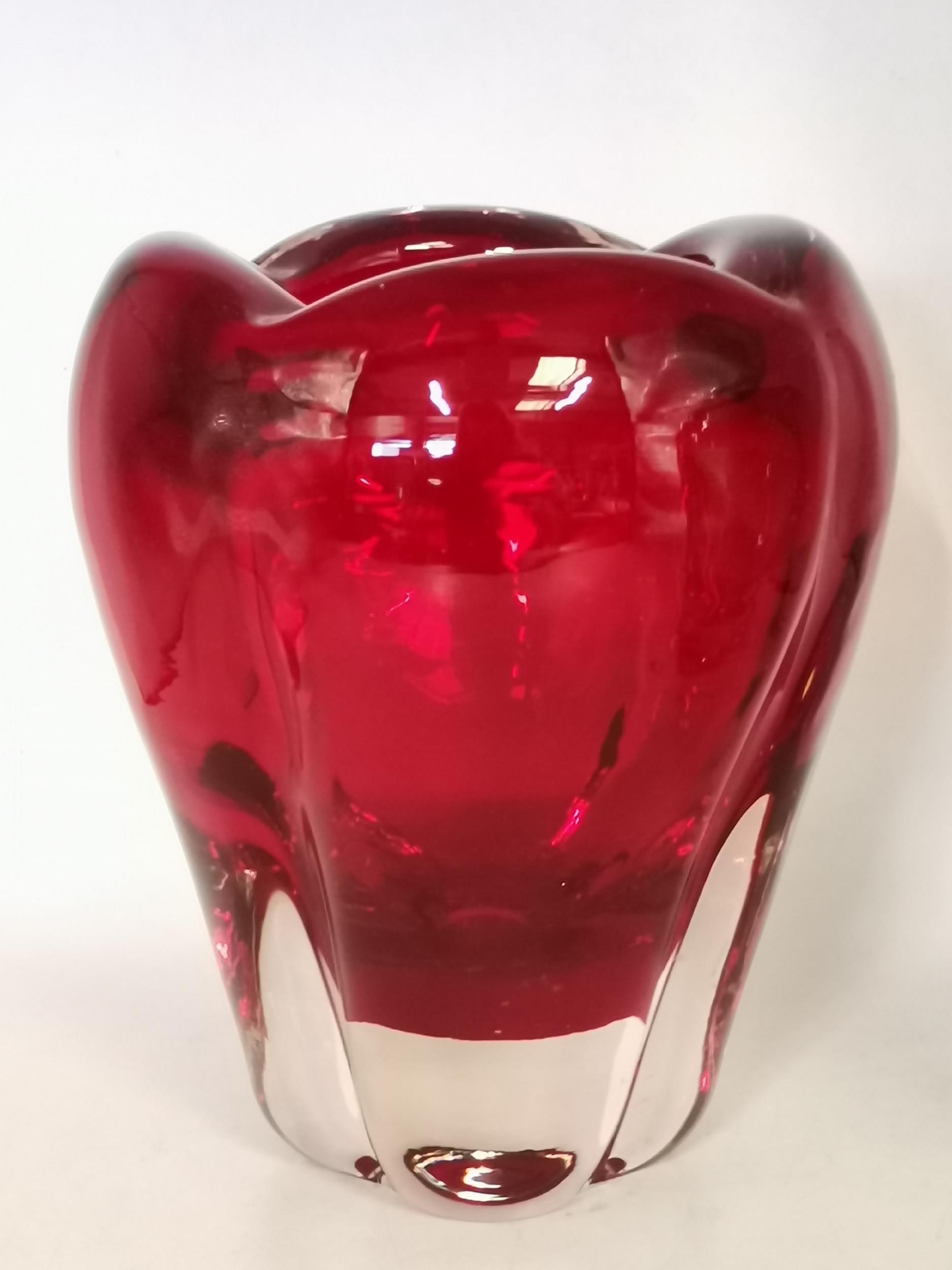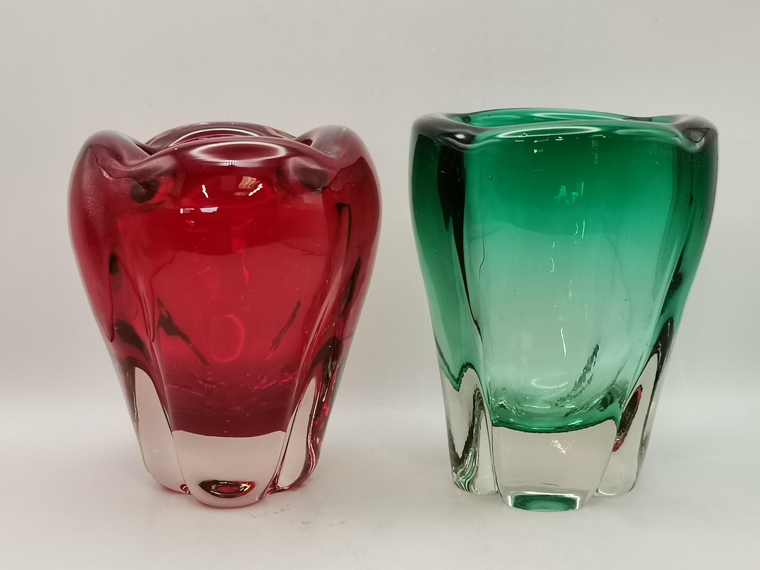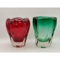 William Wilson for Whitefriars, a 'Molar' red glass vase, of lobed and tapering section; together with another similar green tinted example. (2) First 14.5cm high